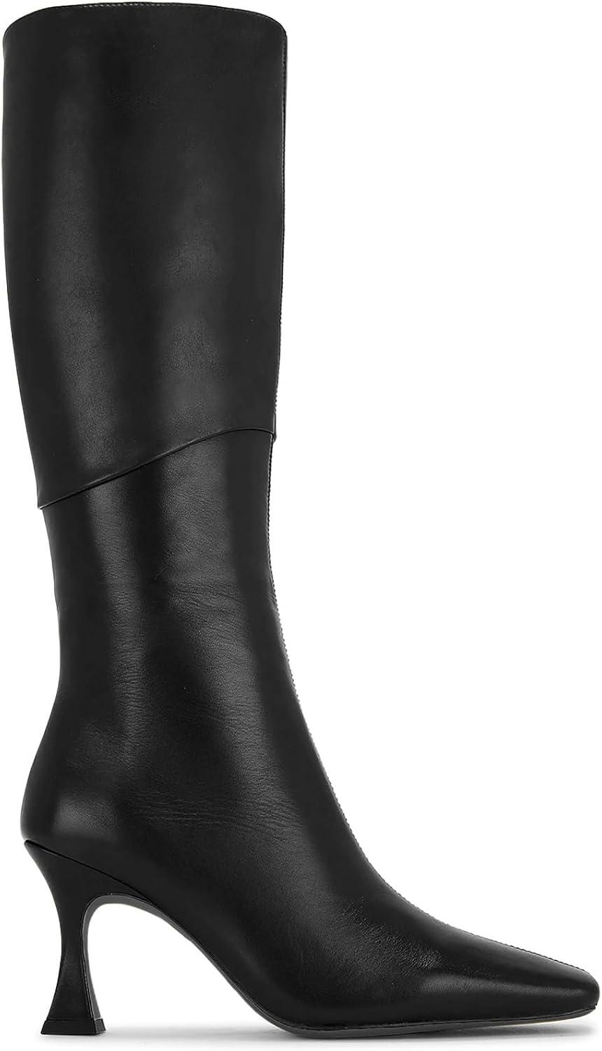 Coutgo Womens Kitten Heel Knee High Boots Wide Calf Square Toe Leather Boot Shoes with Zipper(Black)