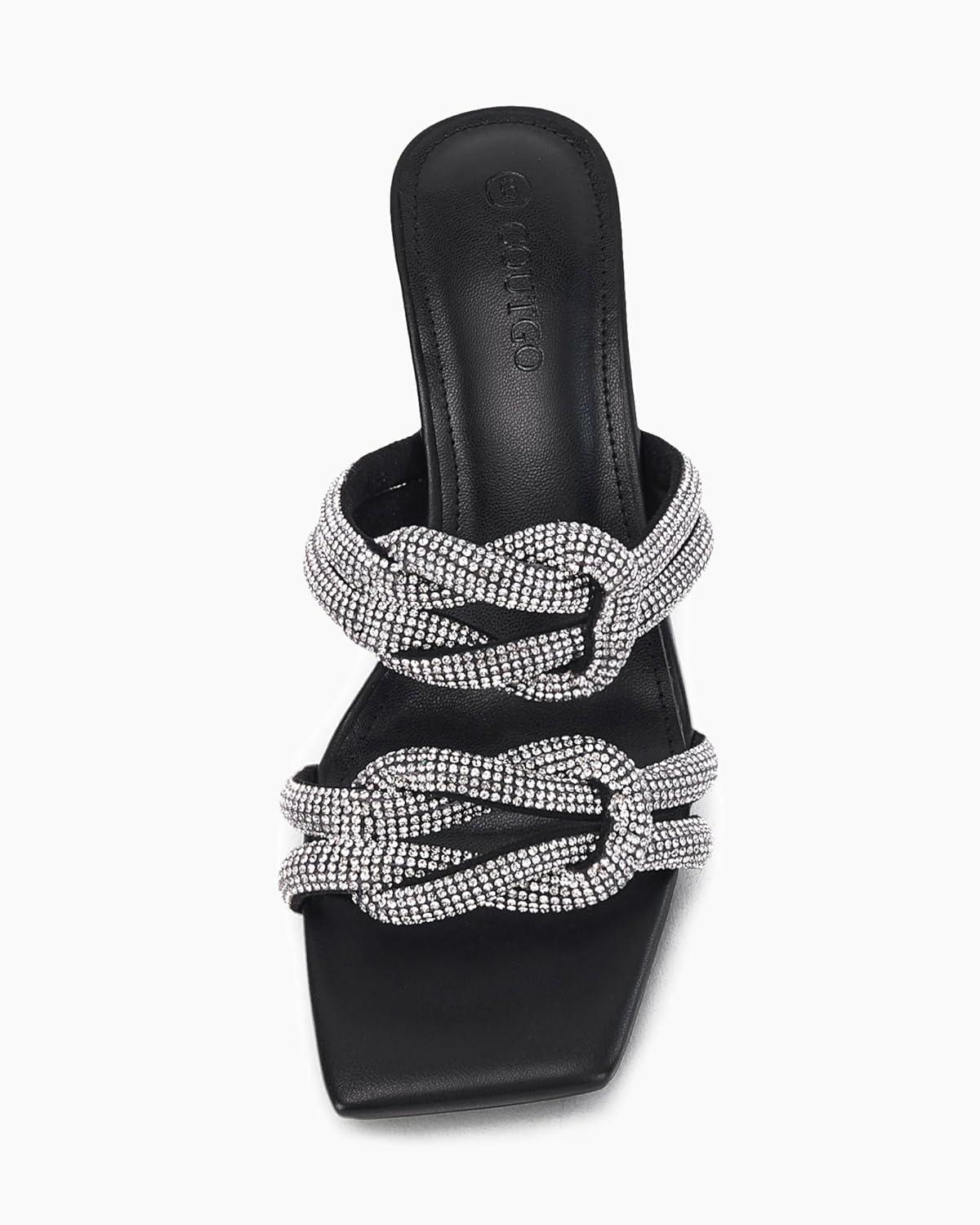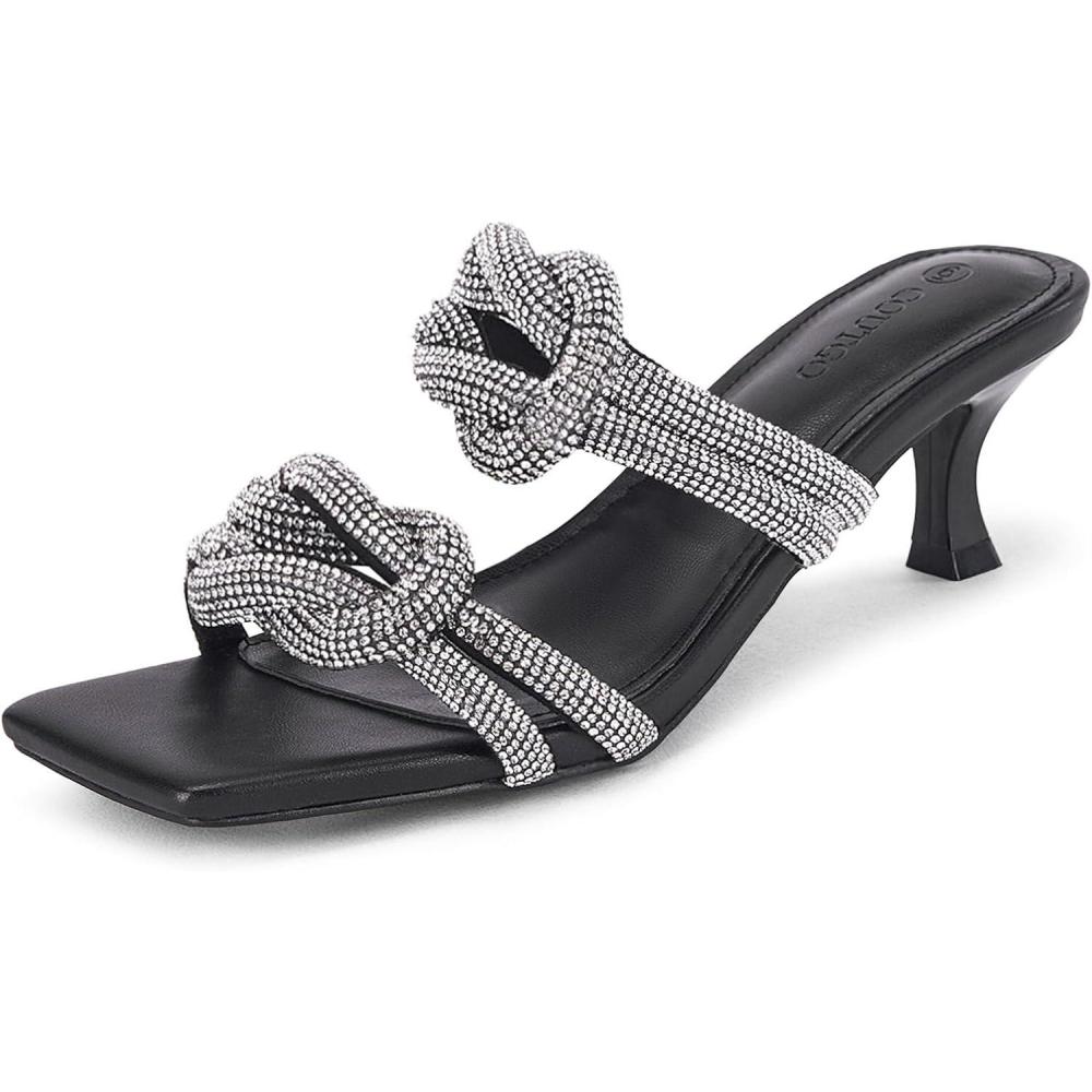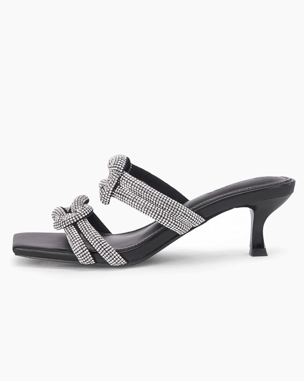 Coutgo Womens Kitten Heel Sandals Mules Rhinestone Slip on Low Heels Open Square Toe Dressy Summer Wedding Party Shoes(Black)
