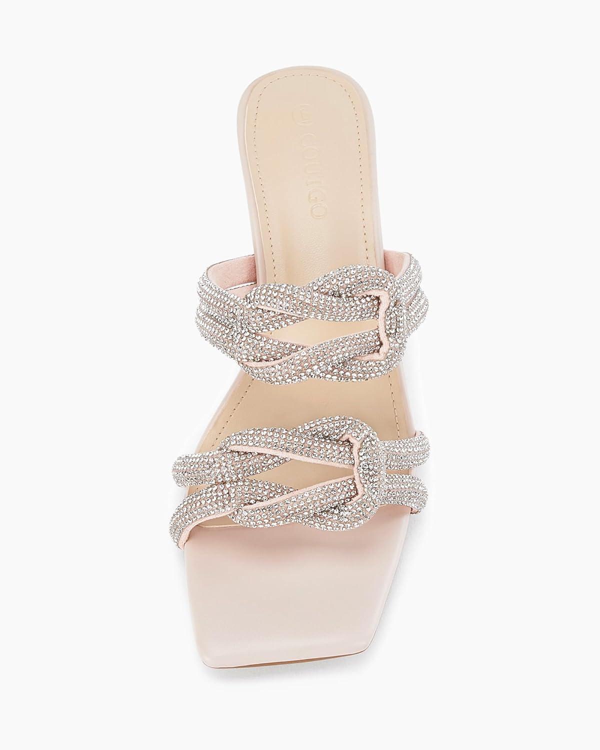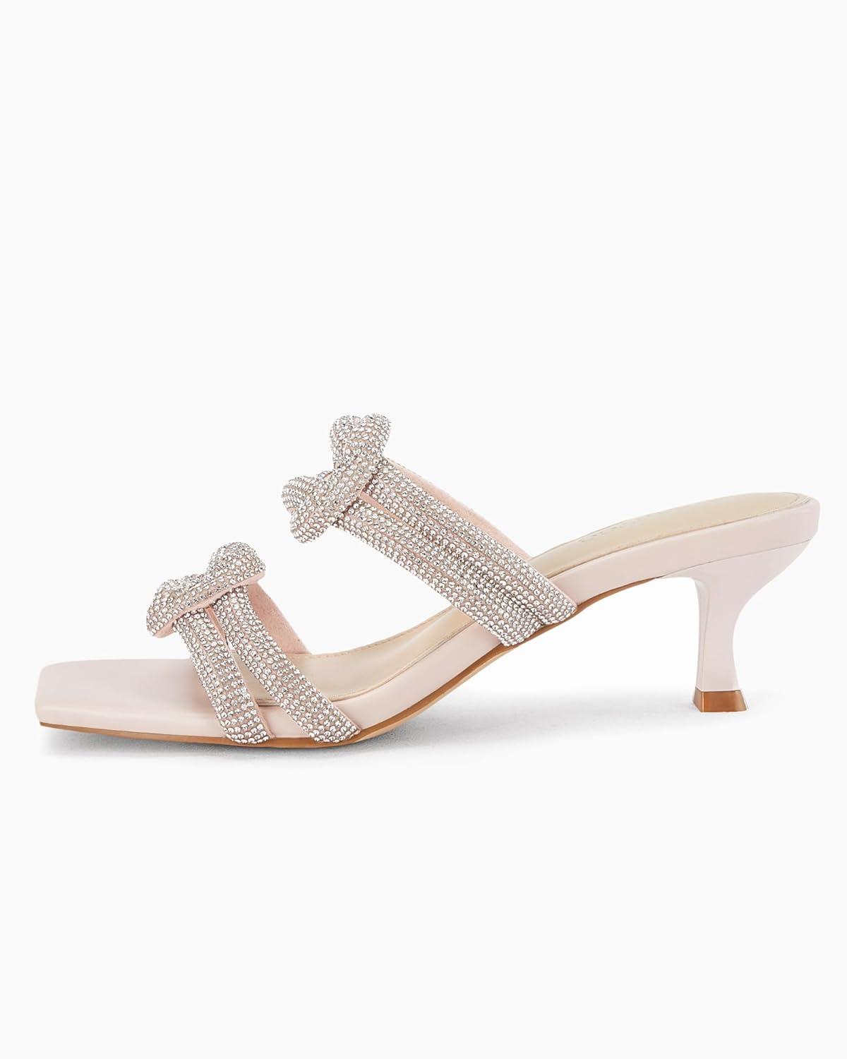 Coutgo Womens Kitten Heel Sandals Mules Rhinestone Slip on Low Heels Open Square Toe Dressy Summer Wedding Party Shoes(Nude)