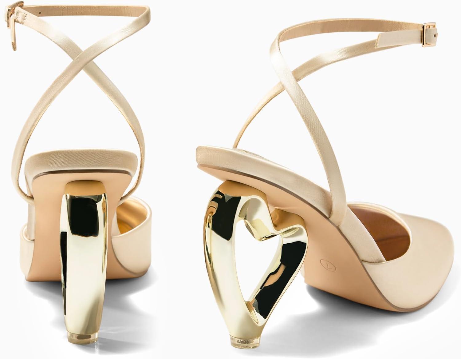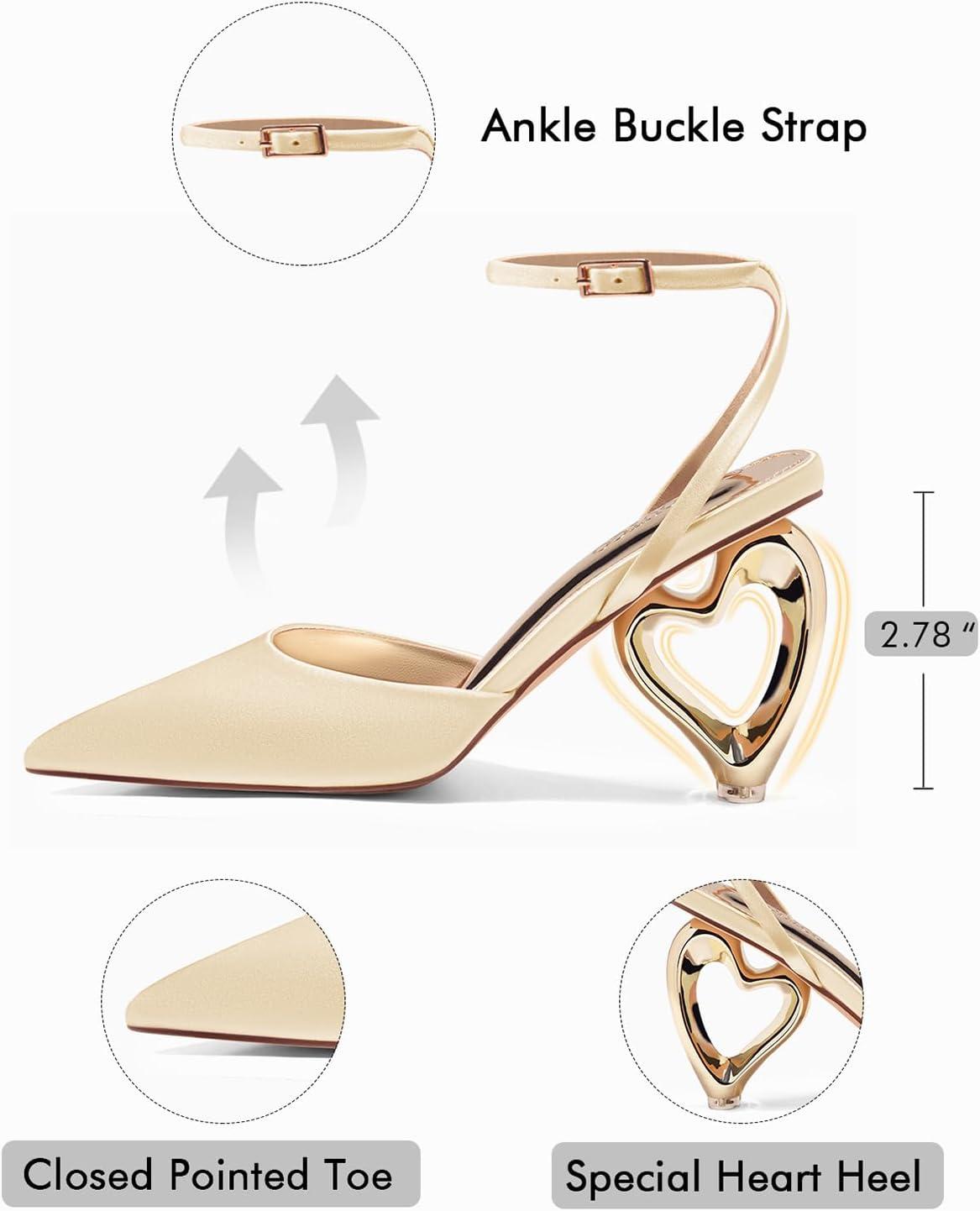 Coutgo Womens Kitten Heels Closed Pointed Toe Heart Heel Ankle Strap Satin Pumps Wedding Prom Dress Shoes(Champagne Gold)