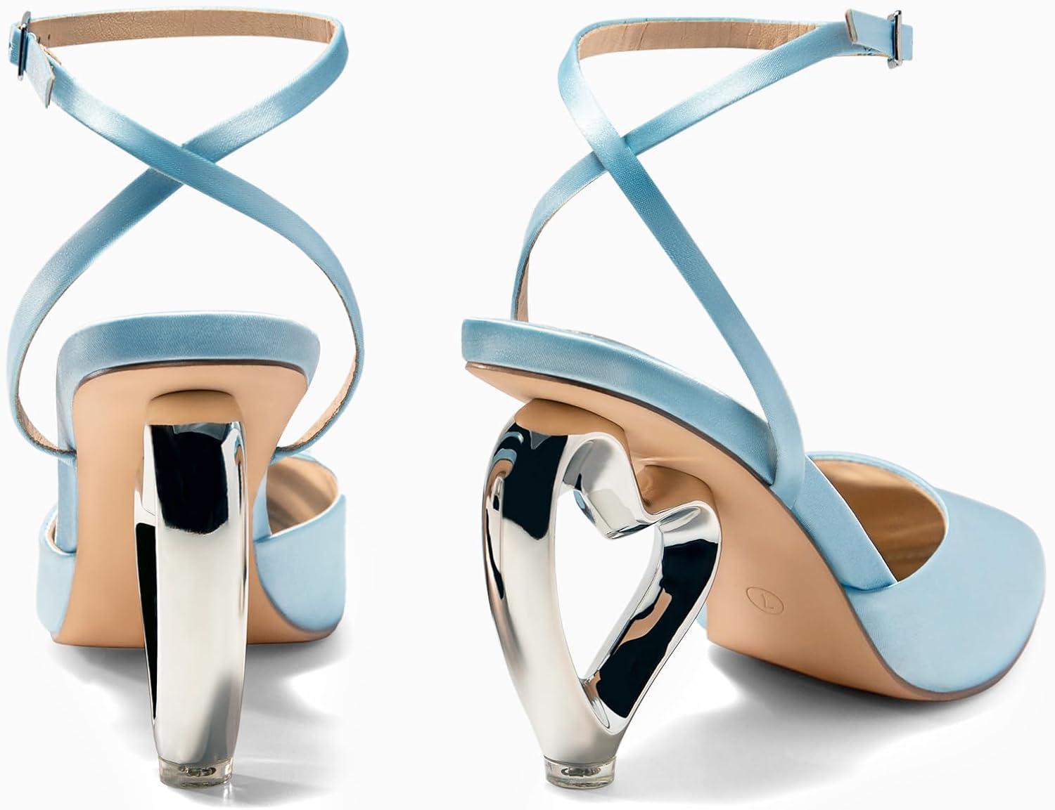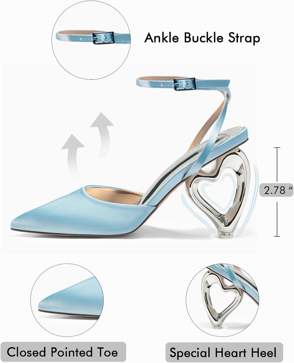 Coutgo Womens Kitten Heels Closed Pointed Toe Heart Heel Ankle Strap Satin Pumps Wedding Prom Dress Shoes(Light Blue)