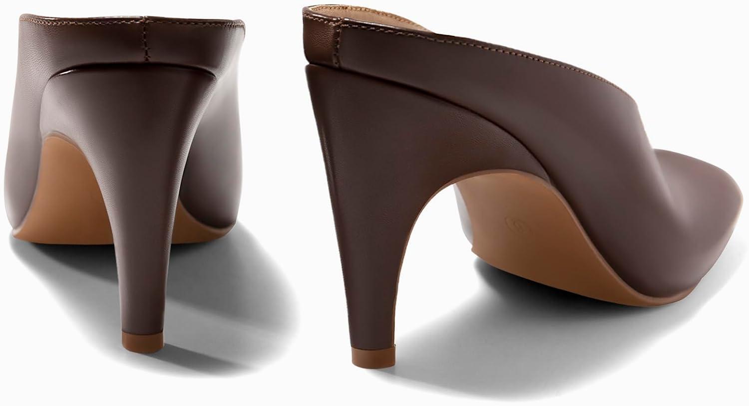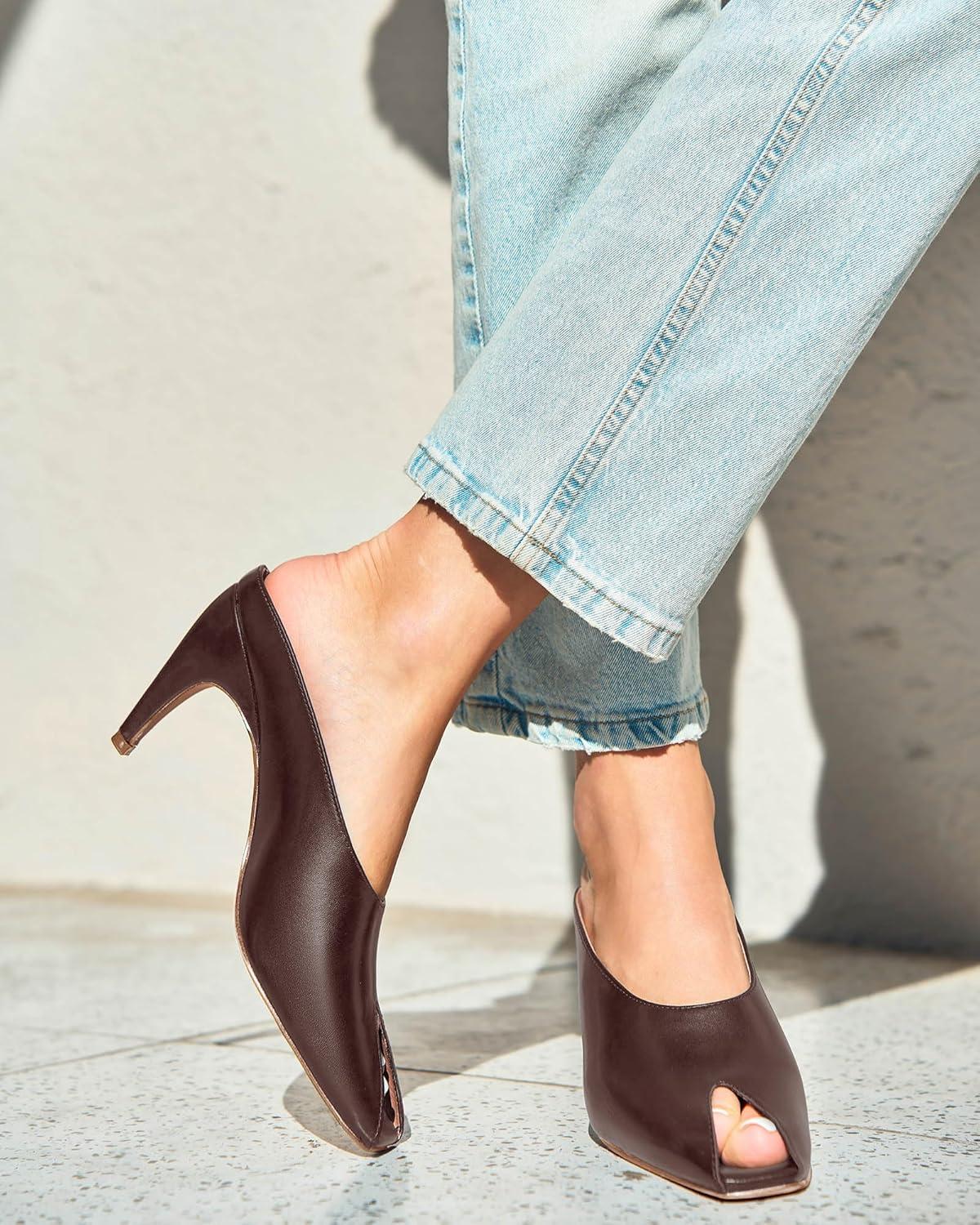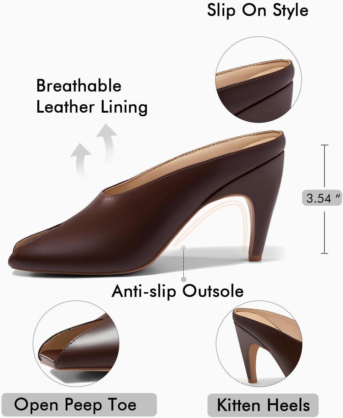 Coutgo Womens Kitten Heels Mules Open Peep Toe Slide Sandals Slip On Summer Dress Shoes(Coffee)