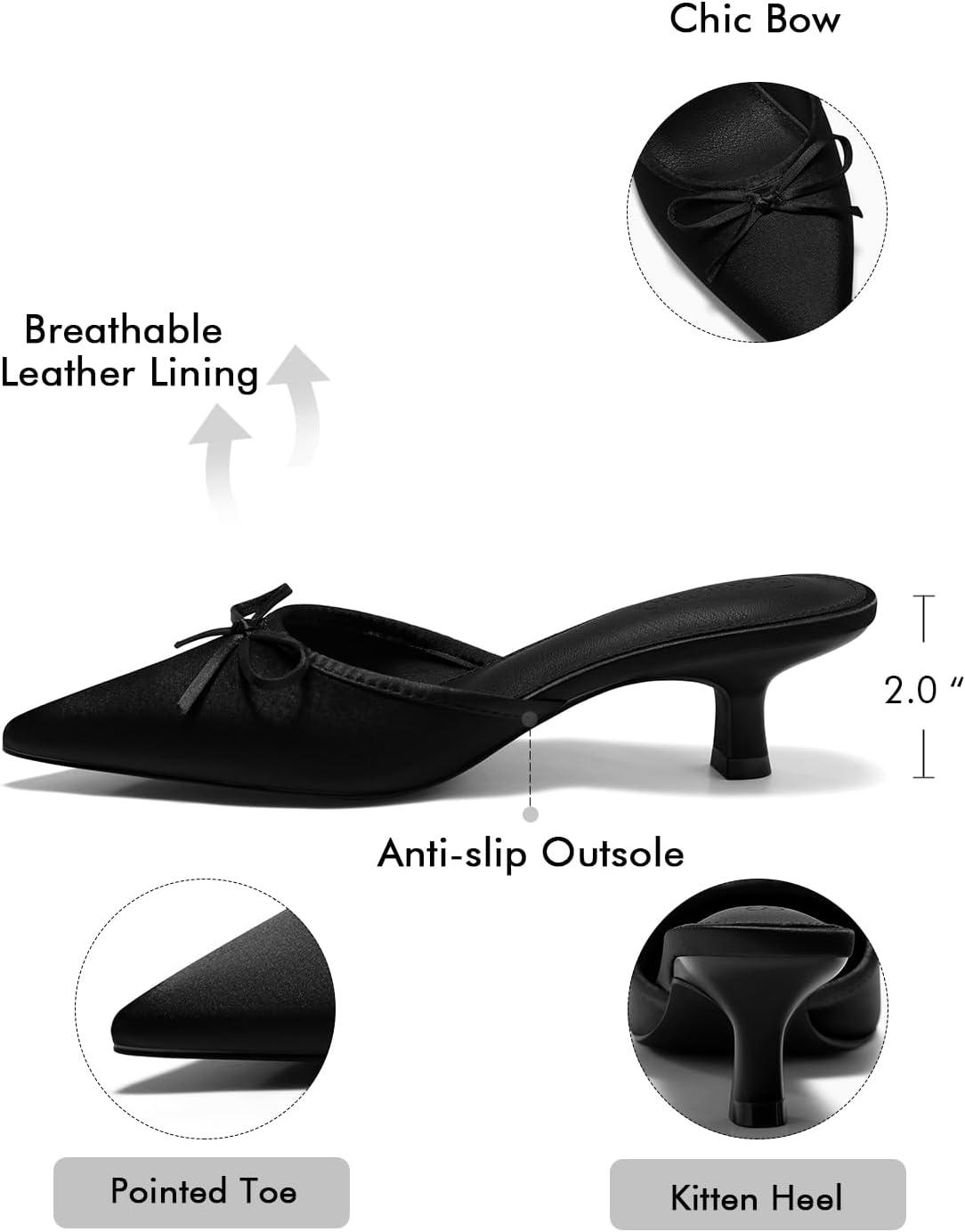 Coutgo Womens Kitten Heels Mules with Bow Satin Slip on Pumps Closed Pointed Toe Dress Wedding Party Shoes(Black)