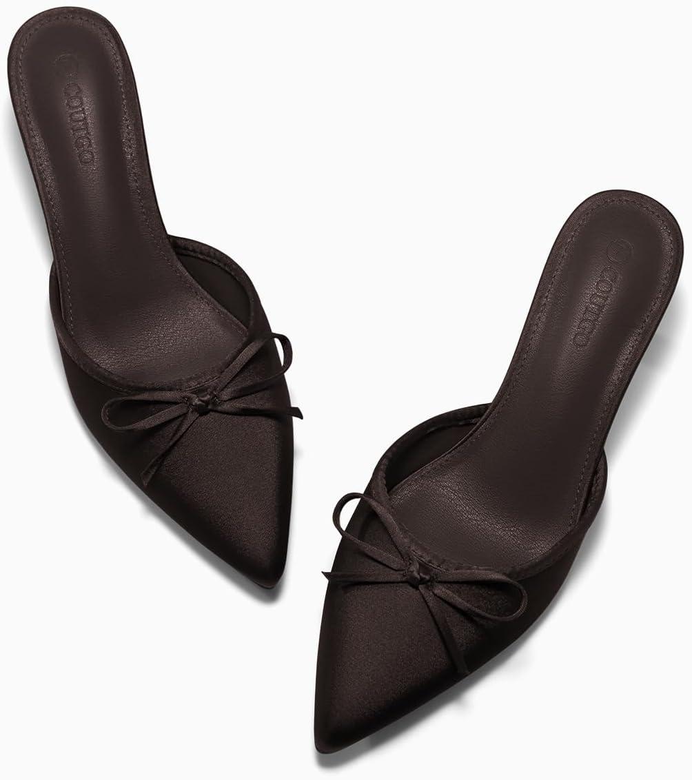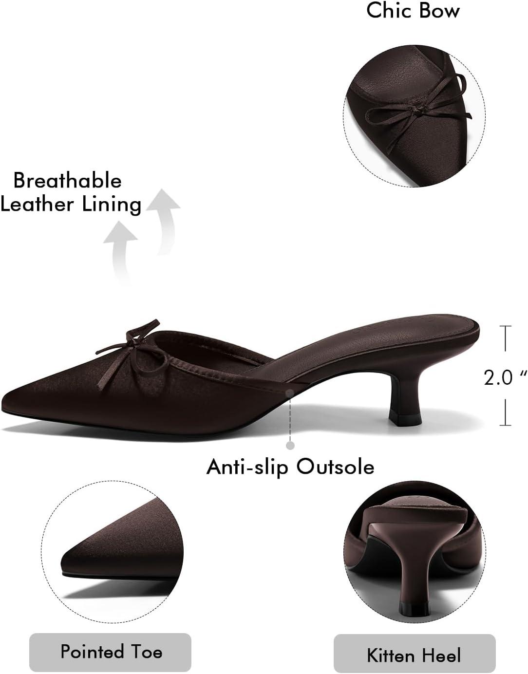 Coutgo Womens Kitten Heels Mules with Bow Satin Slip on Pumps Closed Pointed Toe Dress Wedding Party Shoes(Chocolate)
