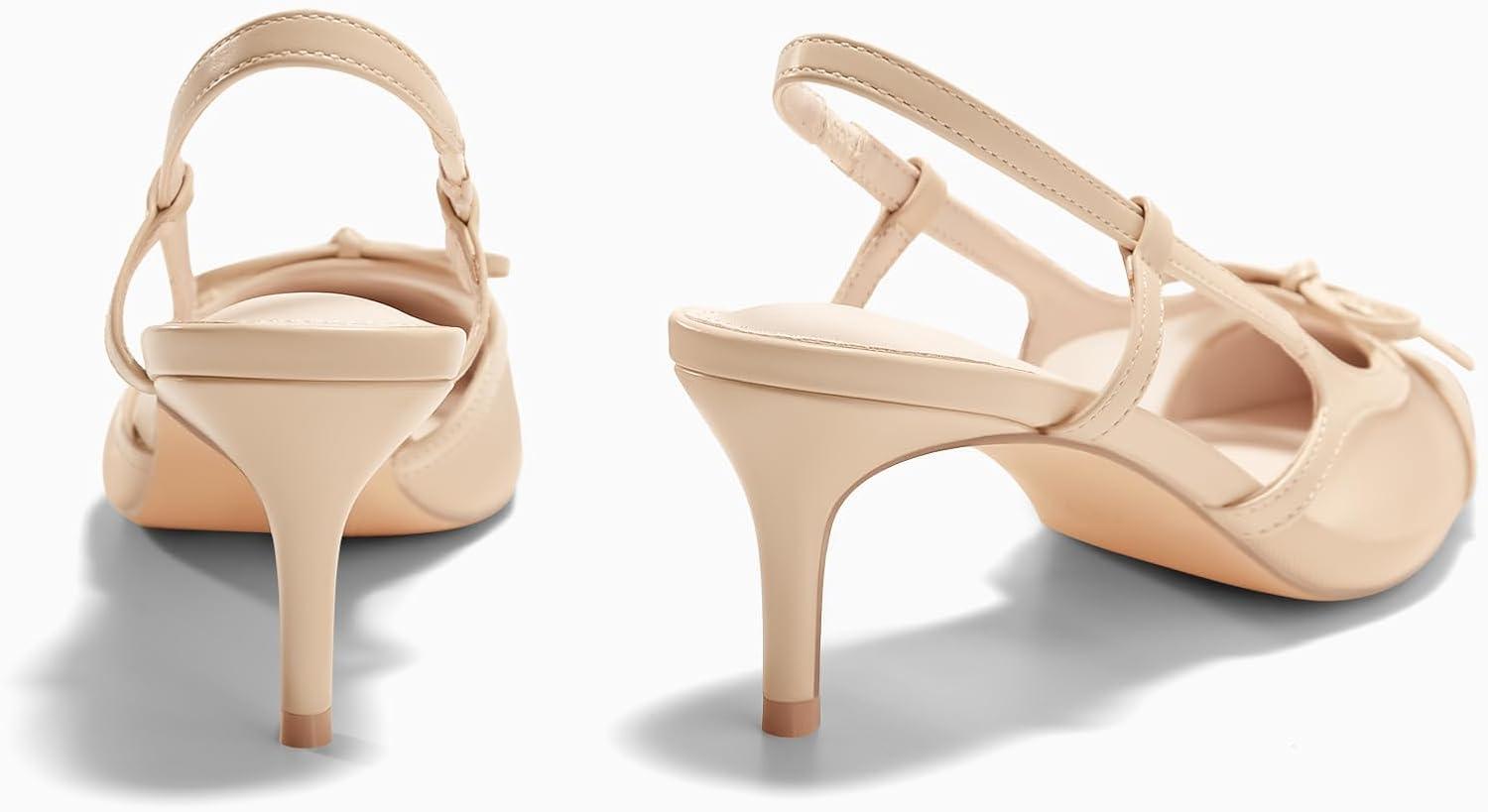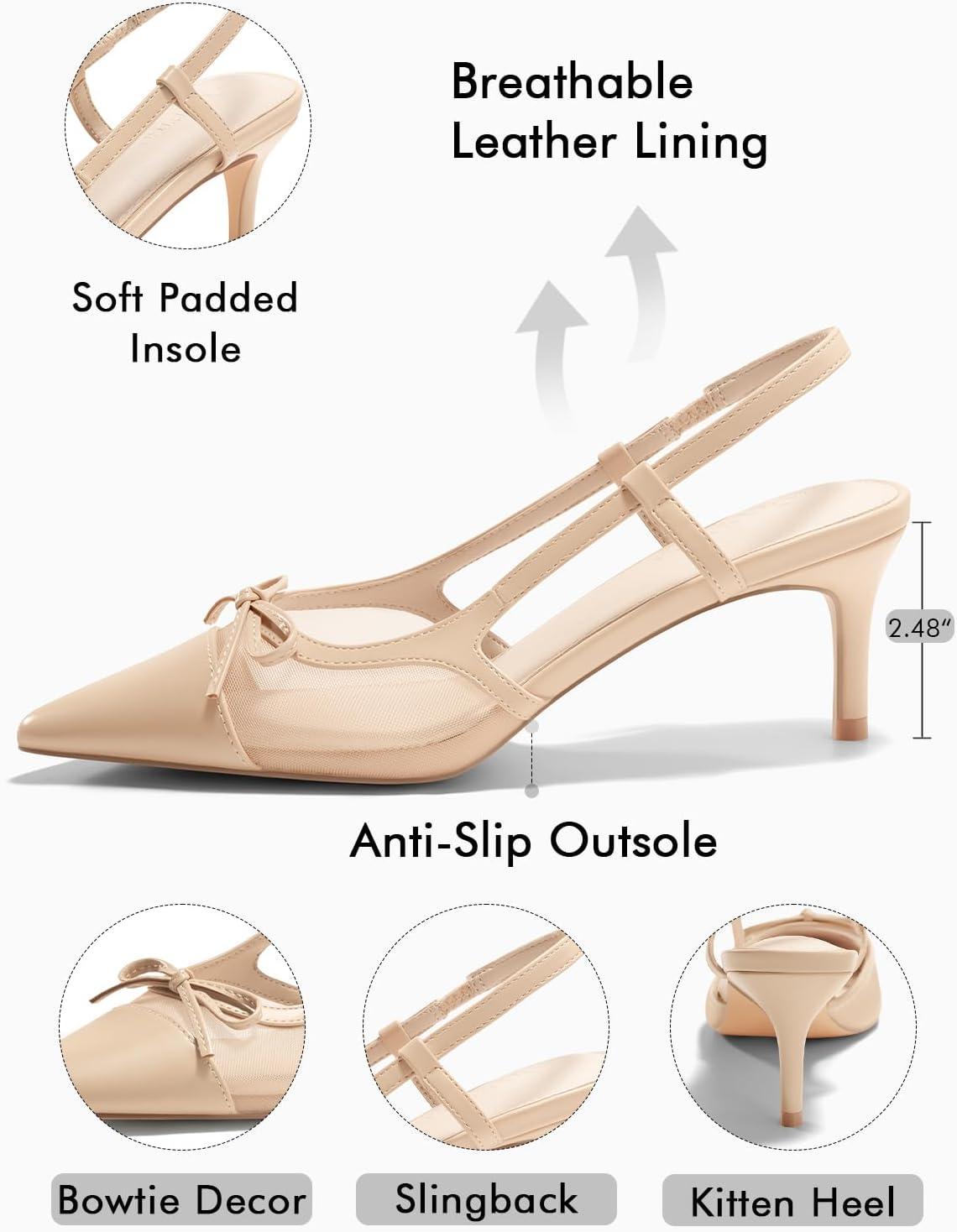 Coutgo Womens Kitten Heels Slingback Mesh Pumps Bow Tie Closed Pointed Toe Two Tone Slip on Work Dress Shoes(Light Khaki)