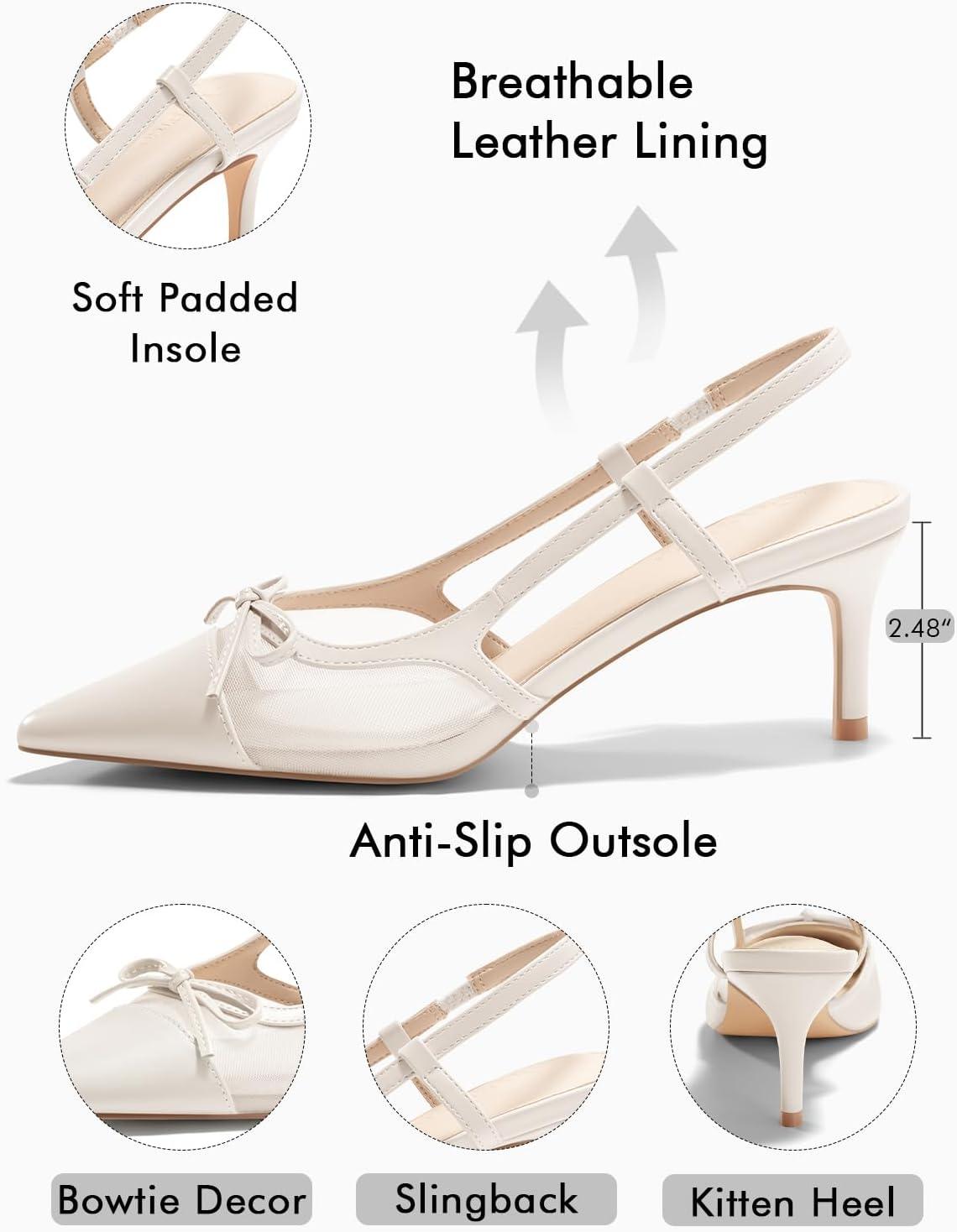 Coutgo Womens Kitten Heels Slingback Mesh Pumps Bow Tie Closed Pointed Toe Two Tone Slip on Work Dress Shoes(White)