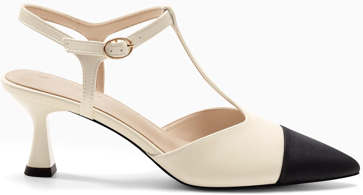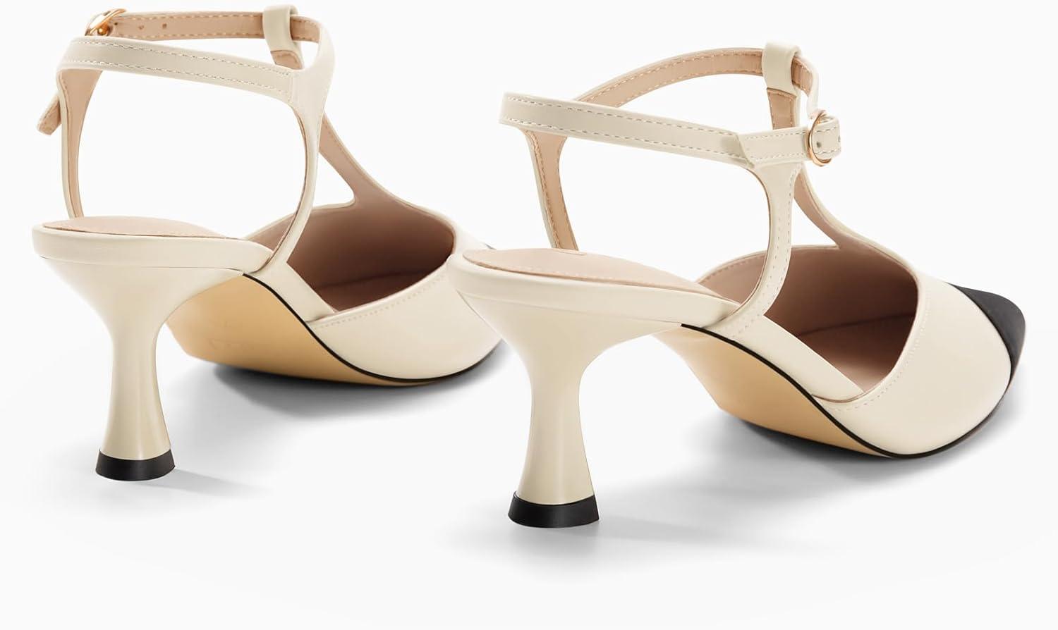 Coutgo Womens Kitten Heels Slingback Pumps Closed Pointed Toe Two Tone Ankle T Strap Office Dress Shoes(Beige)