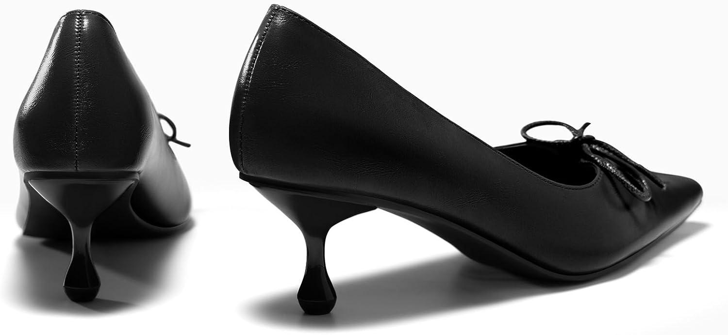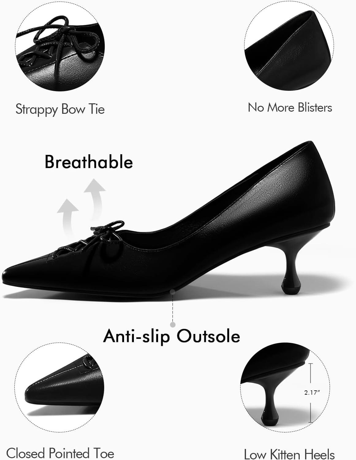 Coutgo Womens Kitten Low Heels Strappy Bow Closed Pointed Toe Slip On Dress Pumps Shoes(Black)