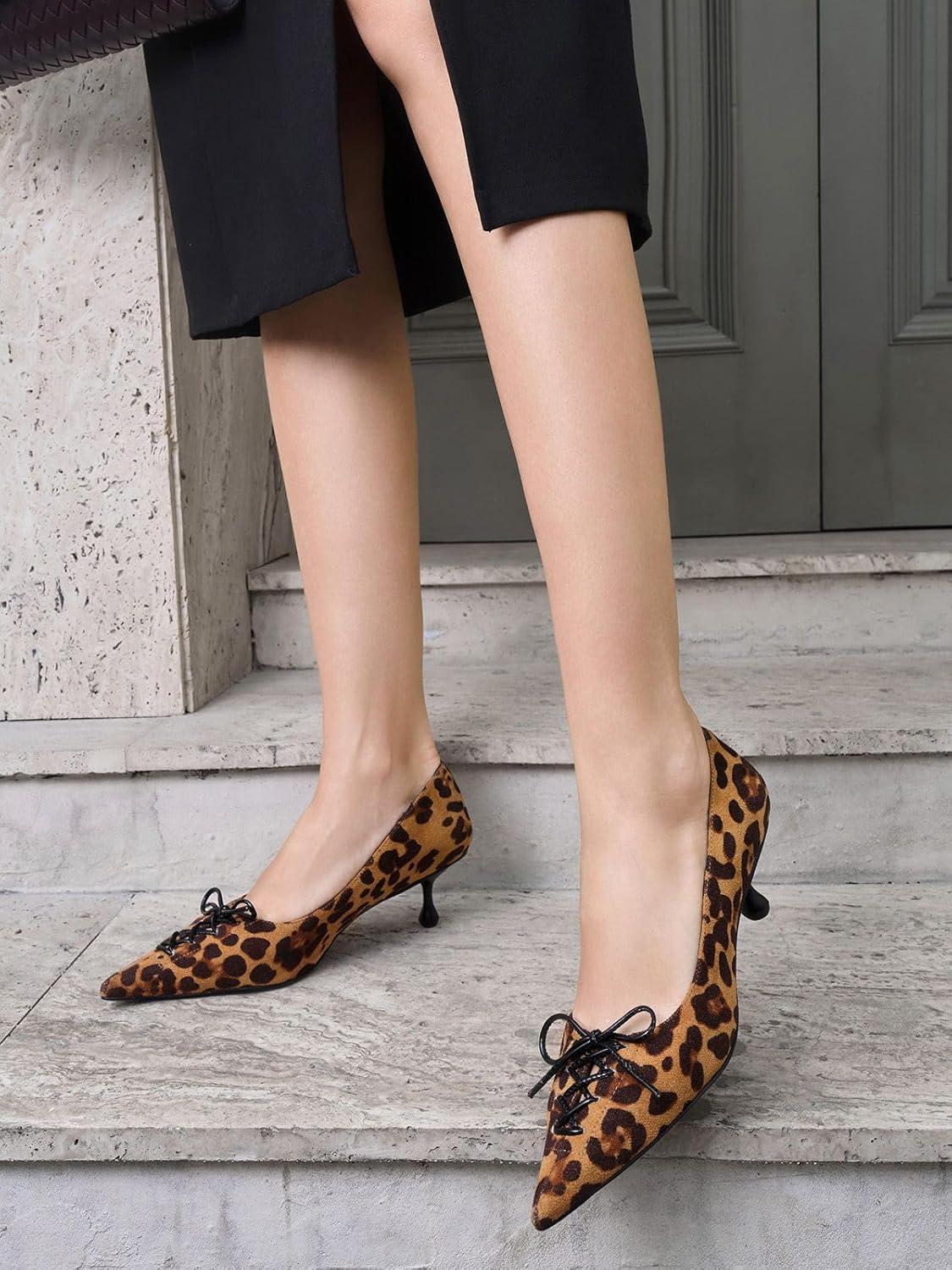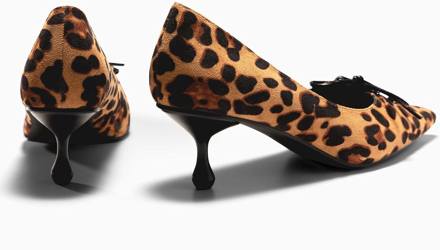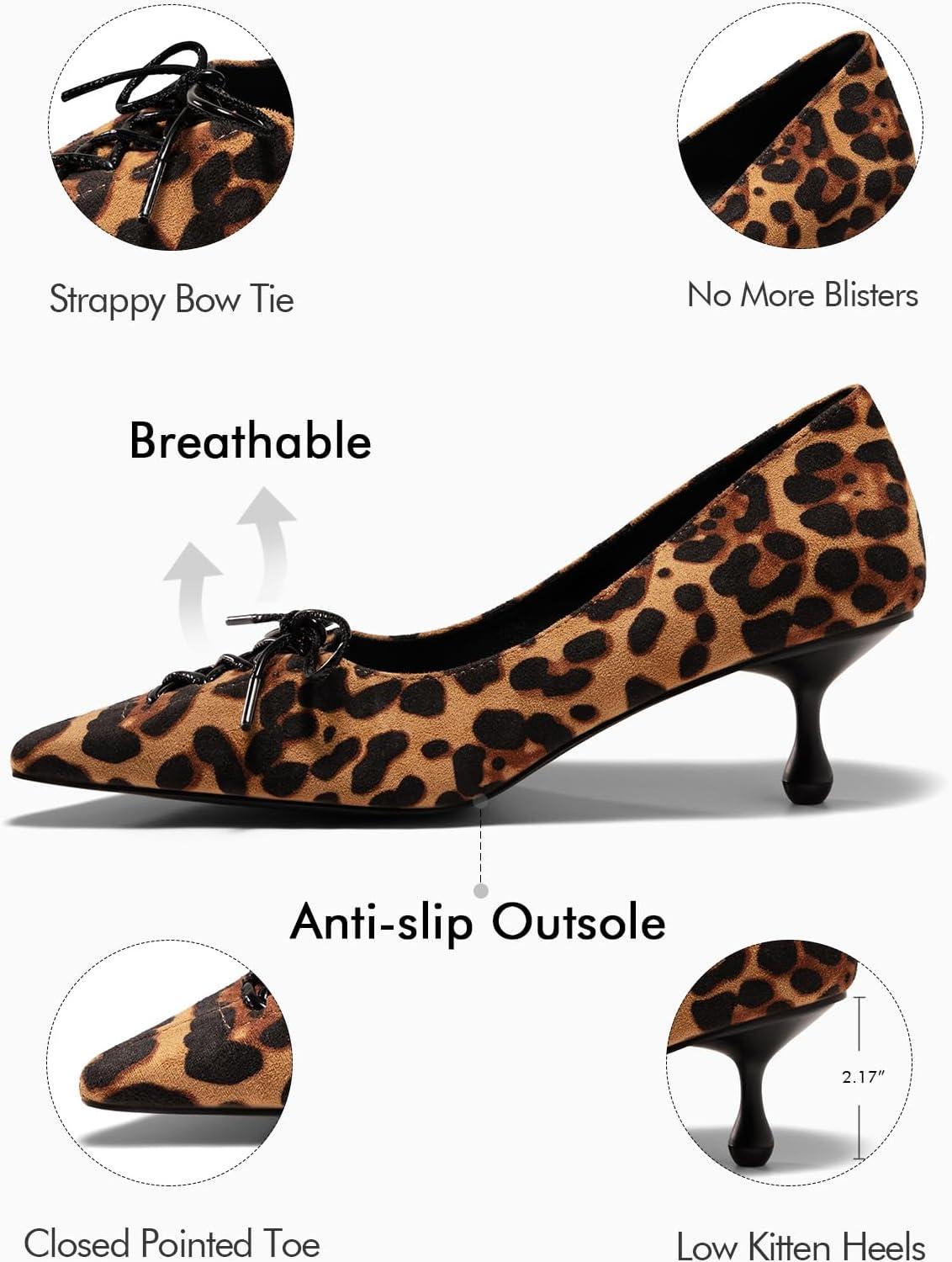 Coutgo Womens Kitten Low Heels Strappy Bow Closed Pointed Toe Slip On Dress Pumps Shoes(Leopard Color)