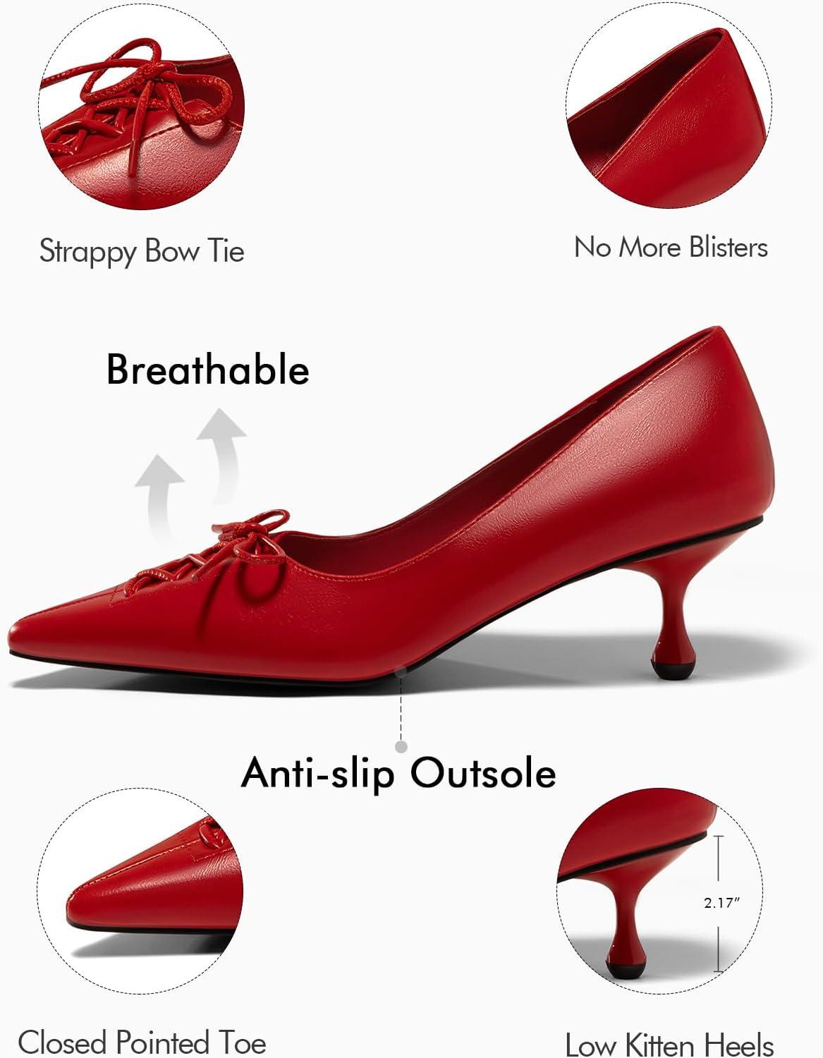 Coutgo Womens Kitten Low Heels Strappy Bow Closed Pointed Toe Slip On Dress Pumps Shoes(Red)