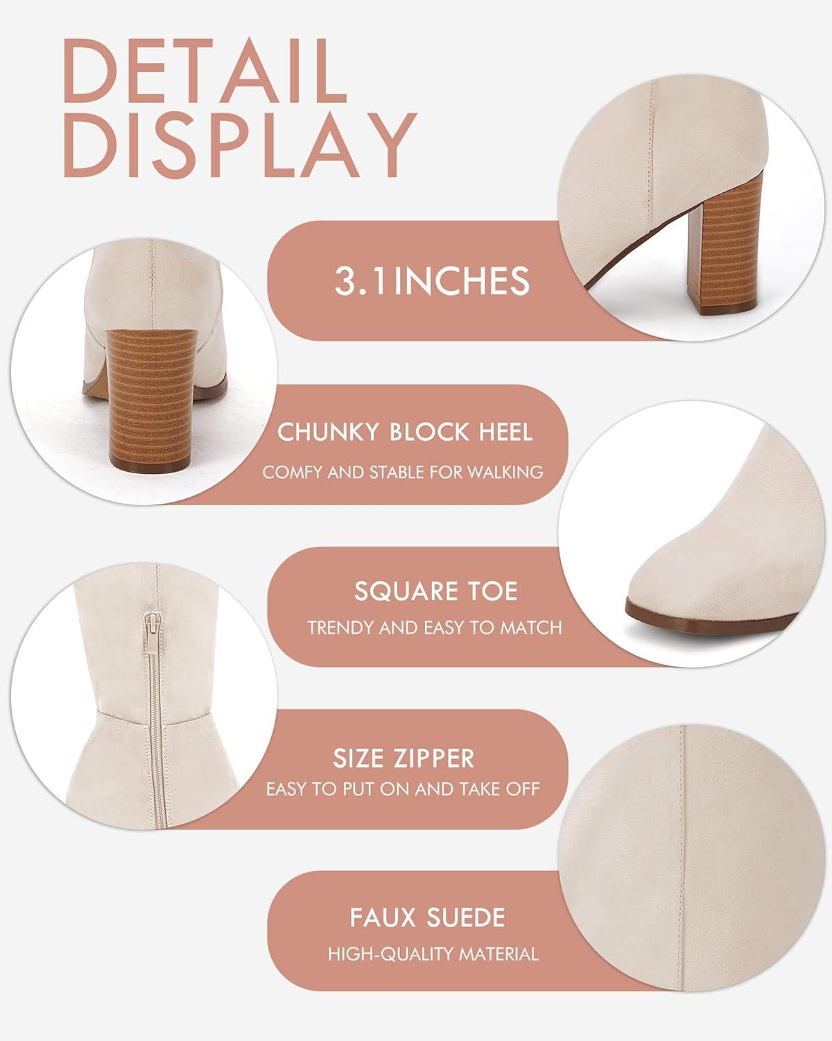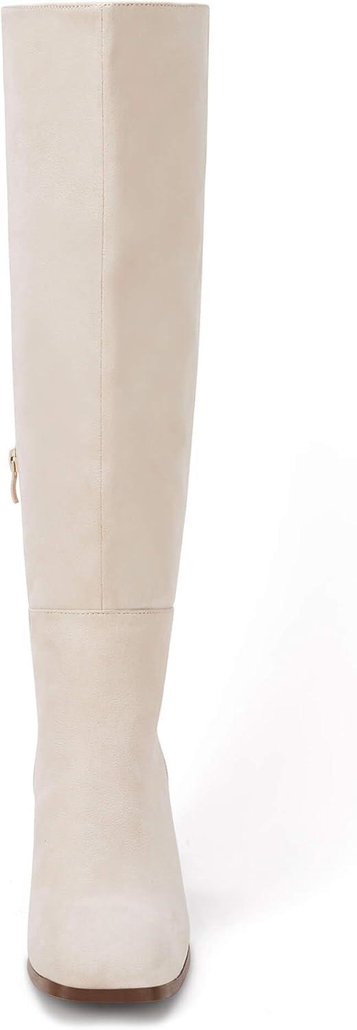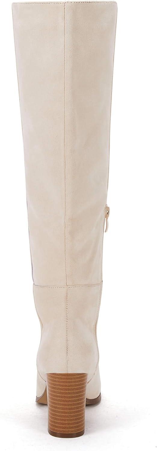 Coutgo Womens Knee High Boots Chunky Block Heels Square Toe Side Zipper Faux Suede Fall Winter Comfort Boot(Beige)
