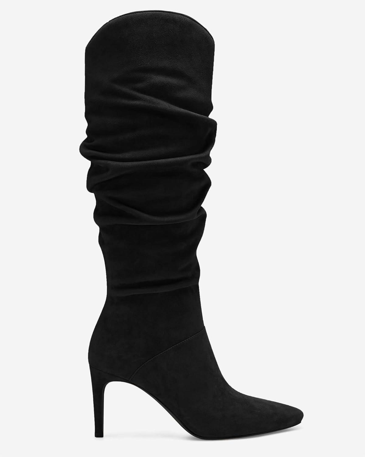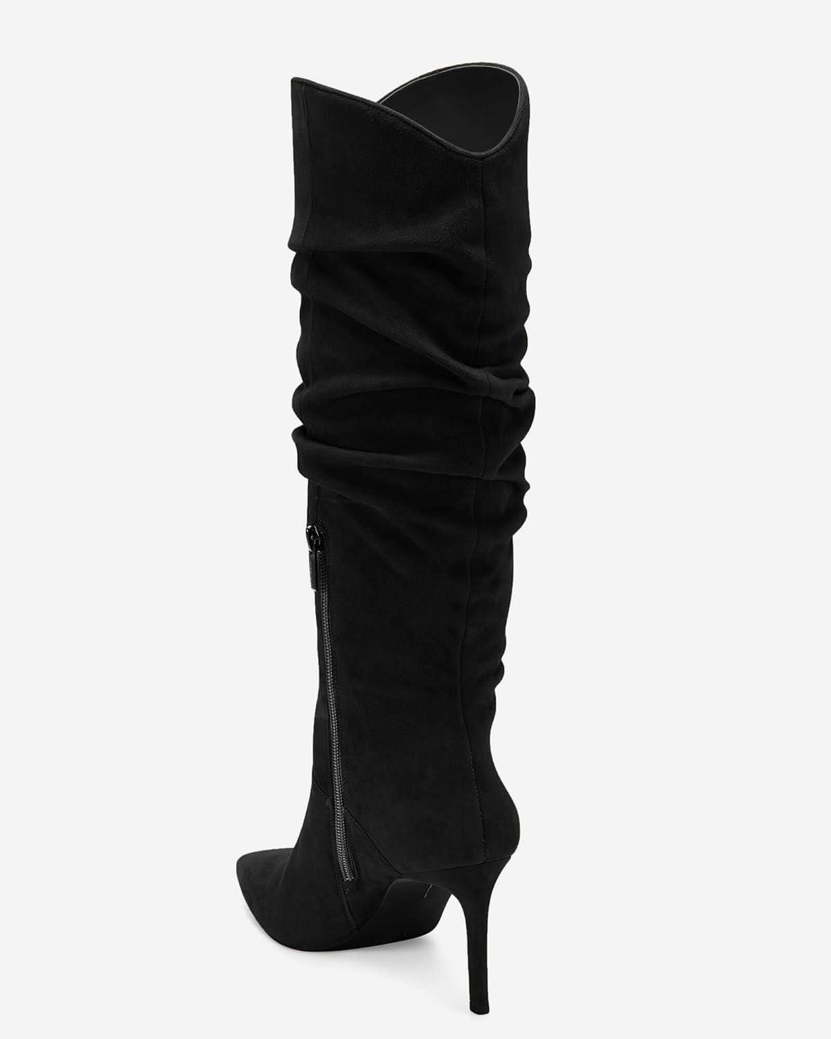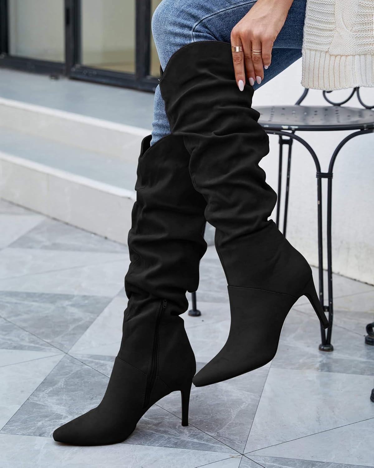 Coutgo Womens Knee High Boots Faux Suede Almond Toe Stiletto High Heel Slouchy Side Zipper Booties(Black)