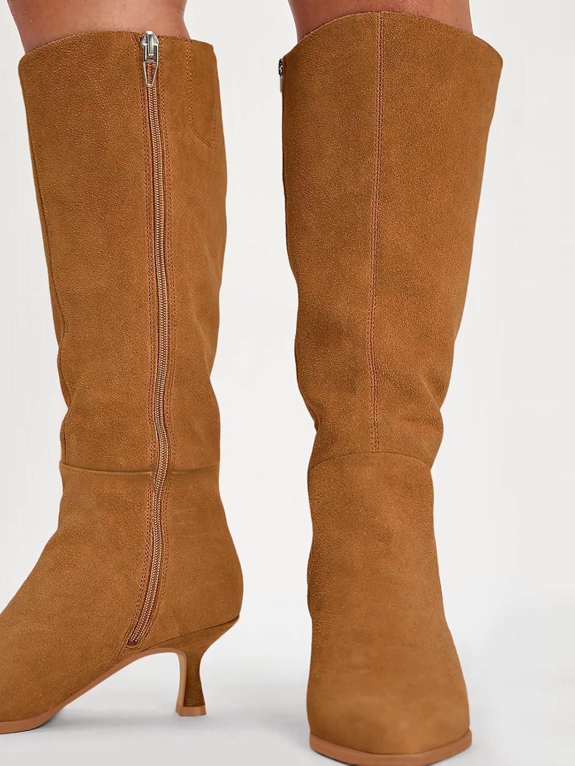 Coutgo Womens Knee High Boots Kitten Low Heel Pointed Toe Tall Boots Side Zipper Winter Dress Shoes(Brown)