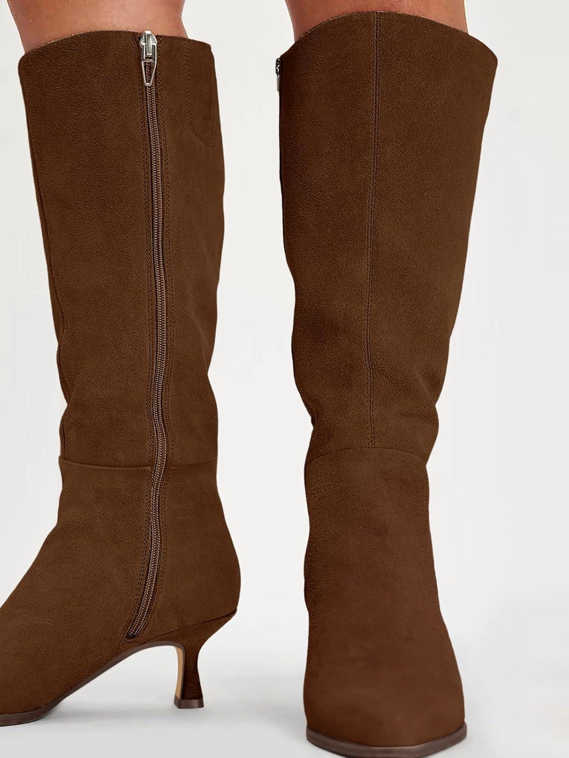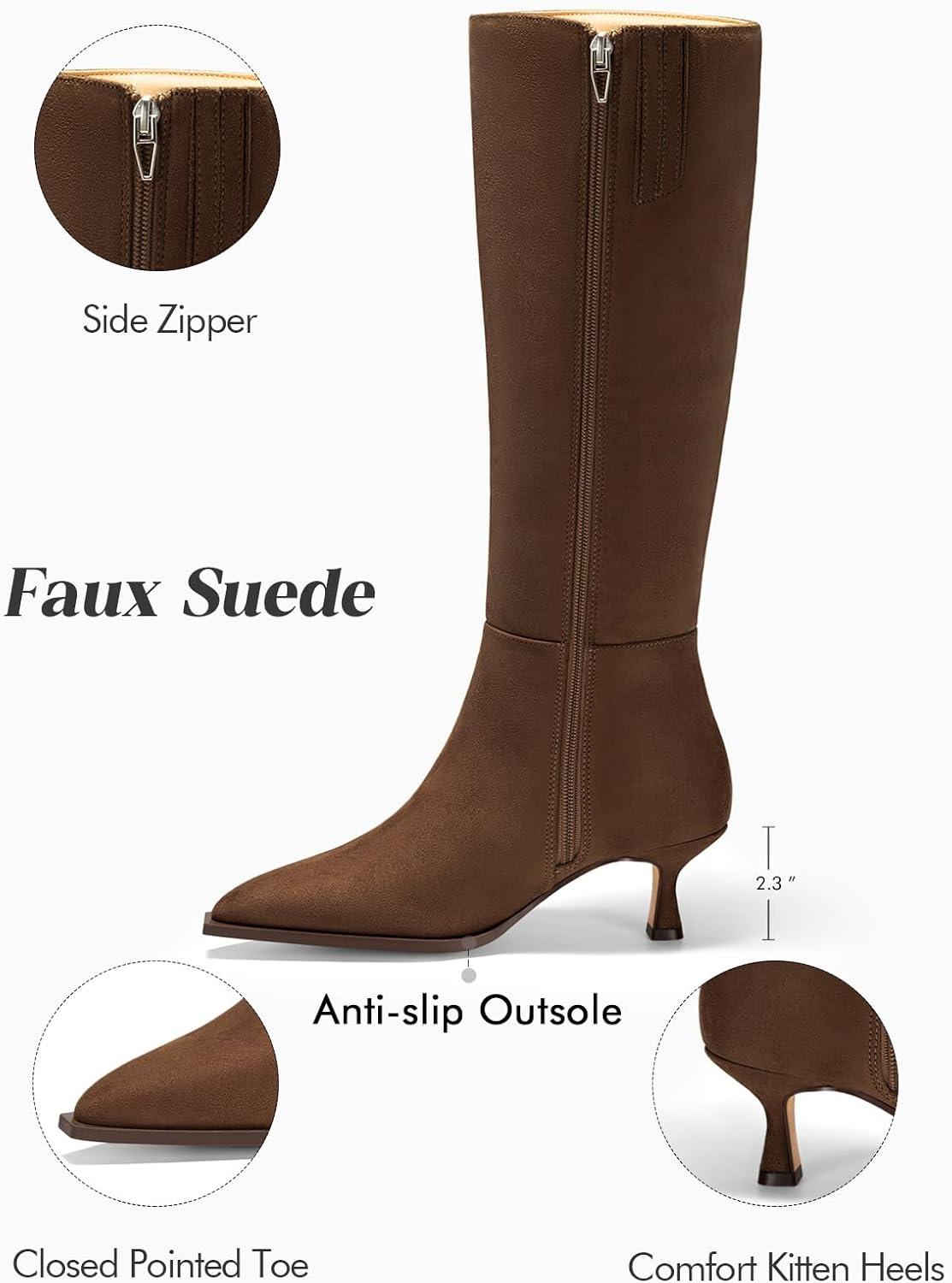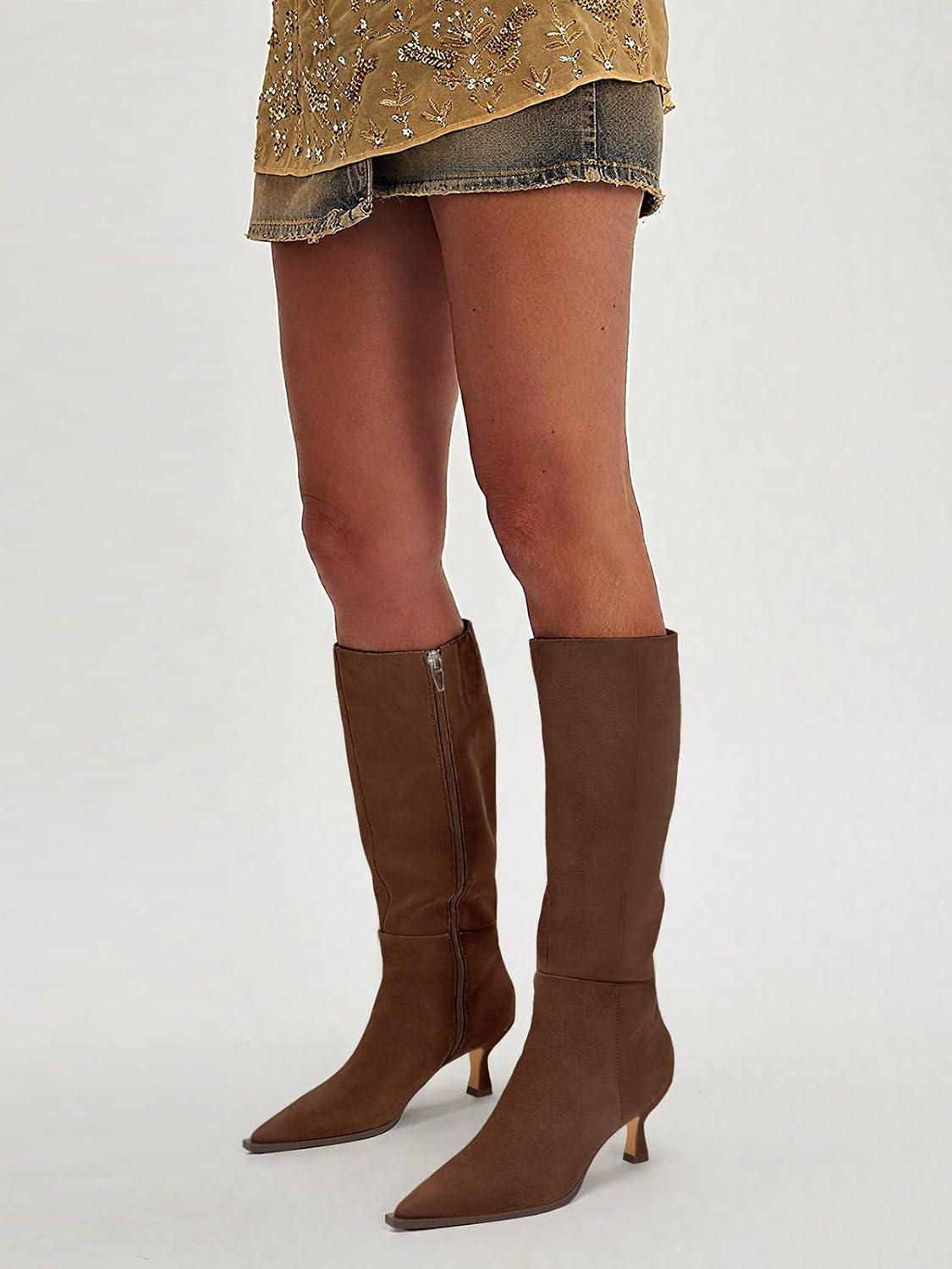 Coutgo Womens Knee High Boots Kitten Low Heel Pointed Toe Tall Boots Side Zipper Winter Dress Shoes(Chocolate Brown)