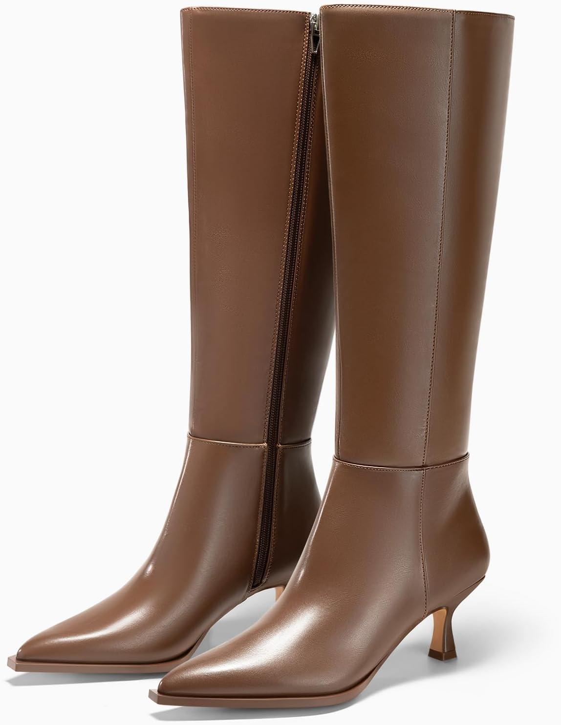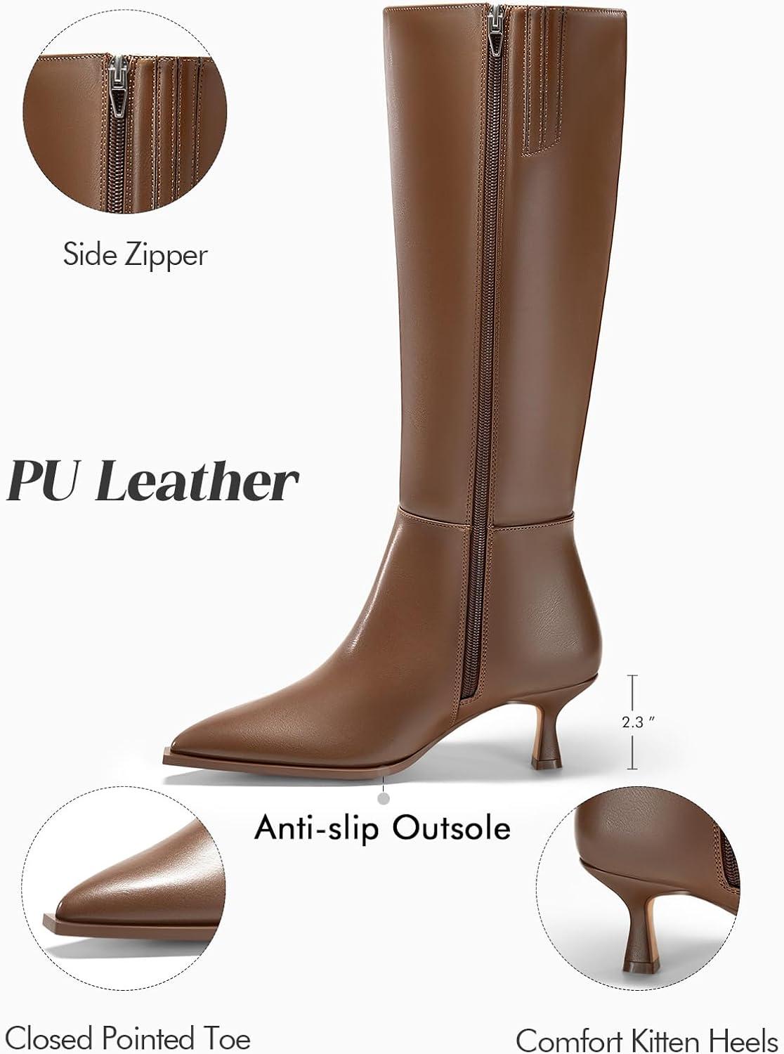 Coutgo Womens Knee High Boots Kitten Low Heel Pointed Toe Tall Boots Side Zipper Winter Dress Shoes(Dark Brown)