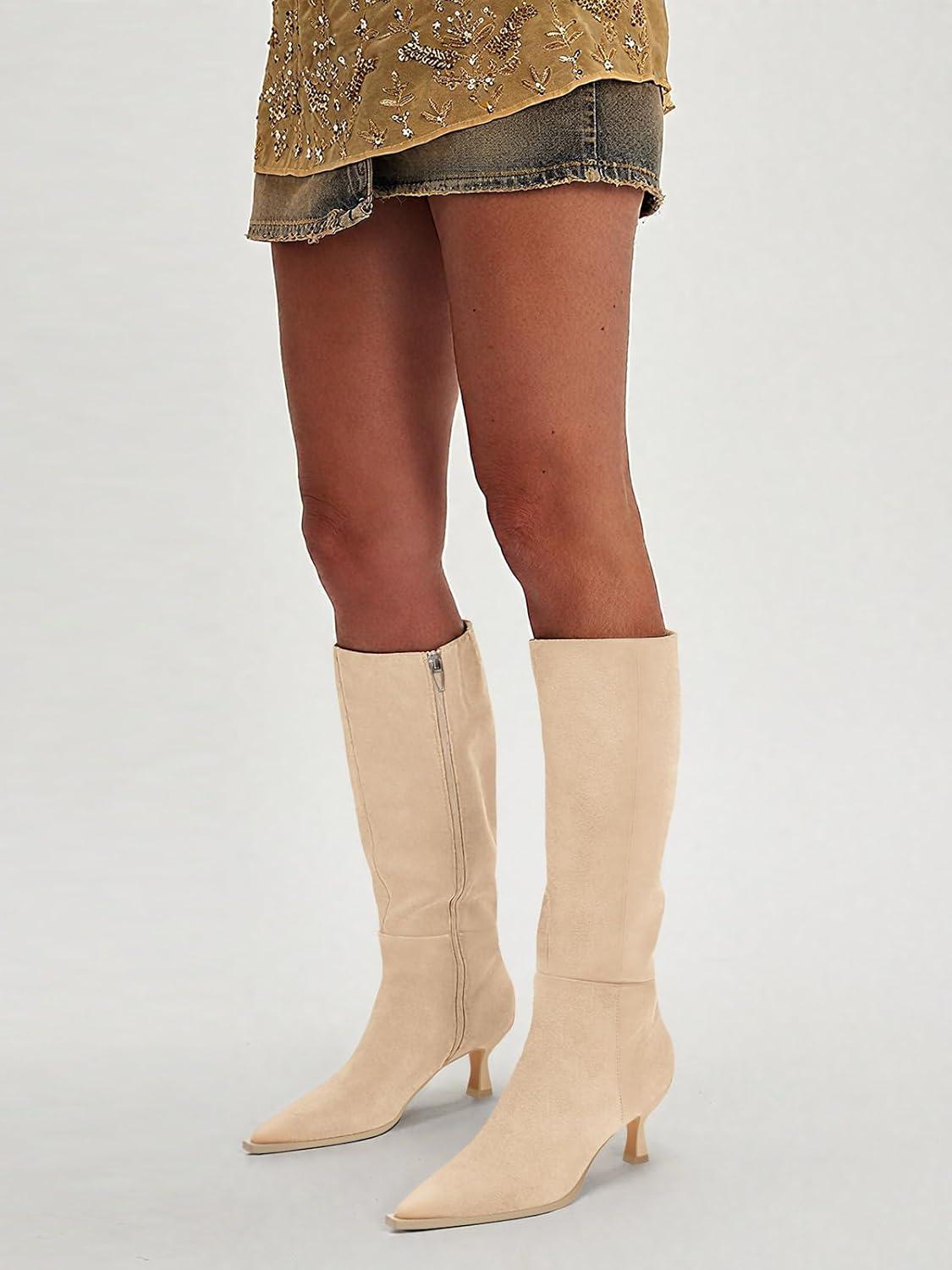 Coutgo Womens Knee High Boots Kitten Low Heel Pointed Toe Tall Boots Side Zipper Winter Dress Shoes(Nude)