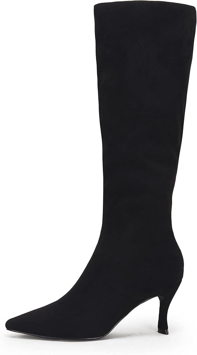 Coutgo Womens Knee High Boots Pointed Toe Kitten Heel Side Zipper Stretchy Vegan Suede Comfort Fall Winter Boot(Pure Black)