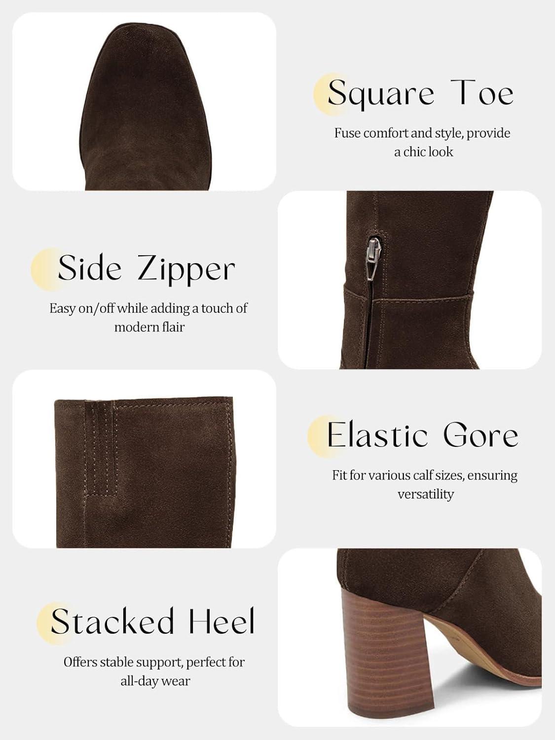 Coutgo Womens Knee High Boots Square Toe Chunky Block Heel Side Zipper Faux Suede Long Boots Fall Winter Shoes(Coffee)
