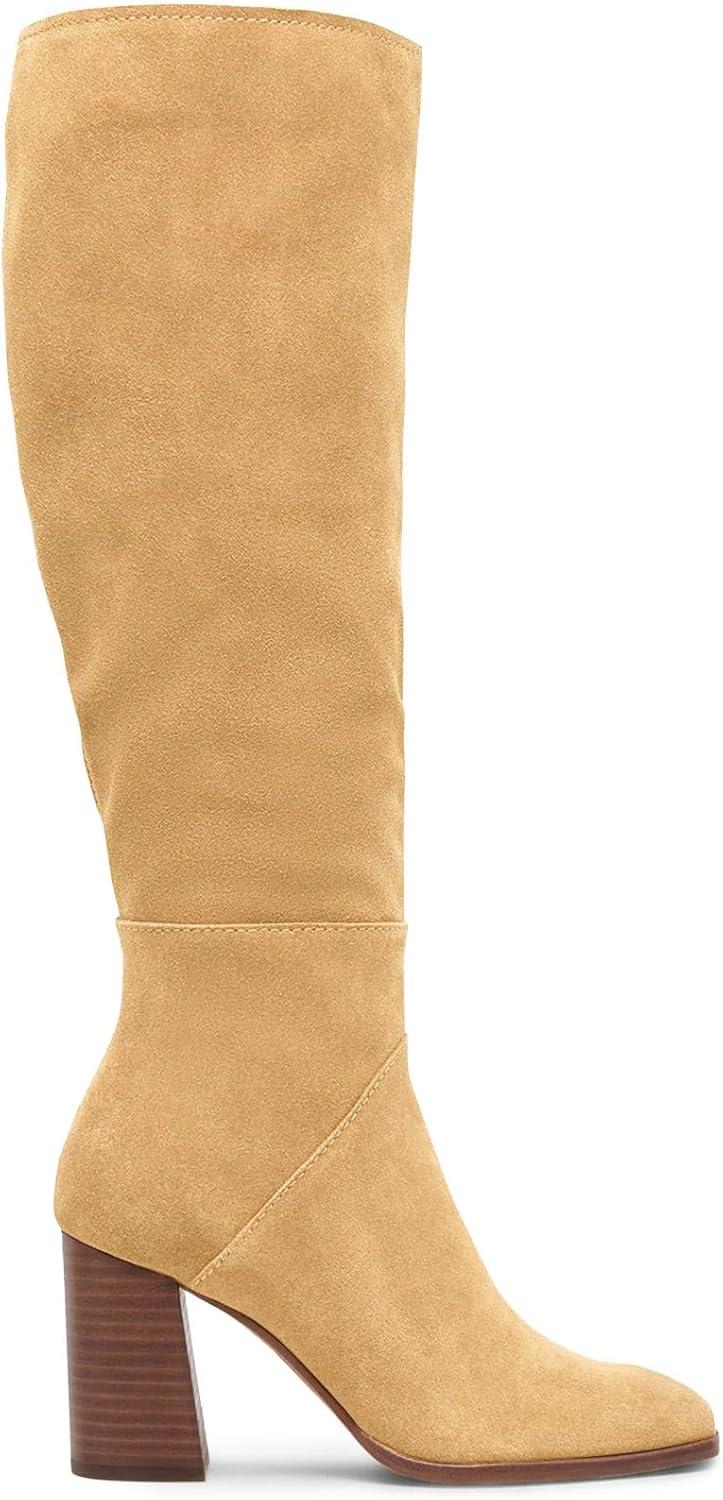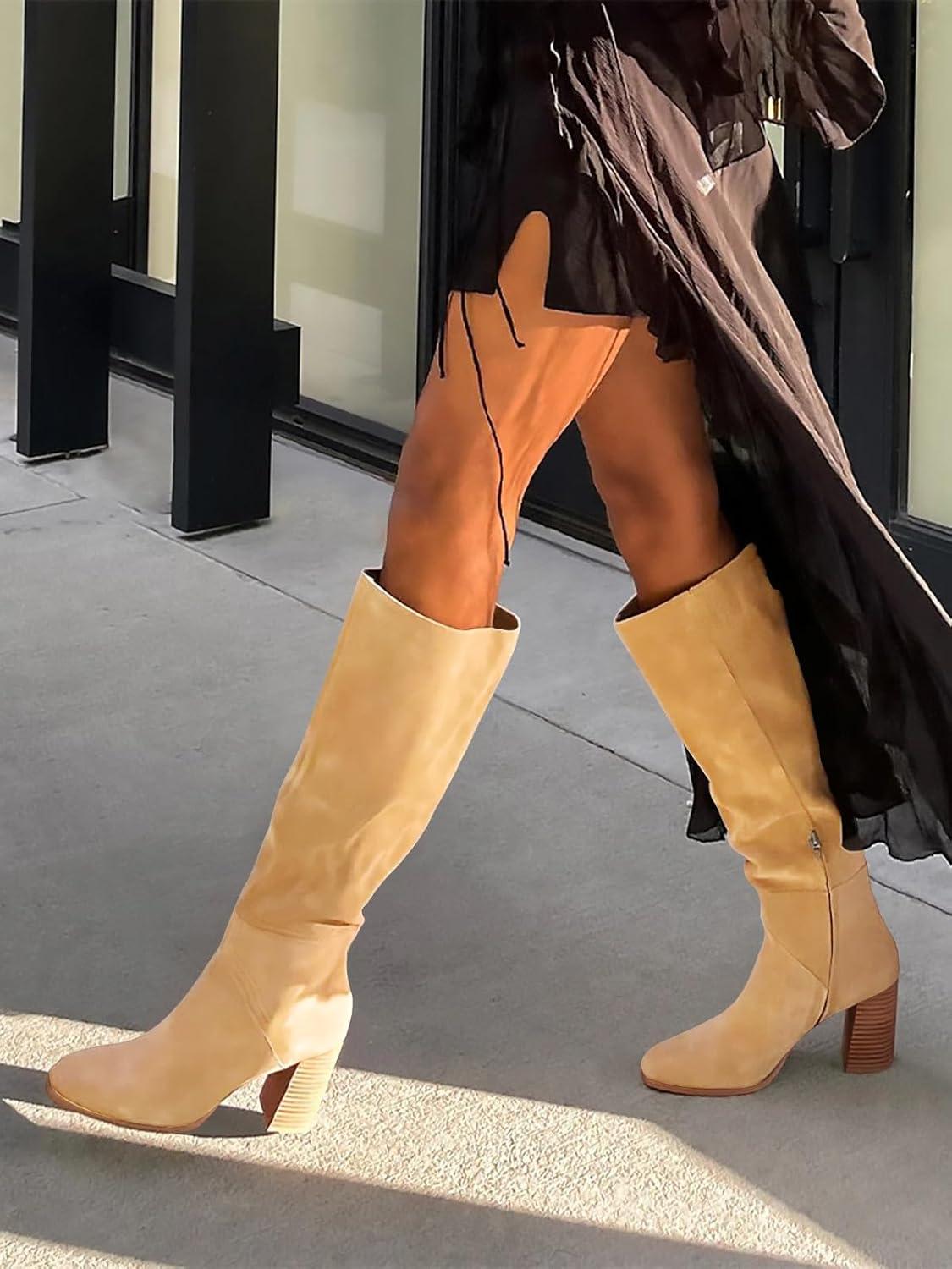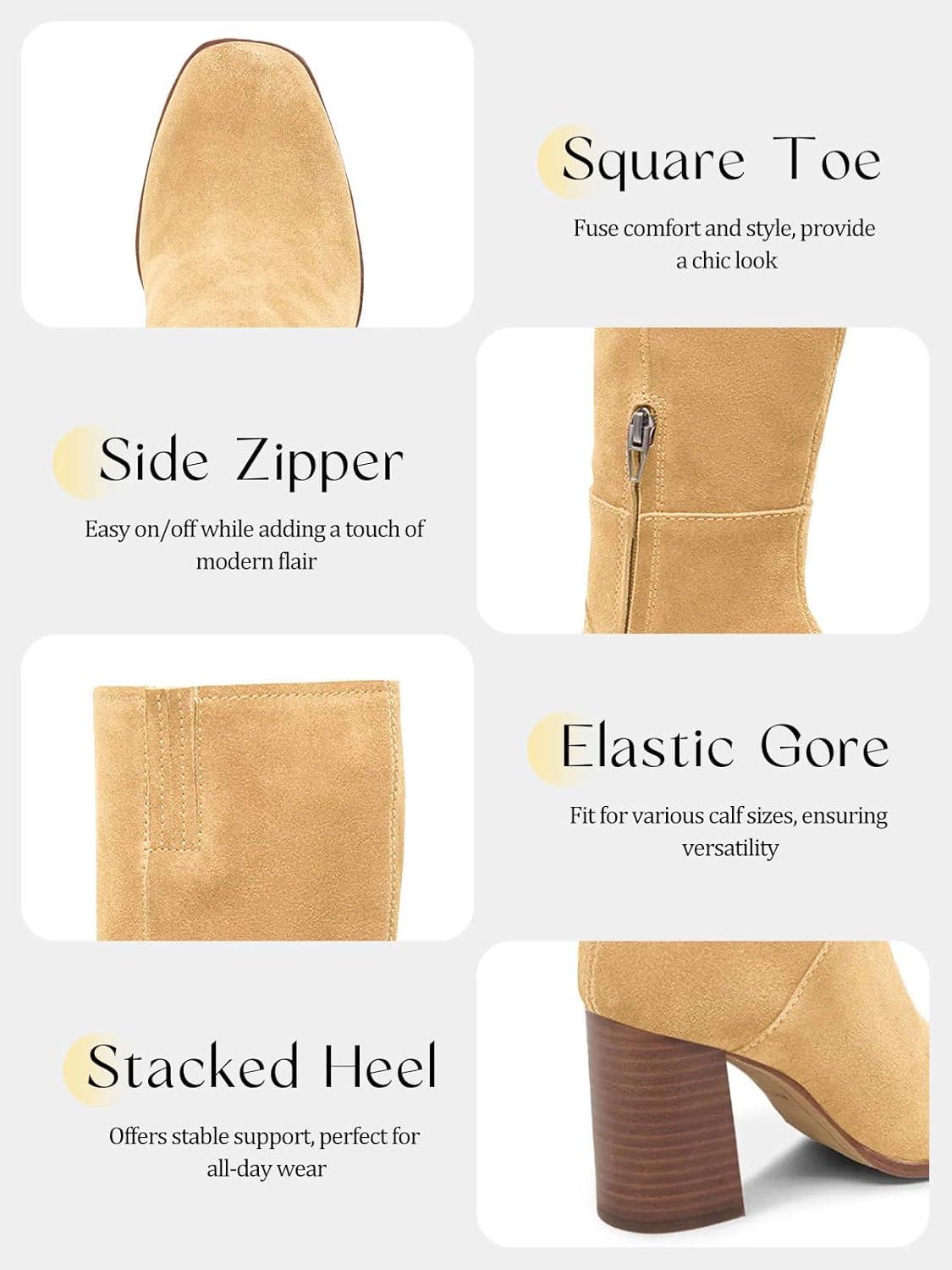 Coutgo Womens Knee High Boots Square Toe Chunky Block Heel Side Zipper Faux Suede Long Boots Fall Winter Shoes(Khaki)
