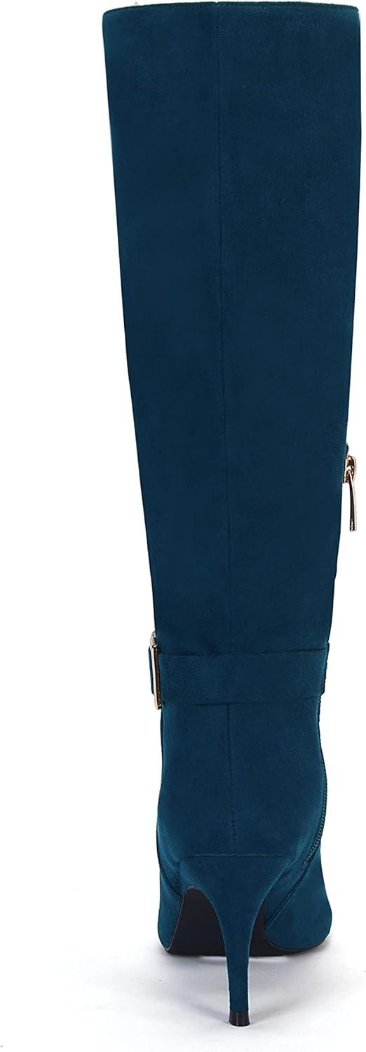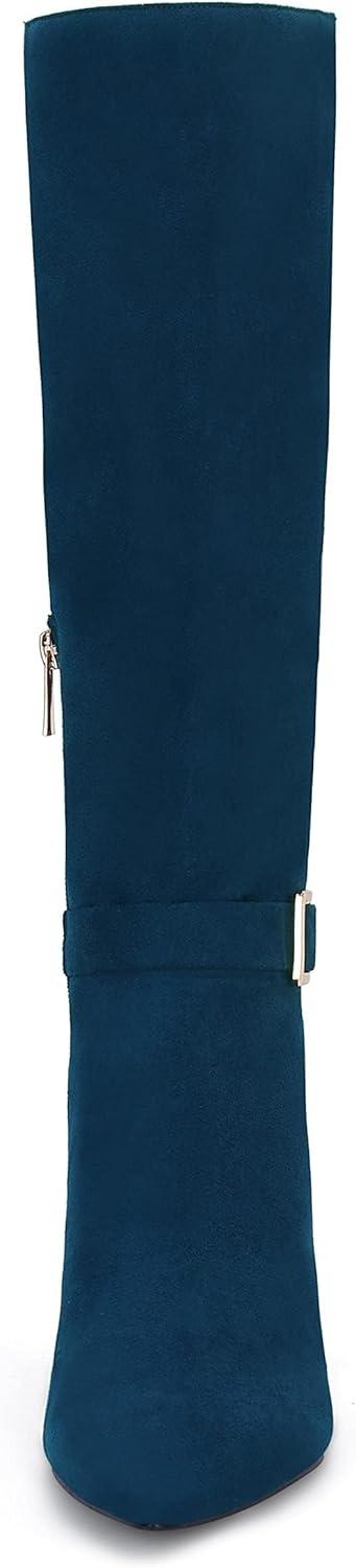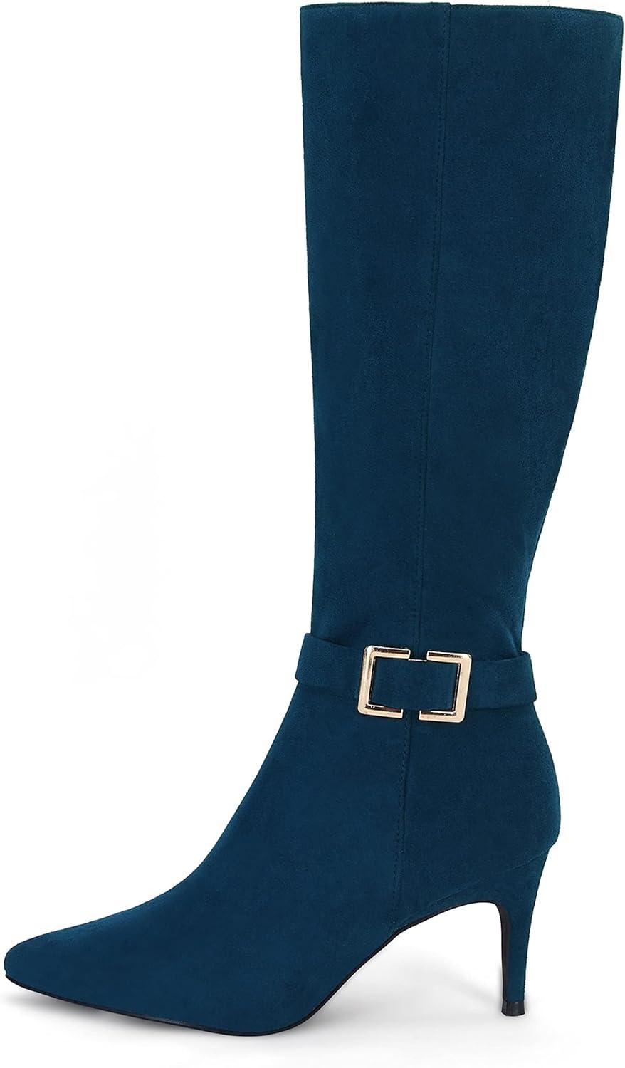 Coutgo Womens Knee High Boots Stiletto Heels Suede Pointed Toe Wide Calf Metal Buckle Side Zipper Winter Boots(Navy)