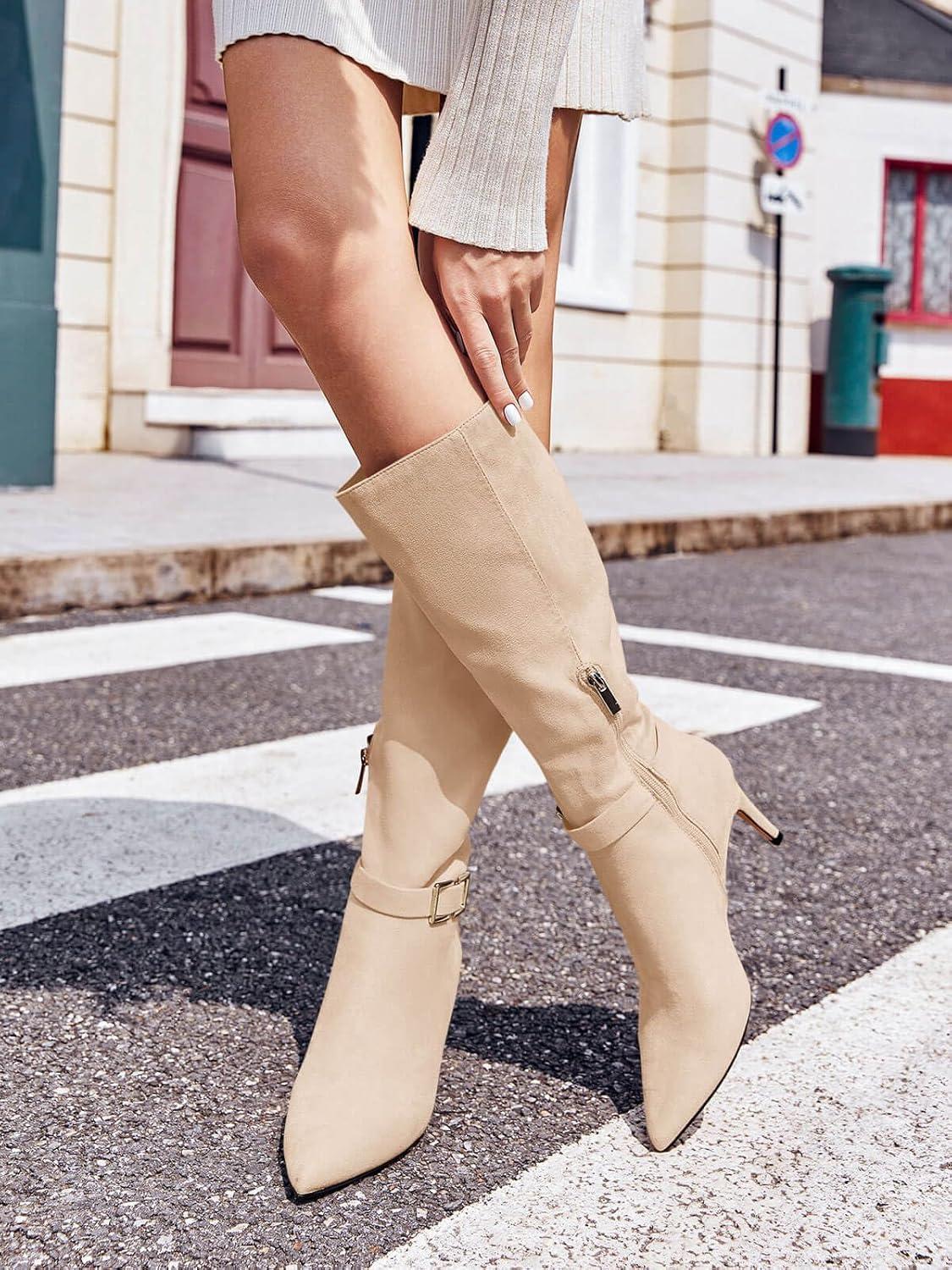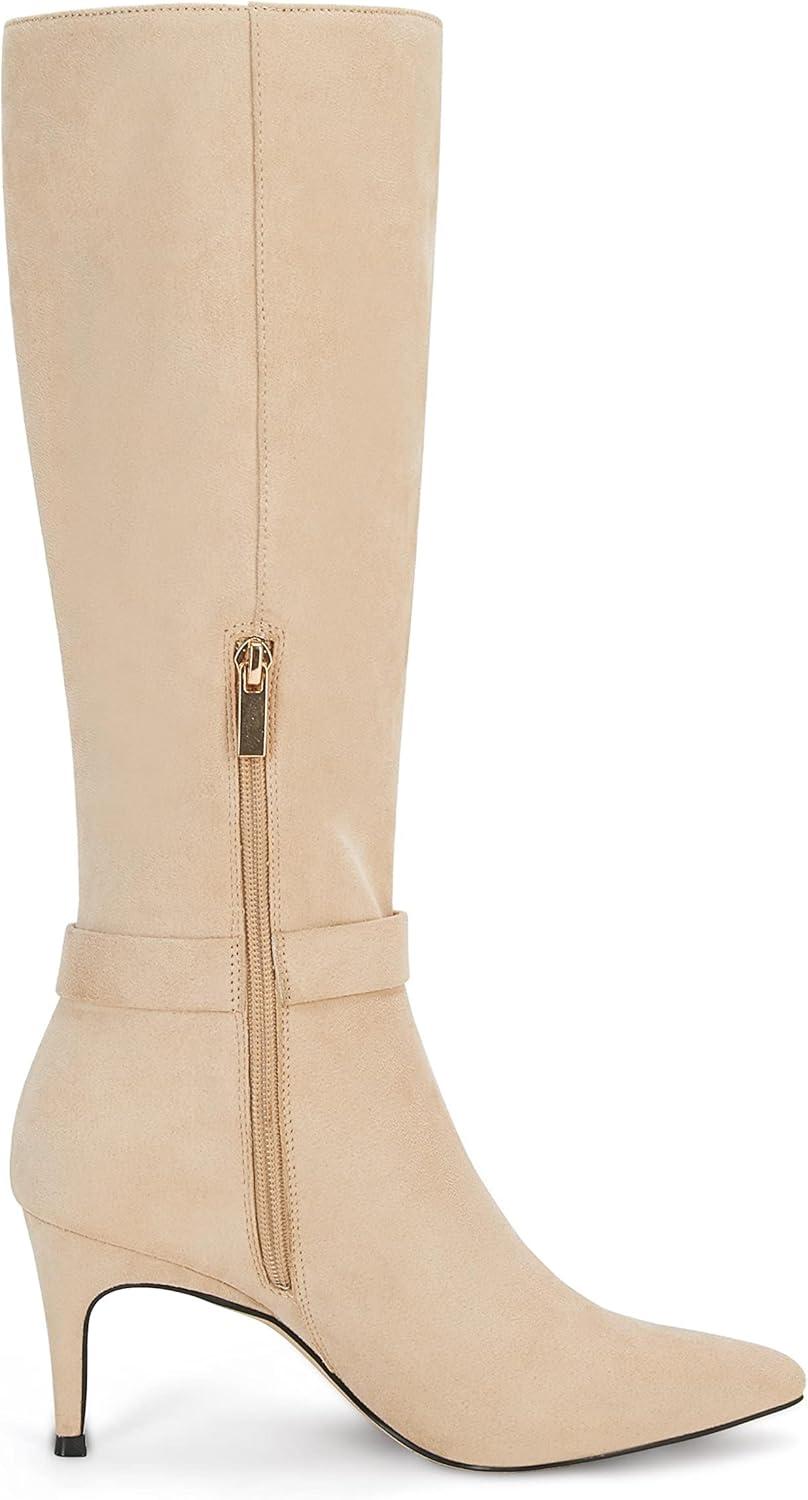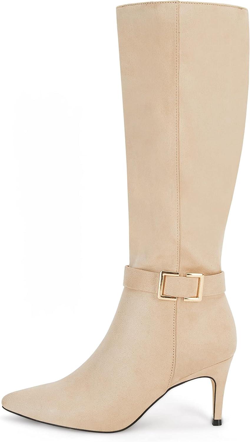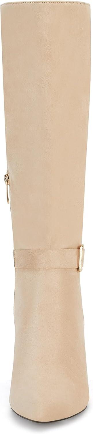 Coutgo Womens Knee High Boots Stiletto Heels Suede Pointed Toe Wide Calf Metal Buckle Side Zipper Winter Boots(Nude)
