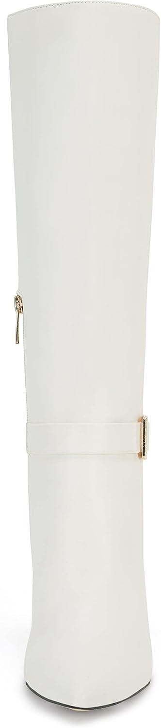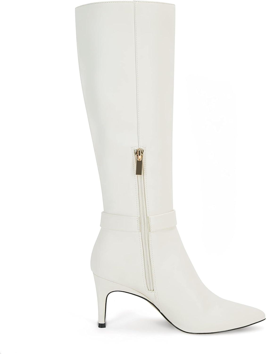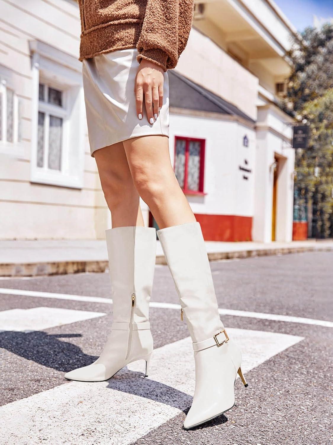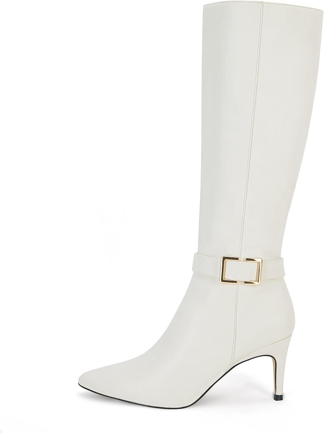 Coutgo Womens Knee High Boots Stiletto Heels Suede Pointed Toe Wide Calf Metal Buckle Side Zipper Winter Boots(White)
