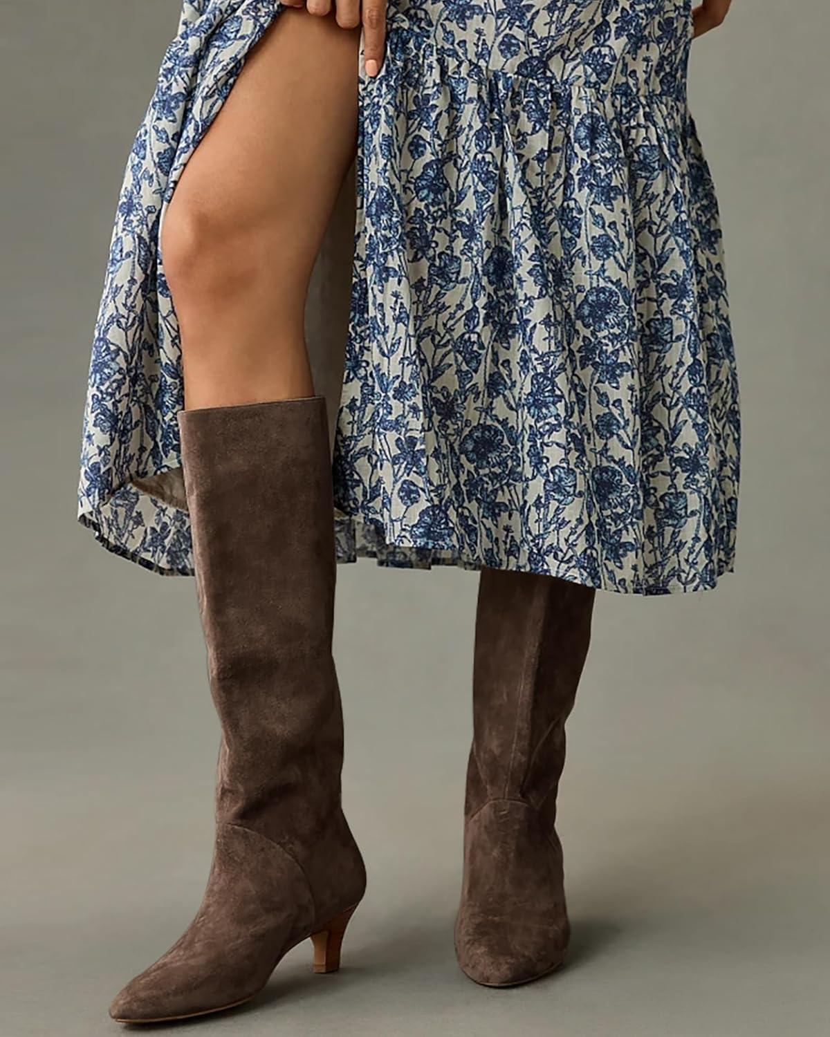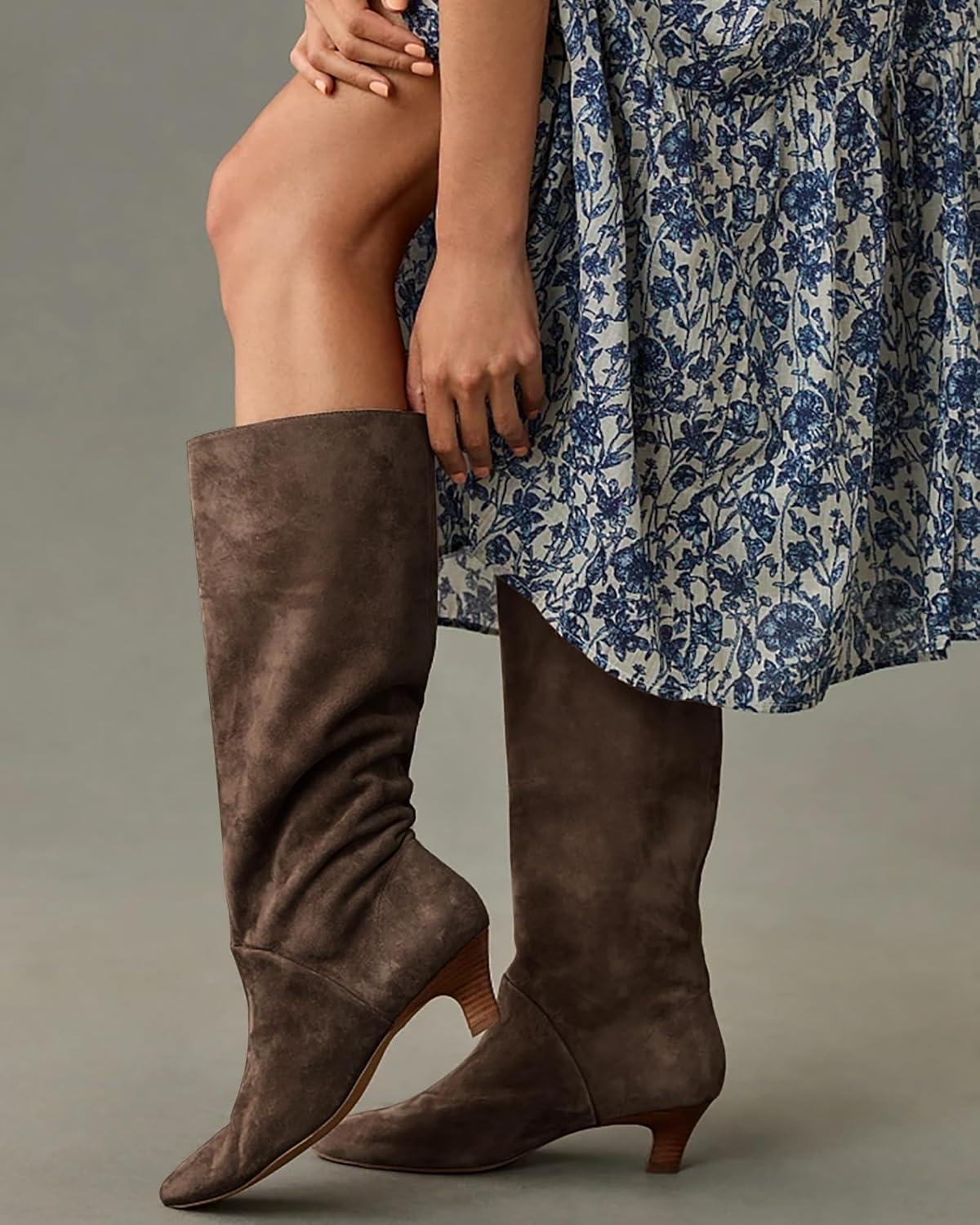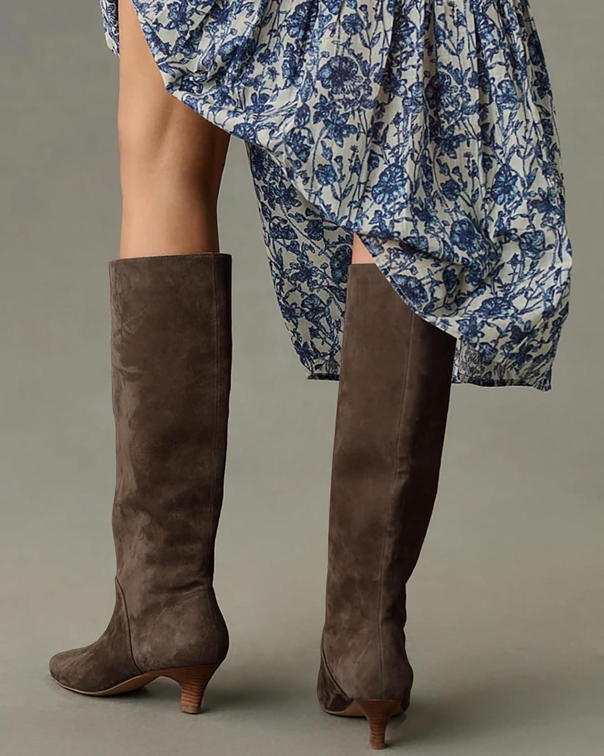 Coutgo Womens Knee High Boots Wide Calf Kitten Heel Pointed Toe Long Boots Pull On Winter Dress Shoes(Dark Brown)