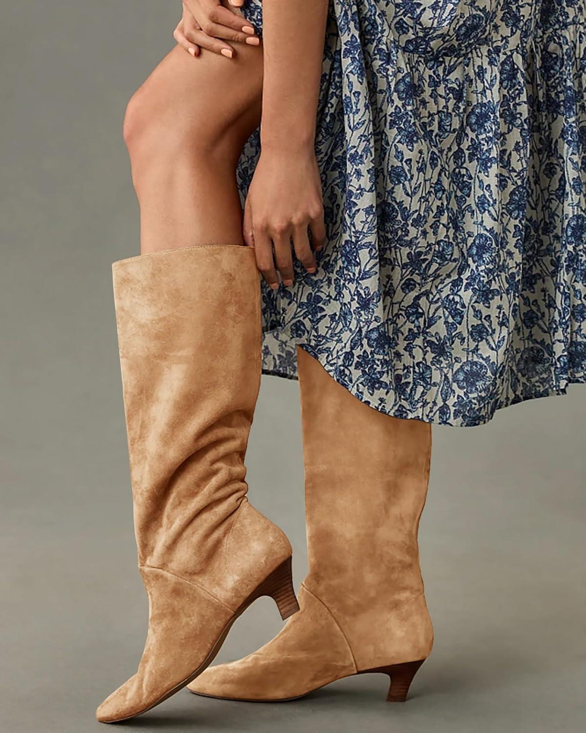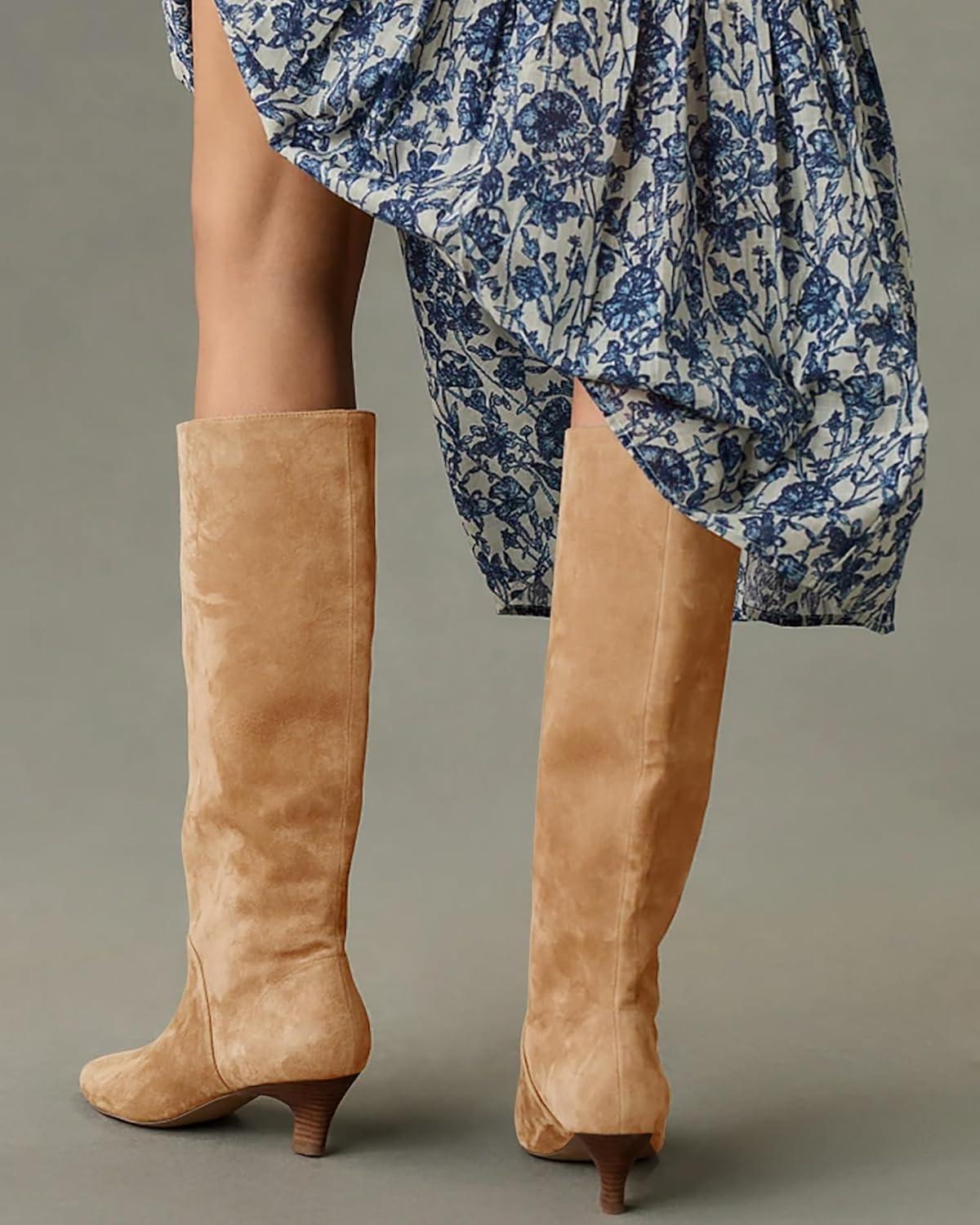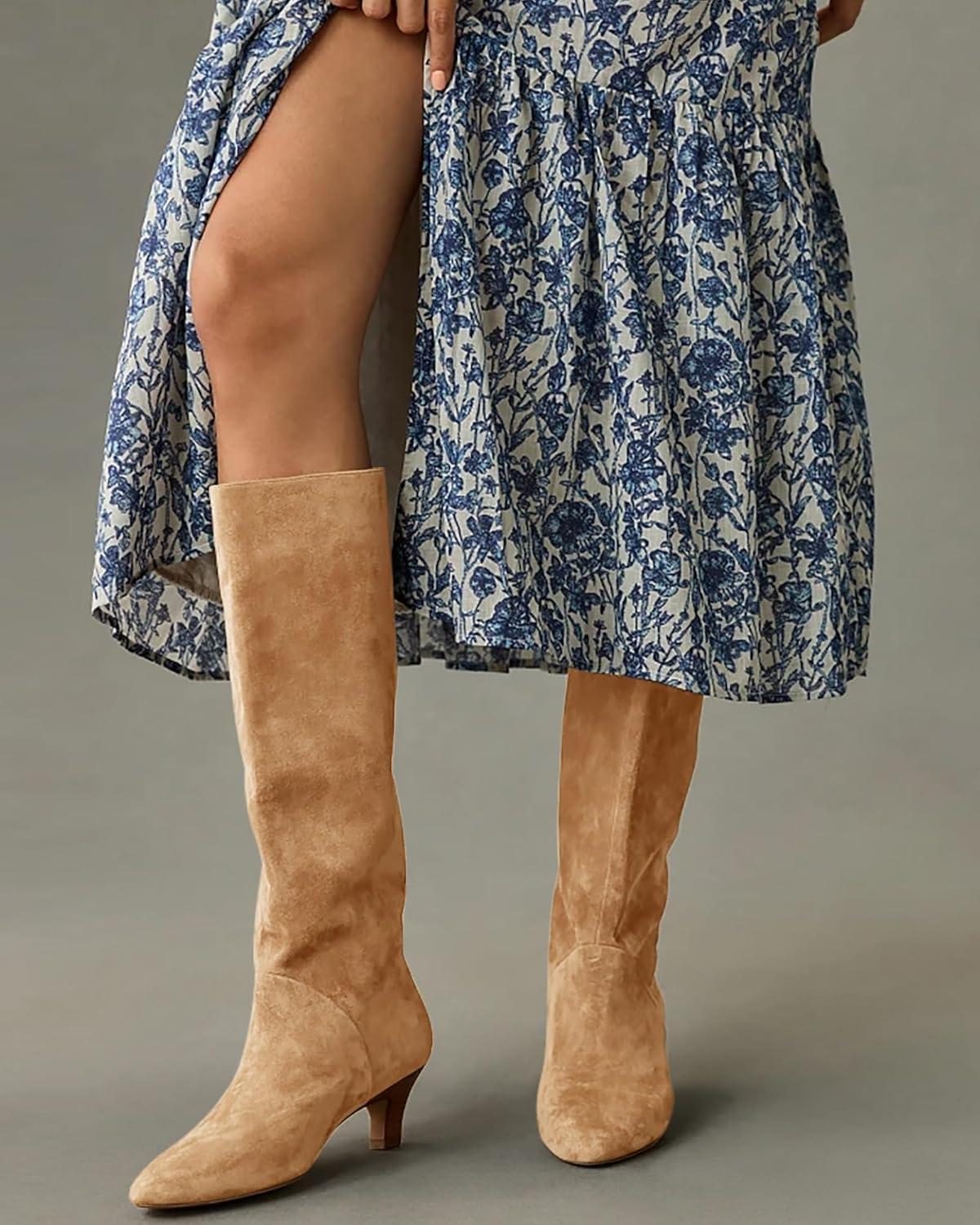 Coutgo Womens Knee High Boots Wide Calf Kitten Heel Pointed Toe Long Boots Pull On Winter Dress Shoes(Khaki)
