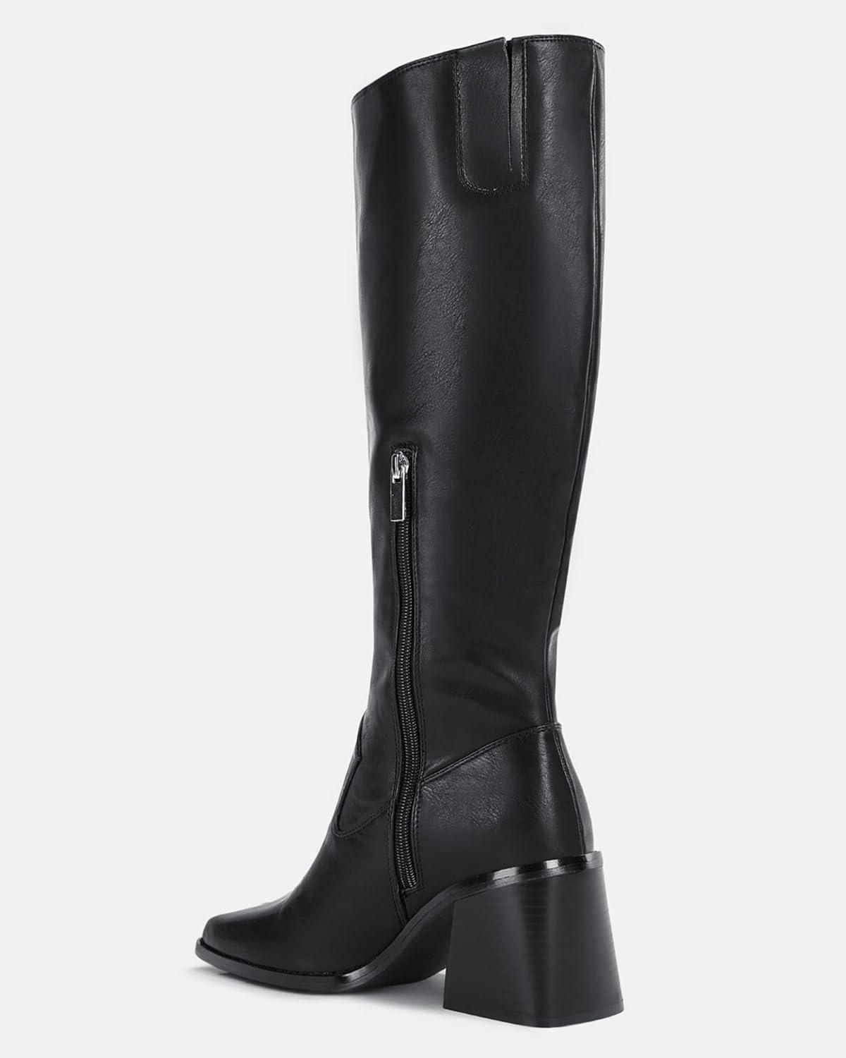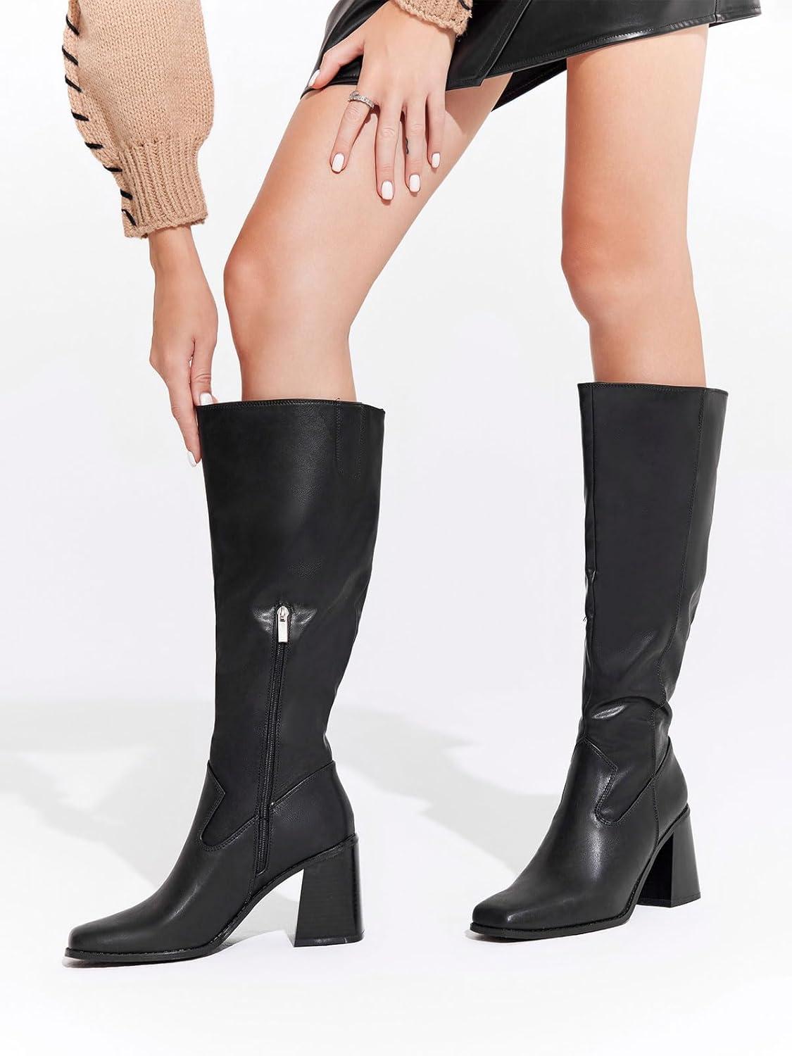 Coutgo Women’s Knee High Boots Wide Calf Square Toe Chunky Heeled Pull-on Boot(Black)