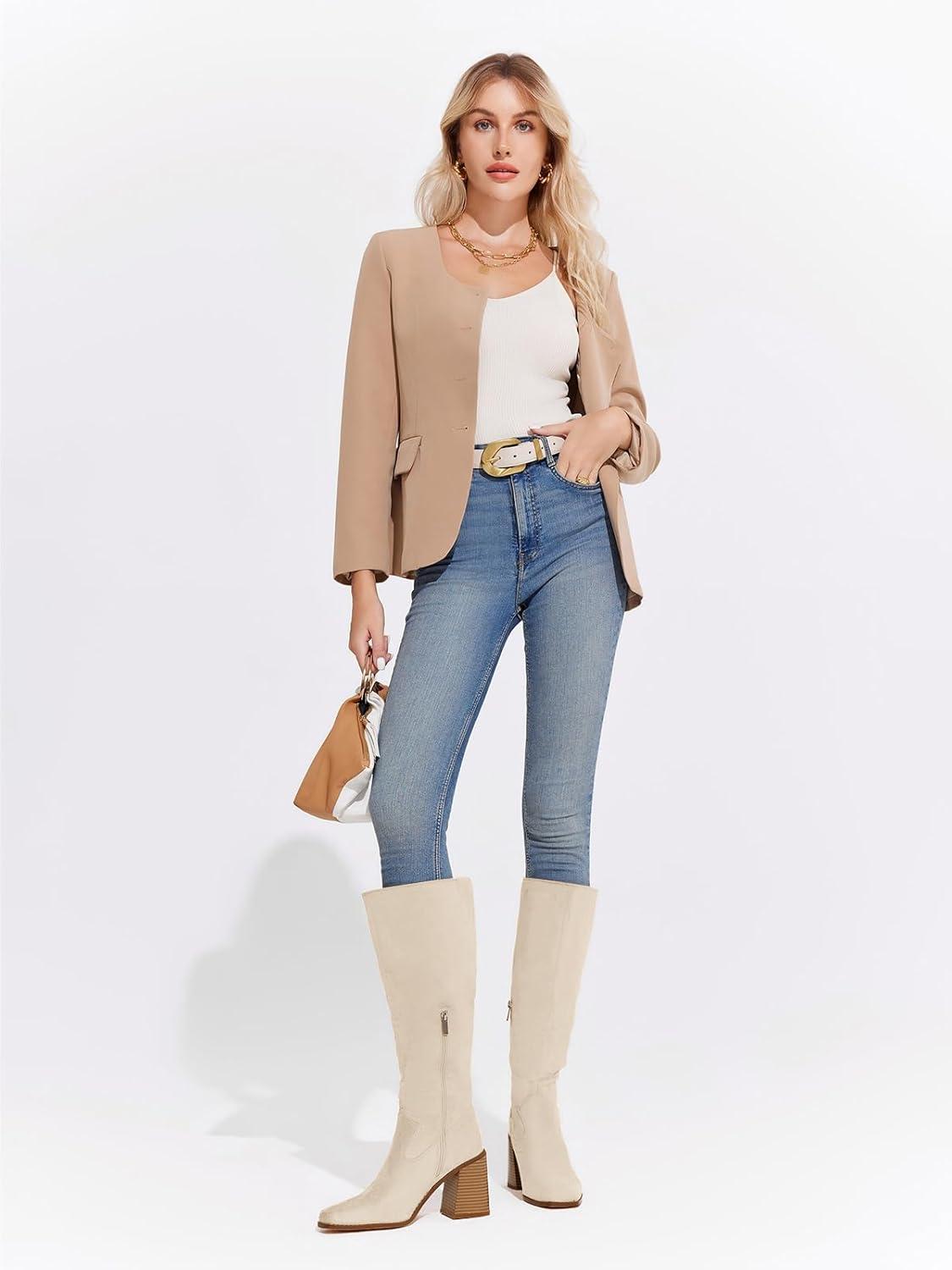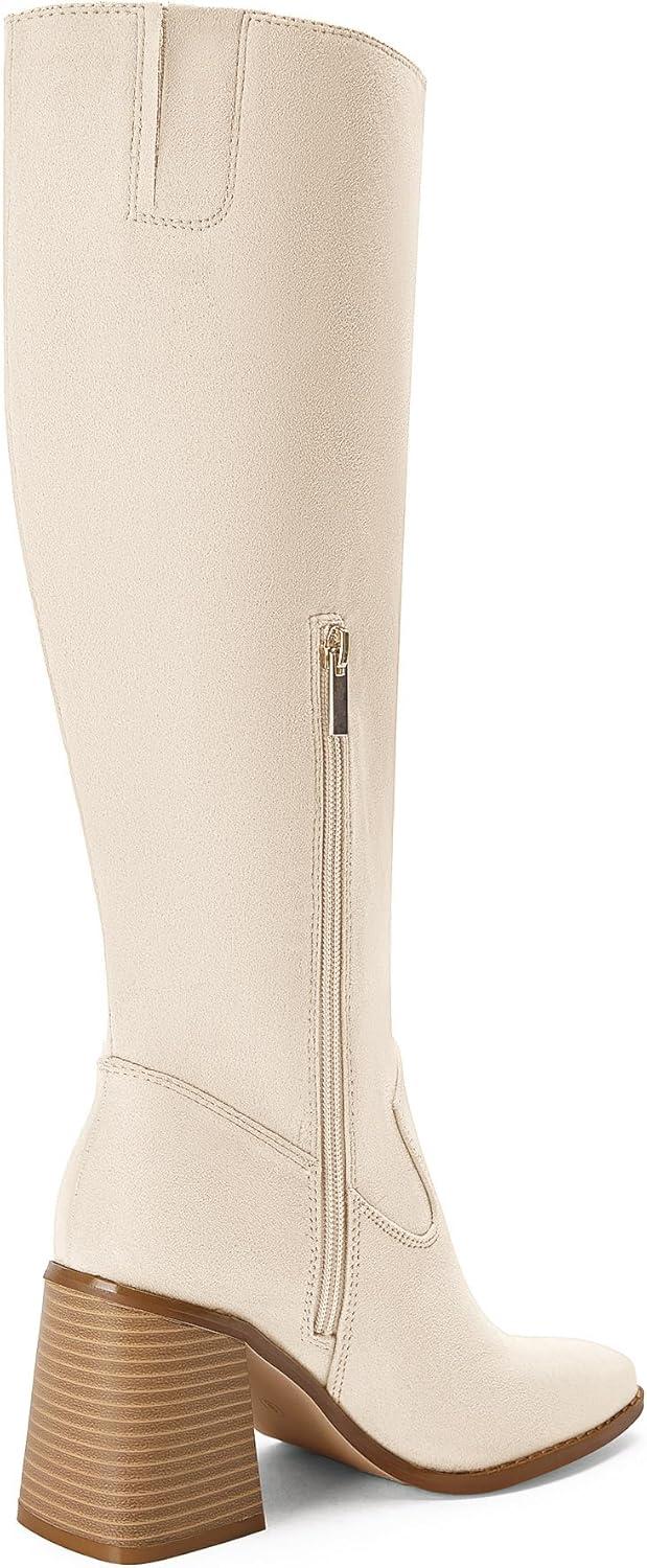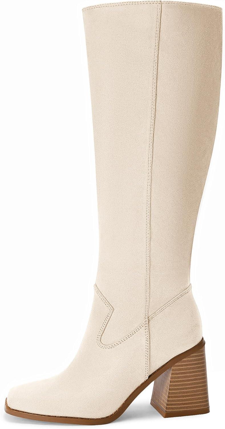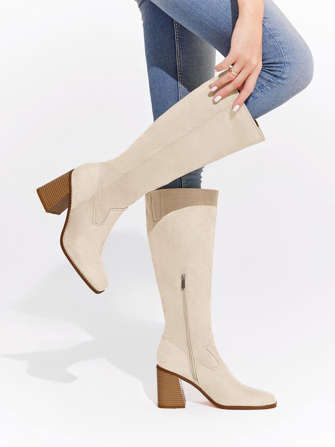 Coutgo Women’s Knee High Boots Wide Calf Square Toe Chunky Heeled Pull-on Boot(Suede Beige)