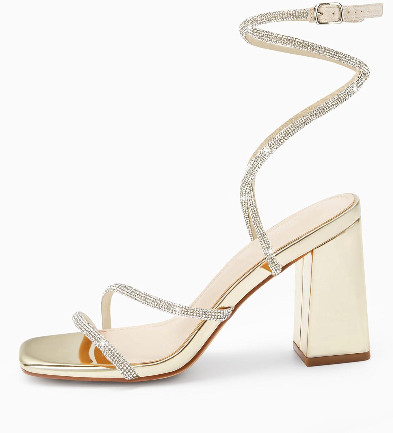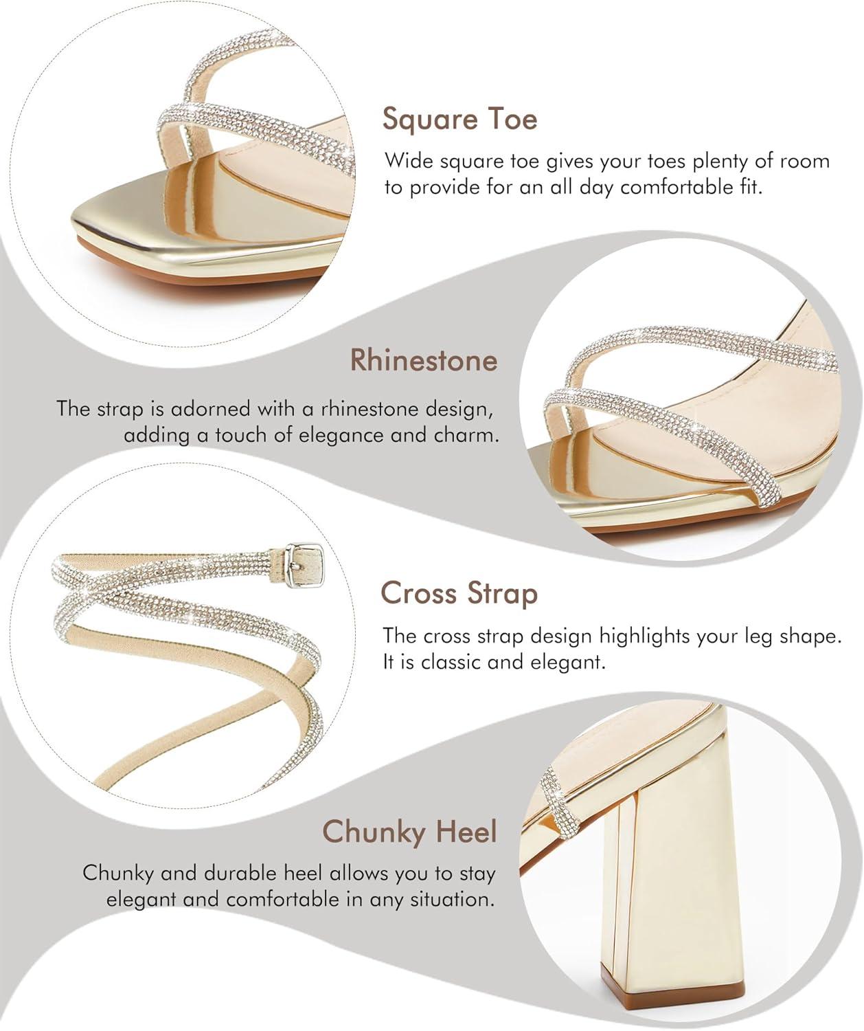 Coutgo Womens Lace Up Chunky Heels Rhinestone Sandals Square Open Toe High Block Heeled Wedding Dress Shoes(Light Gold)
