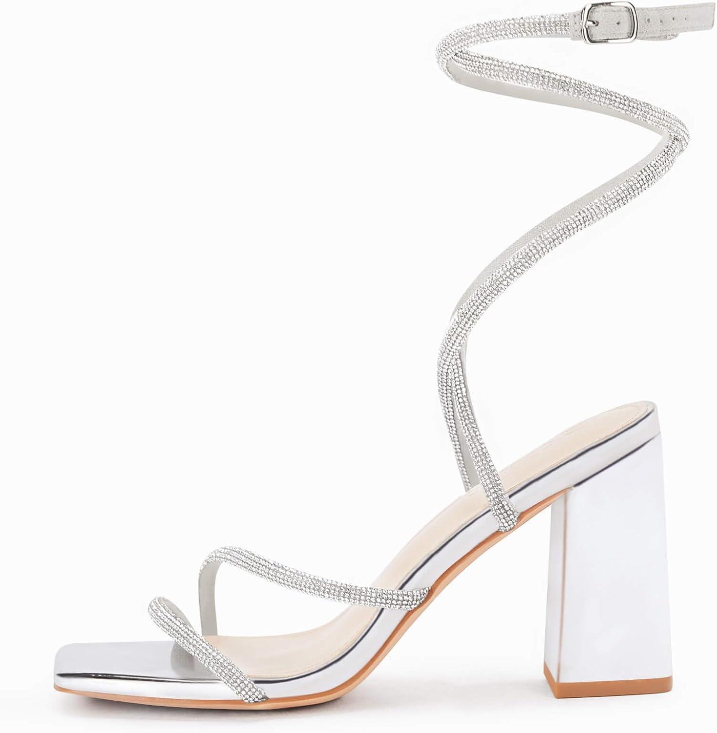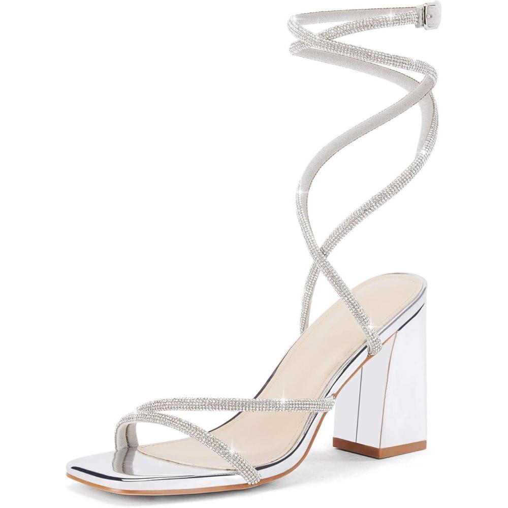 Coutgo Womens Lace Up Chunky Heels Rhinestone Sandals Square Open Toe High Block Heeled Wedding Dress Shoes(Silver)
