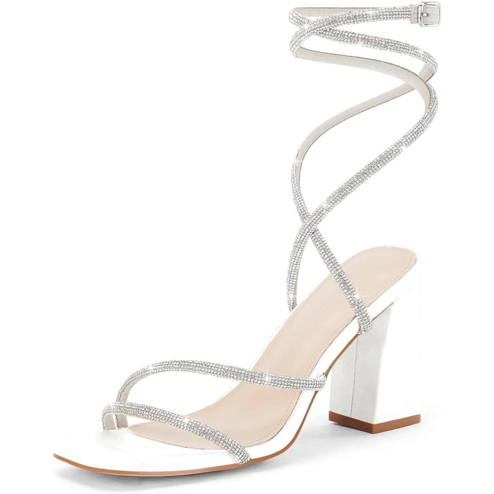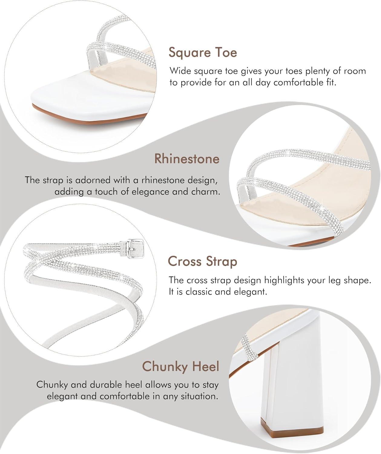 Coutgo Womens Lace Up Chunky Heels Rhinestone Sandals Square Open Toe High Block Heeled Wedding Dress Shoes(White)