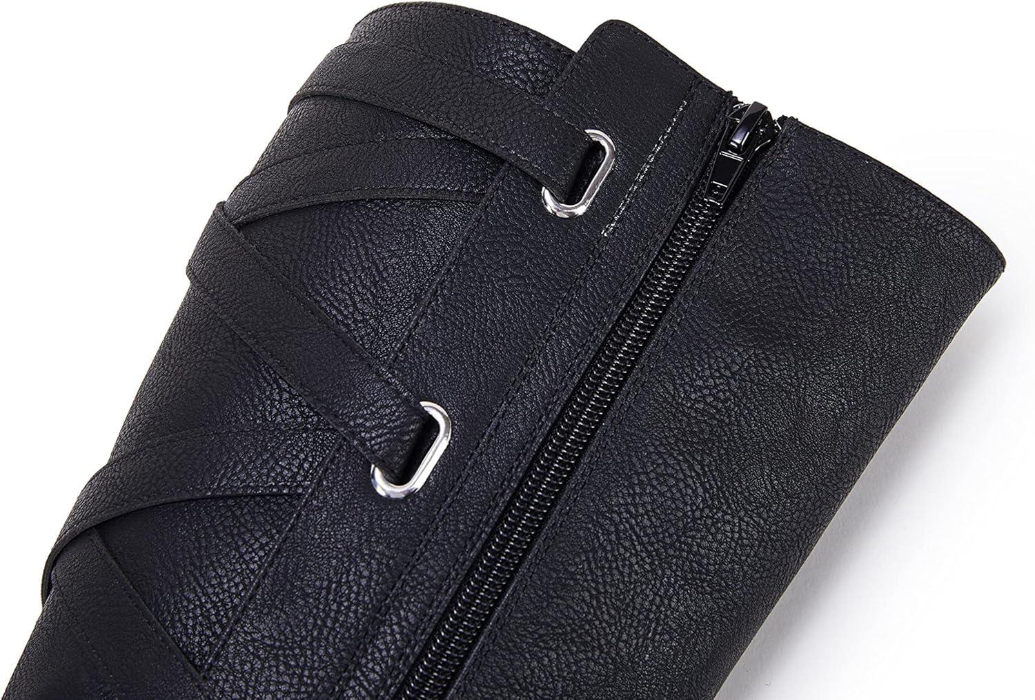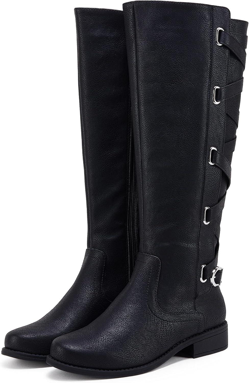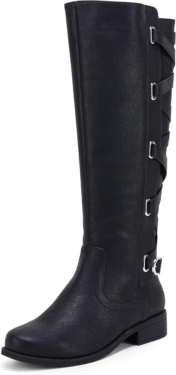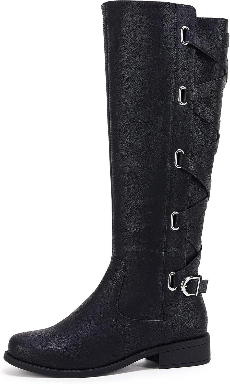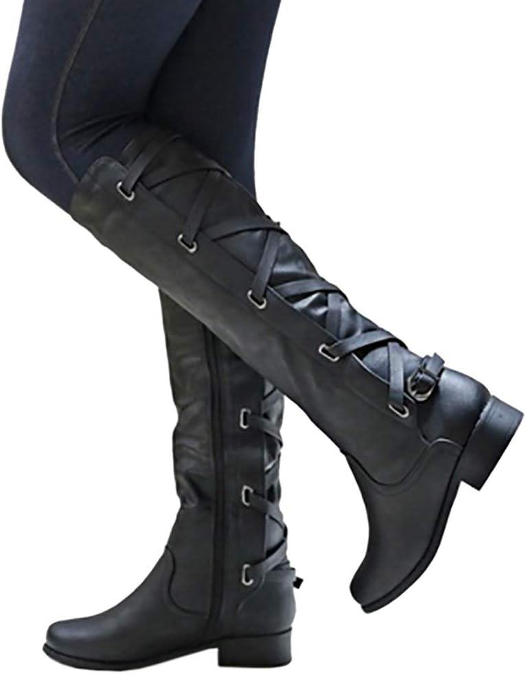 Coutgo Womens Lace Up Knee High Boots Motorcycle Riding Flat Low Heels Strappy Winter Combat Boots(Black)