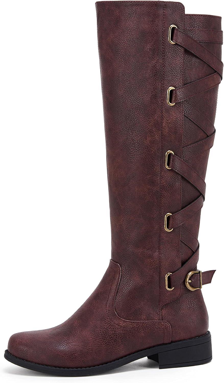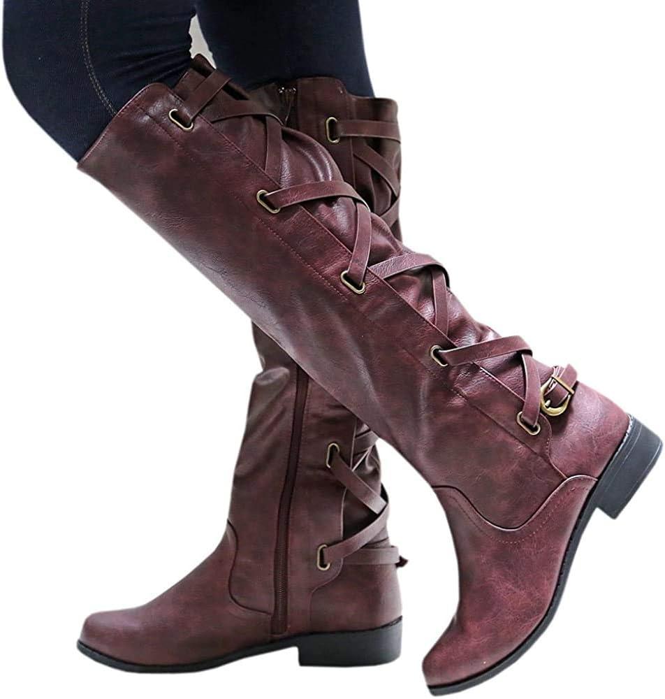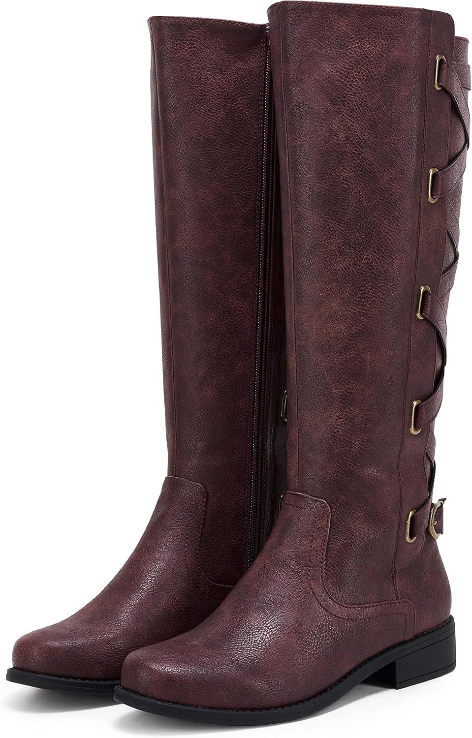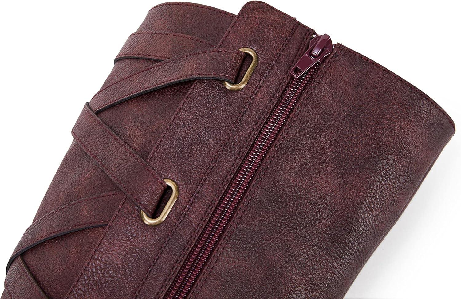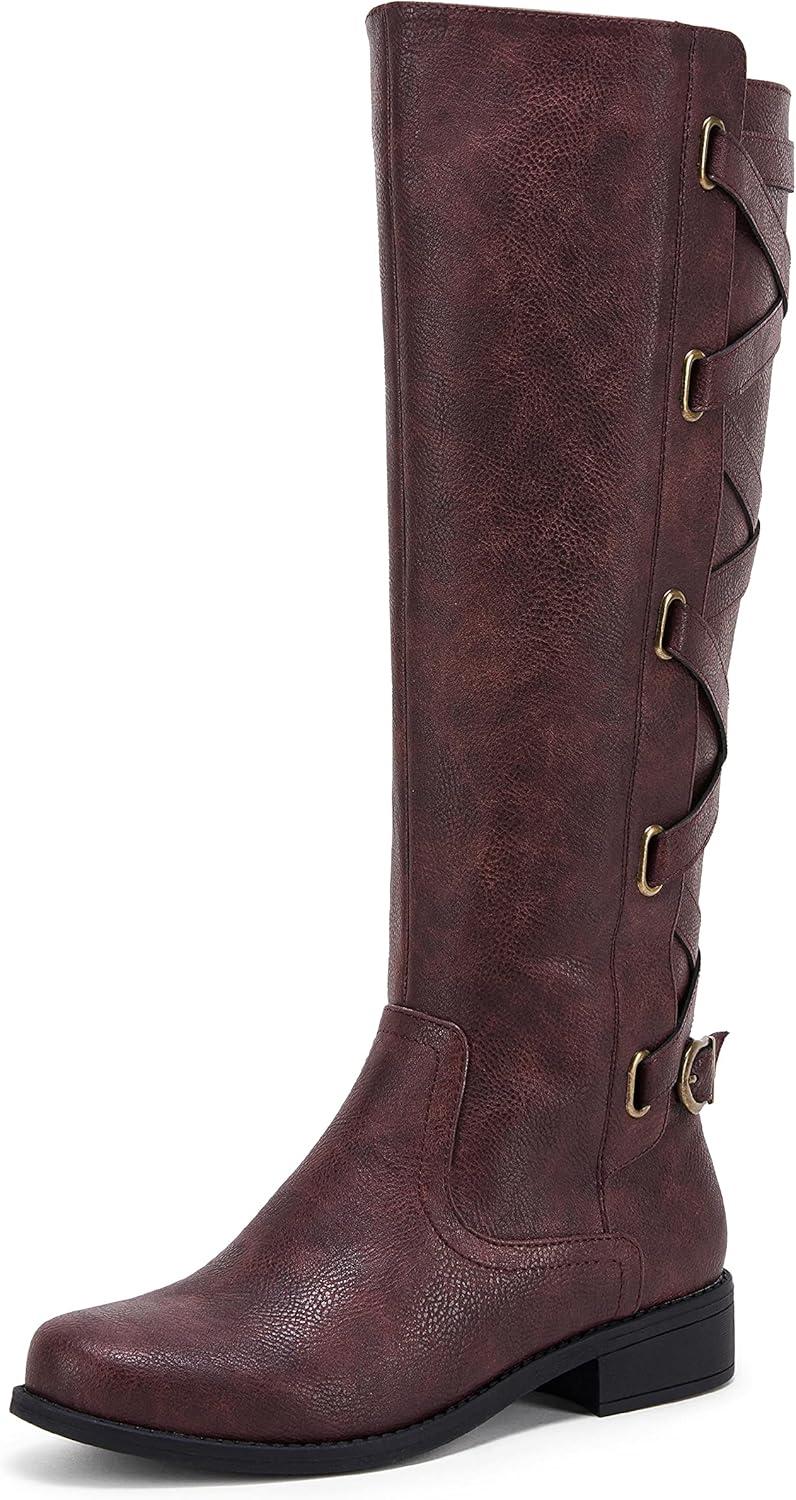 Coutgo Womens Lace Up Knee High Boots Motorcycle Riding Flat Low Heels Strappy Winter Combat Boots(Burgundy)