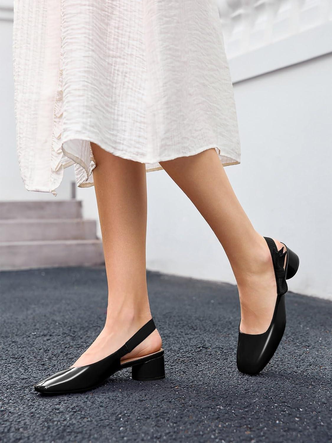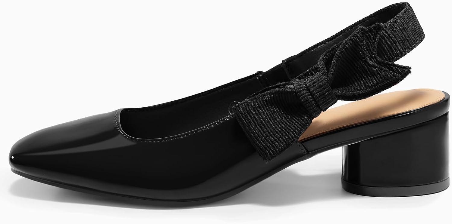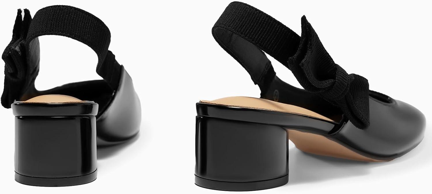 Coutgo Women’s Low Block Heels Slingback Bow Closed Square Toe Slip On Work Pumps Dress Shoes(Black)