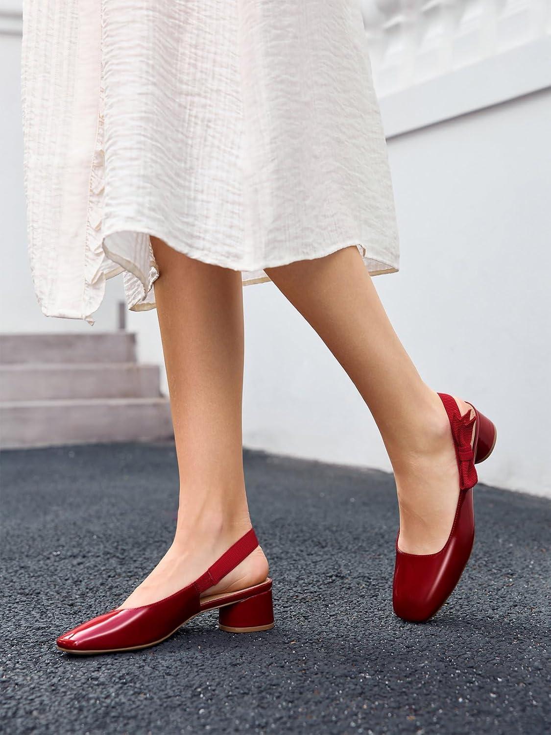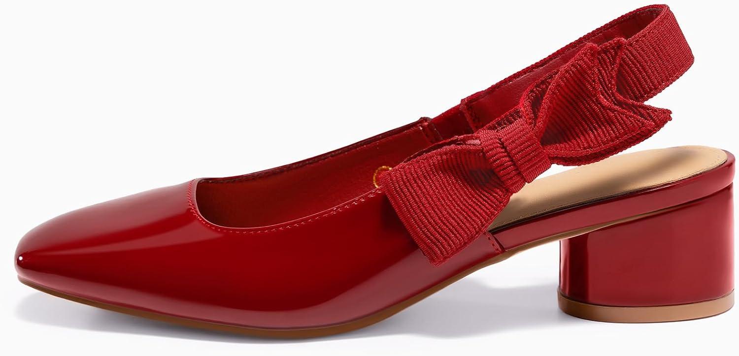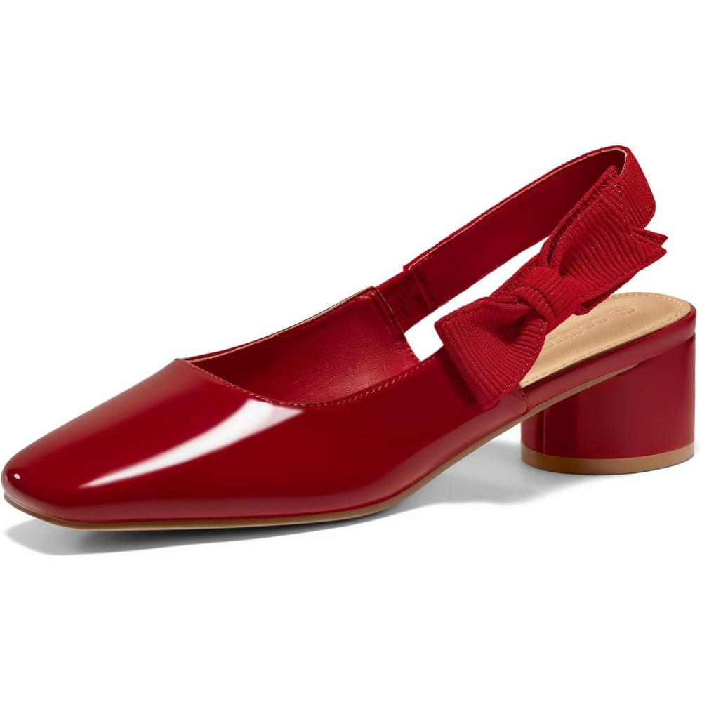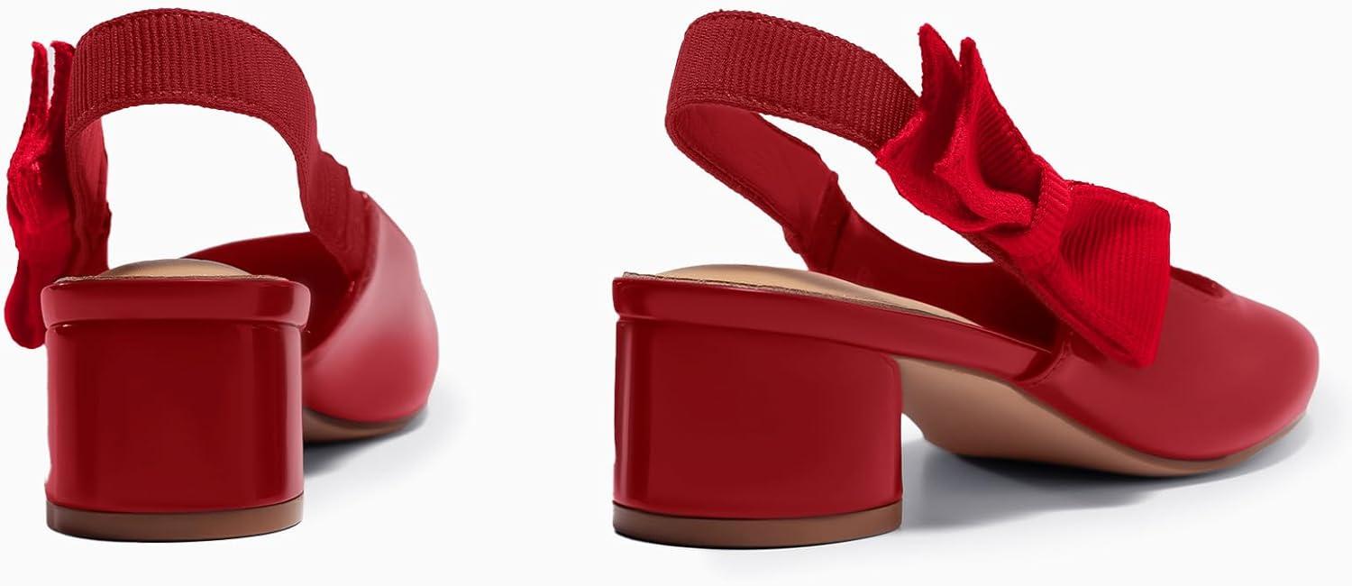 Coutgo Women’s Low Block Heels Slingback Bow Closed Square Toe Slip On Work Pumps Dress Shoes(Red)