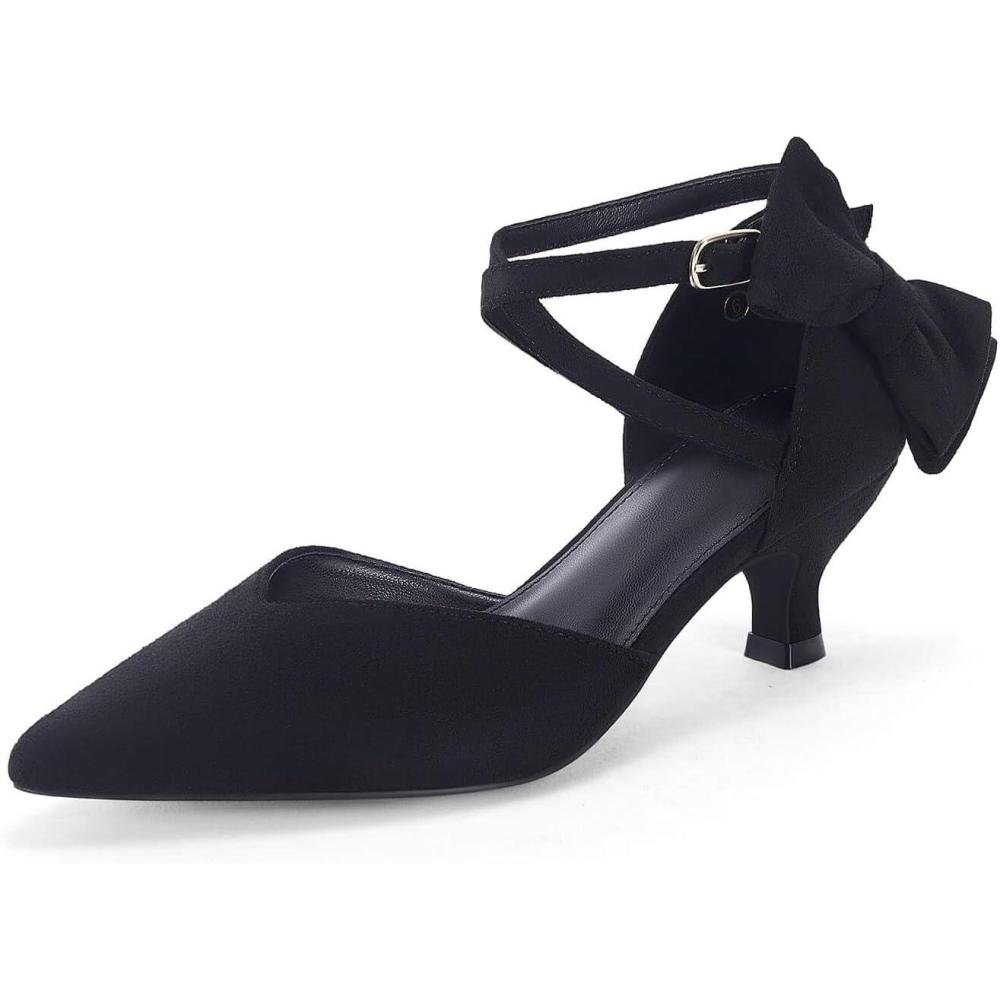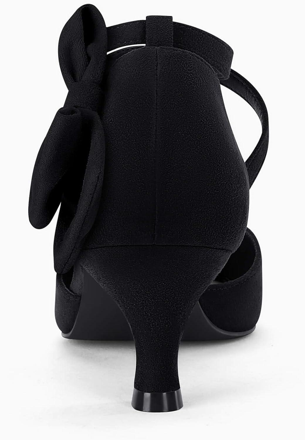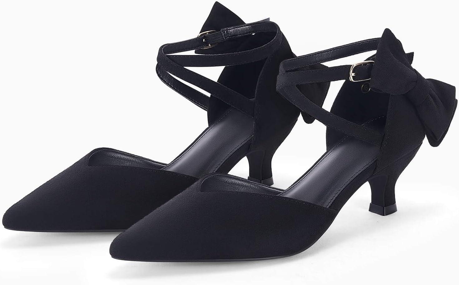 Coutgo Womens Low Kitten Heel Bow Heels Dress Shoes Closed Pointed Toe Ankle Strap Elegant Wedding Party Pumps(Black)