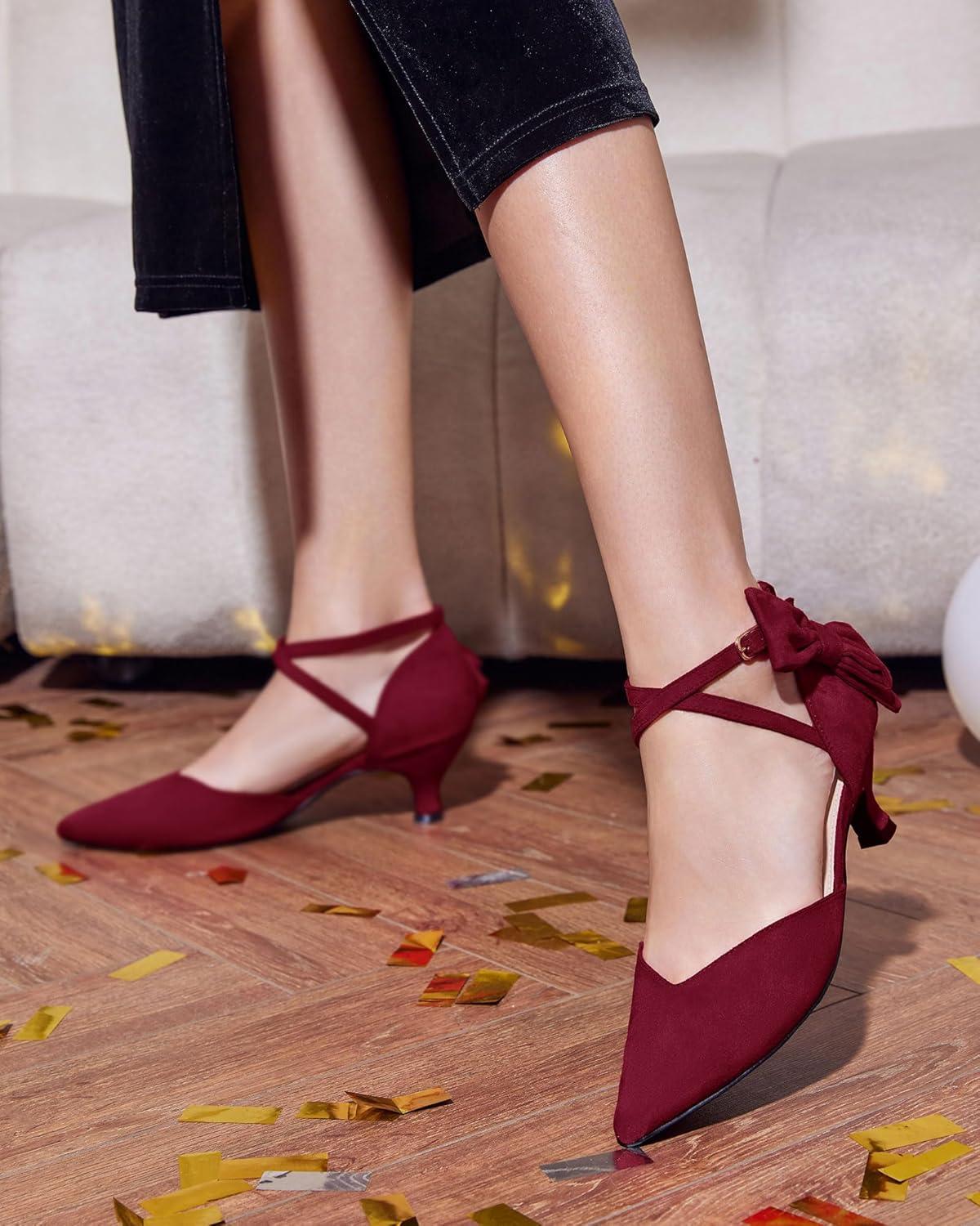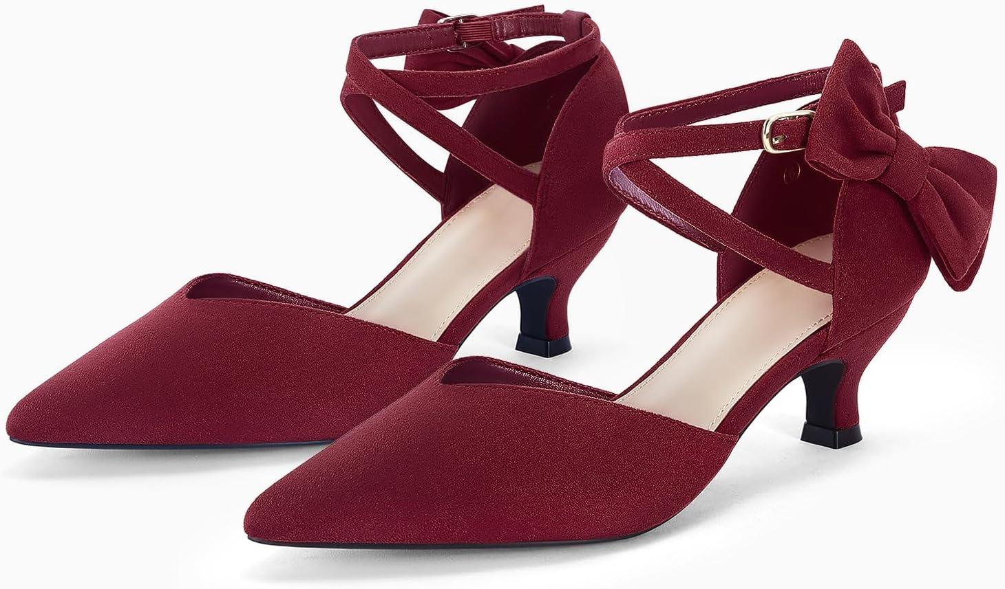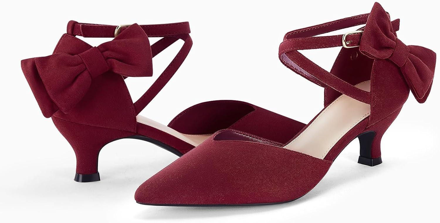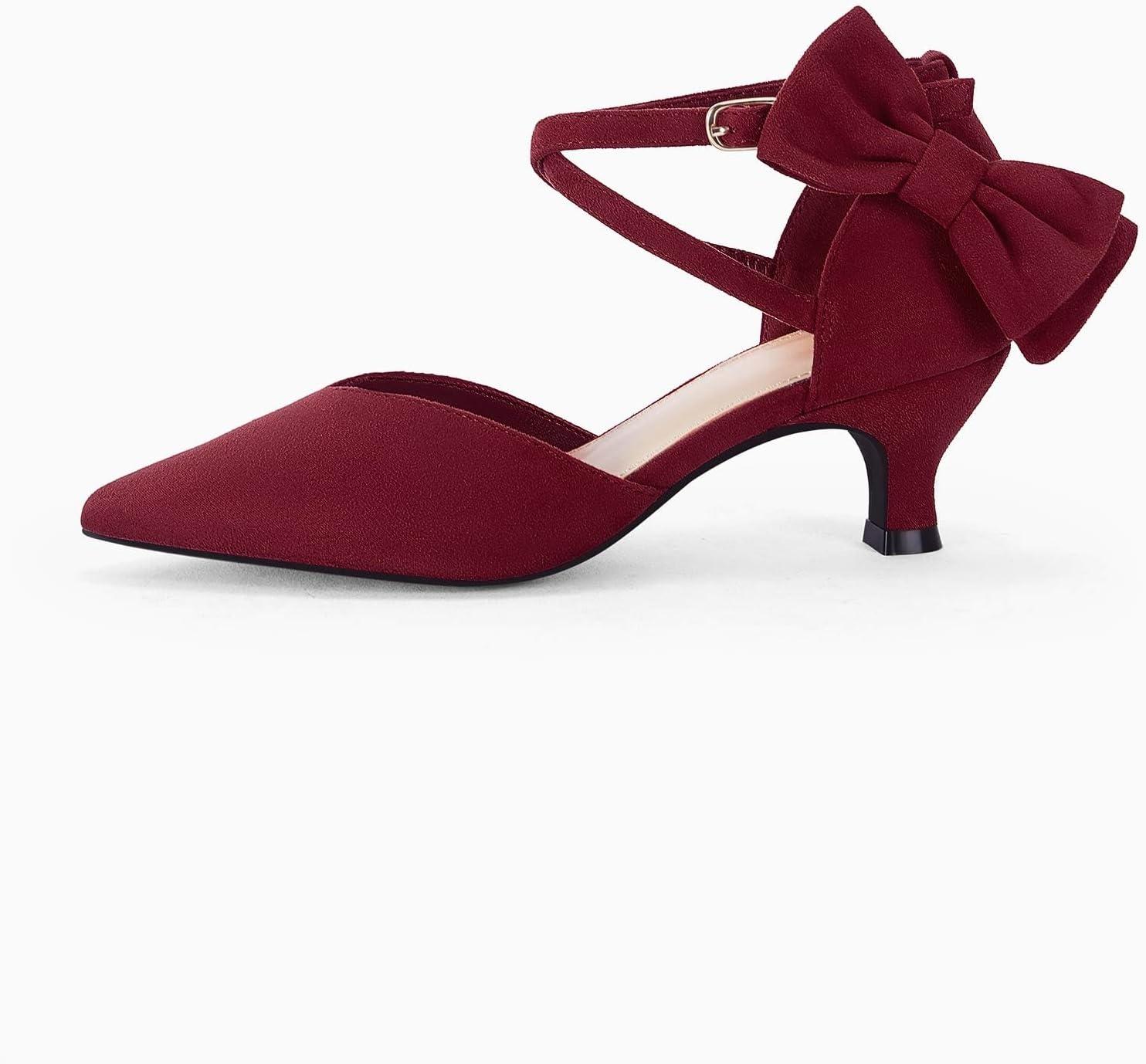 Coutgo Womens Low Kitten Heel Bow Heels Dress Shoes Closed Pointed Toe Ankle Strap Elegant Wedding Party Pumps(Burgundy)