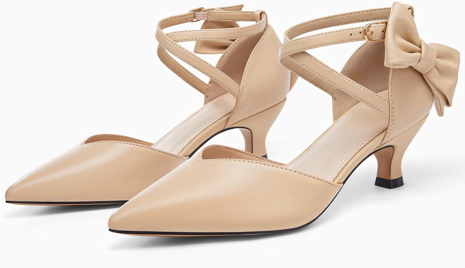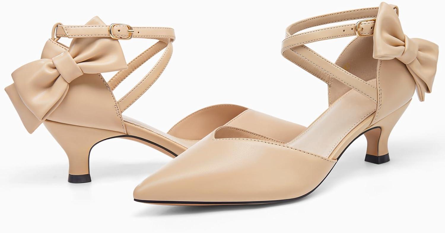 Coutgo Womens Low Kitten Heel Bow Heels Dress Shoes Closed Pointed Toe Ankle Strap Elegant Wedding Party Pumps(Khaki)