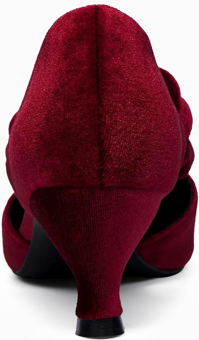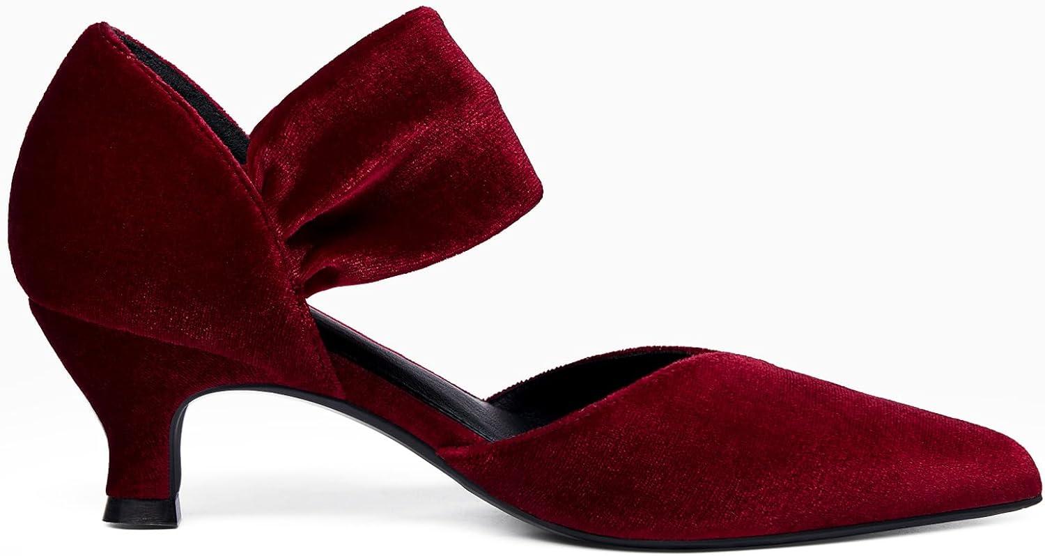 Coutgo Womens Low Kitten Heel Dress Shoes Pointed Toe Slip on Ankle Strap Cutout Elegant Party Wedding Pumps(Velvet Red)
