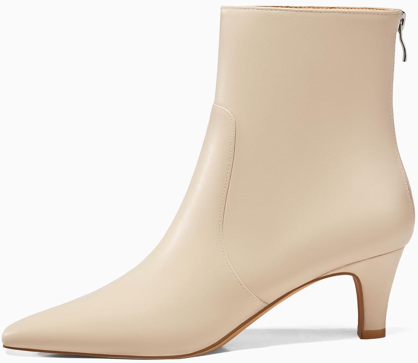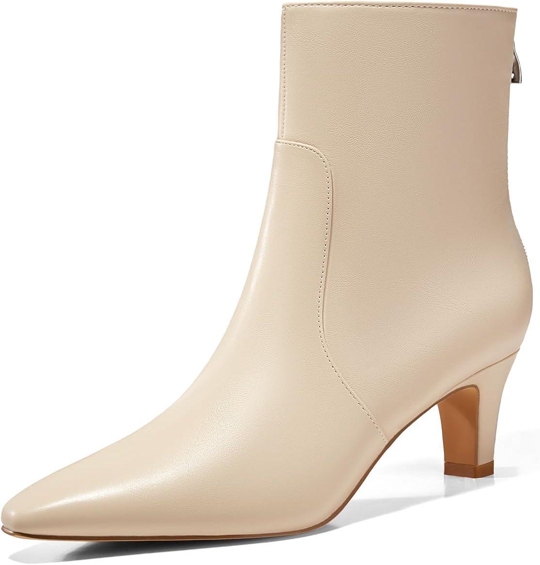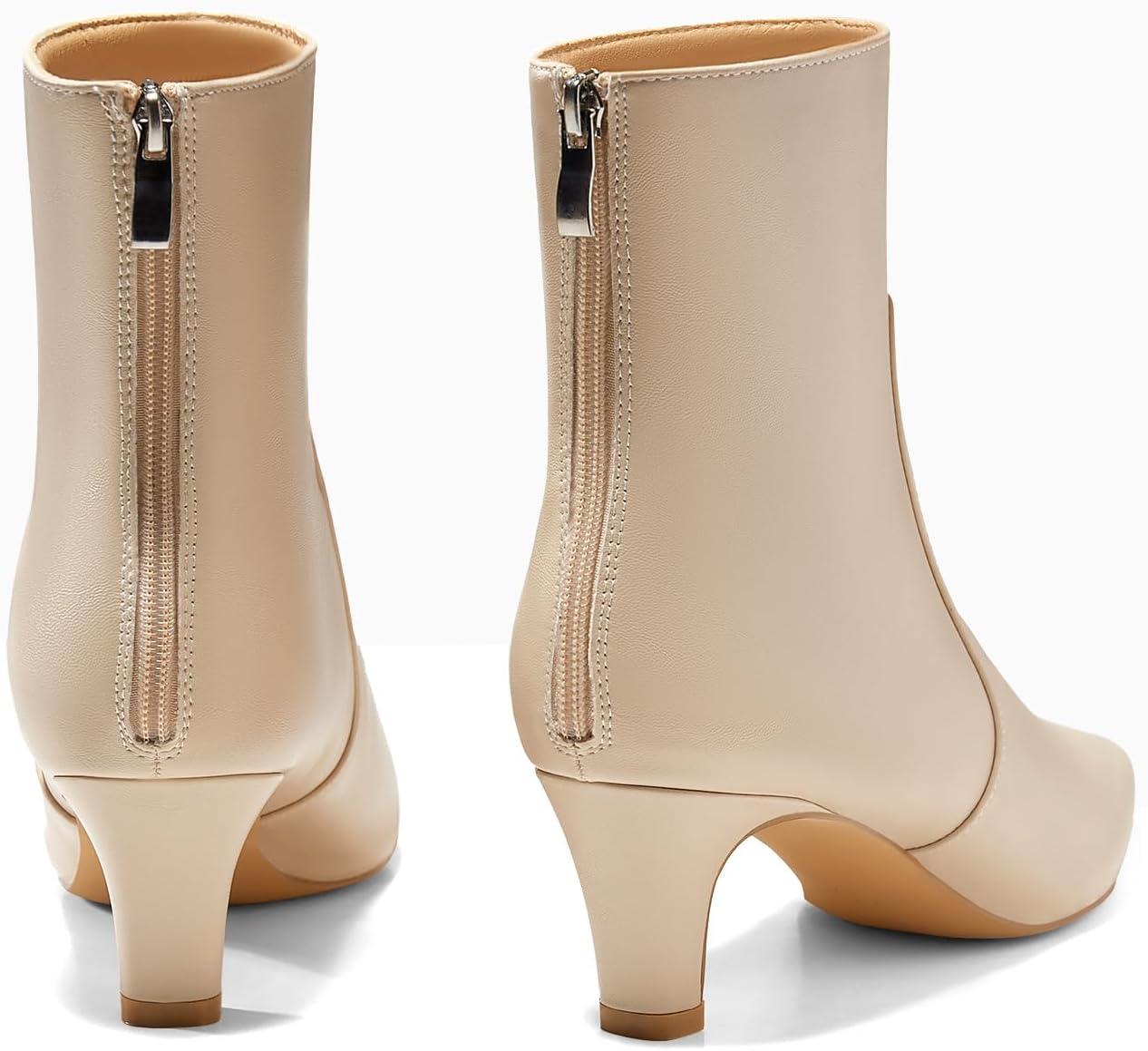 Coutgo Womens Low Kitten Heel Short Boots Fall Square Pointed Toe Ankle Boots Leather Dress Booties With Zipper(Beige)