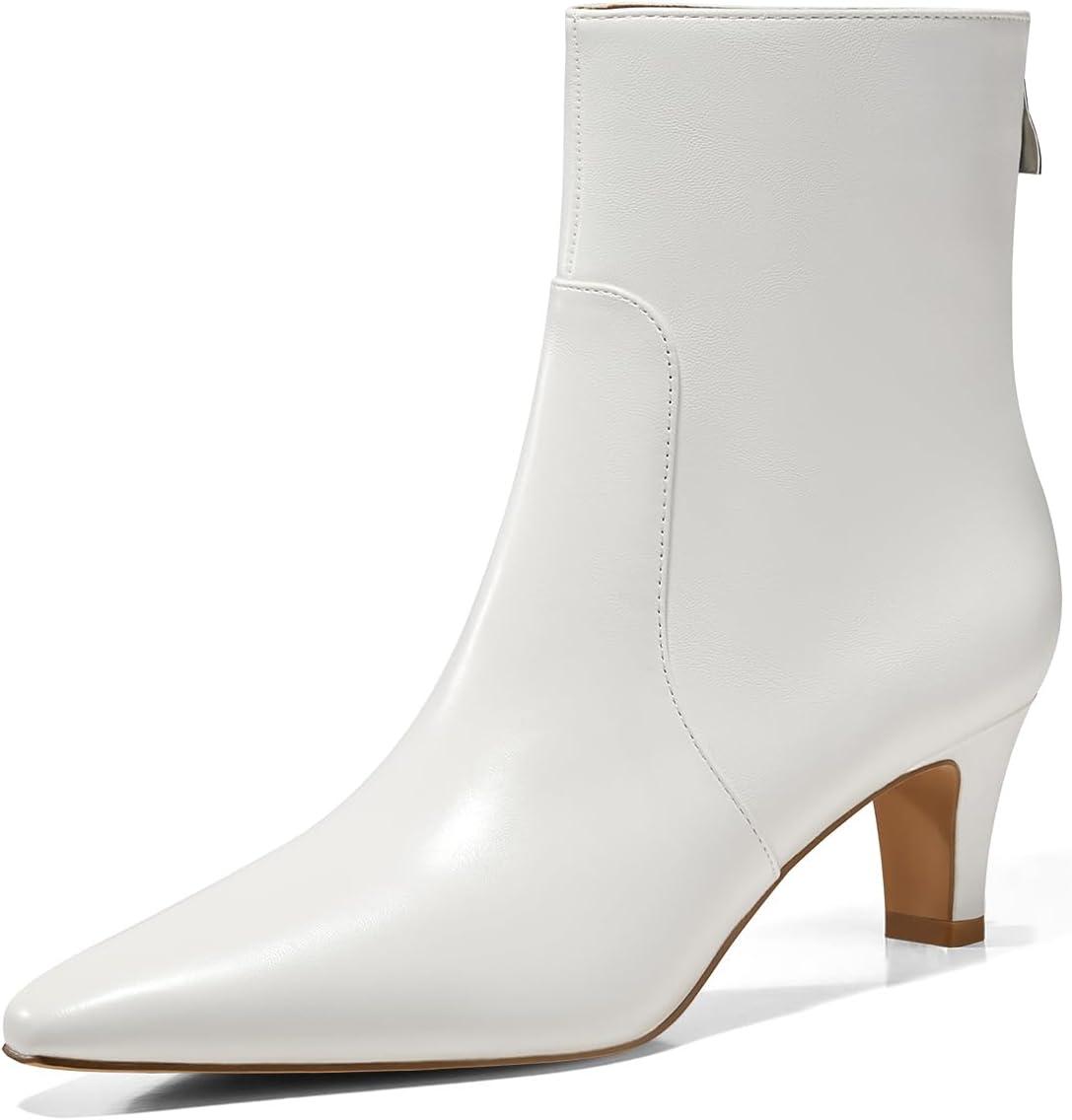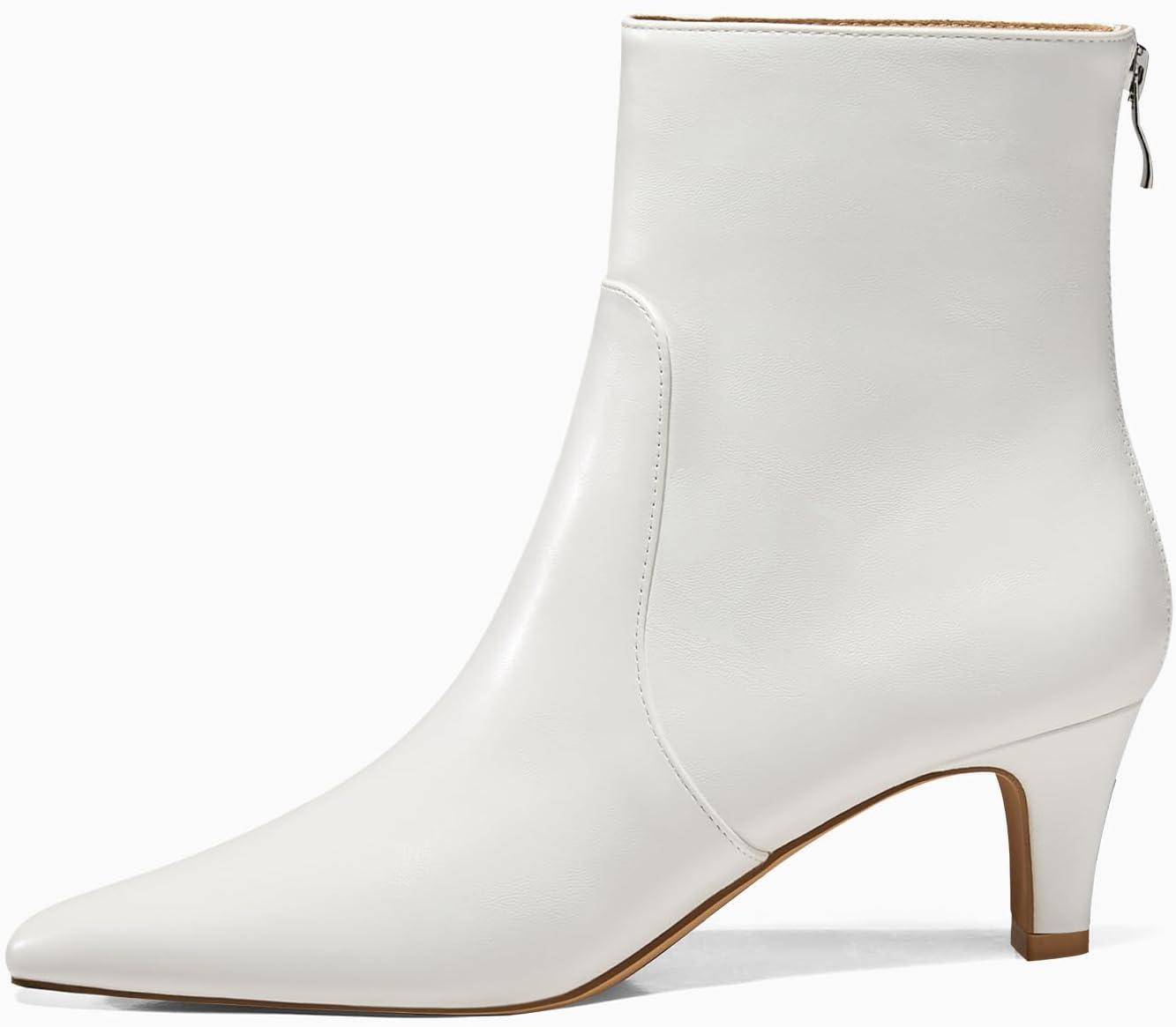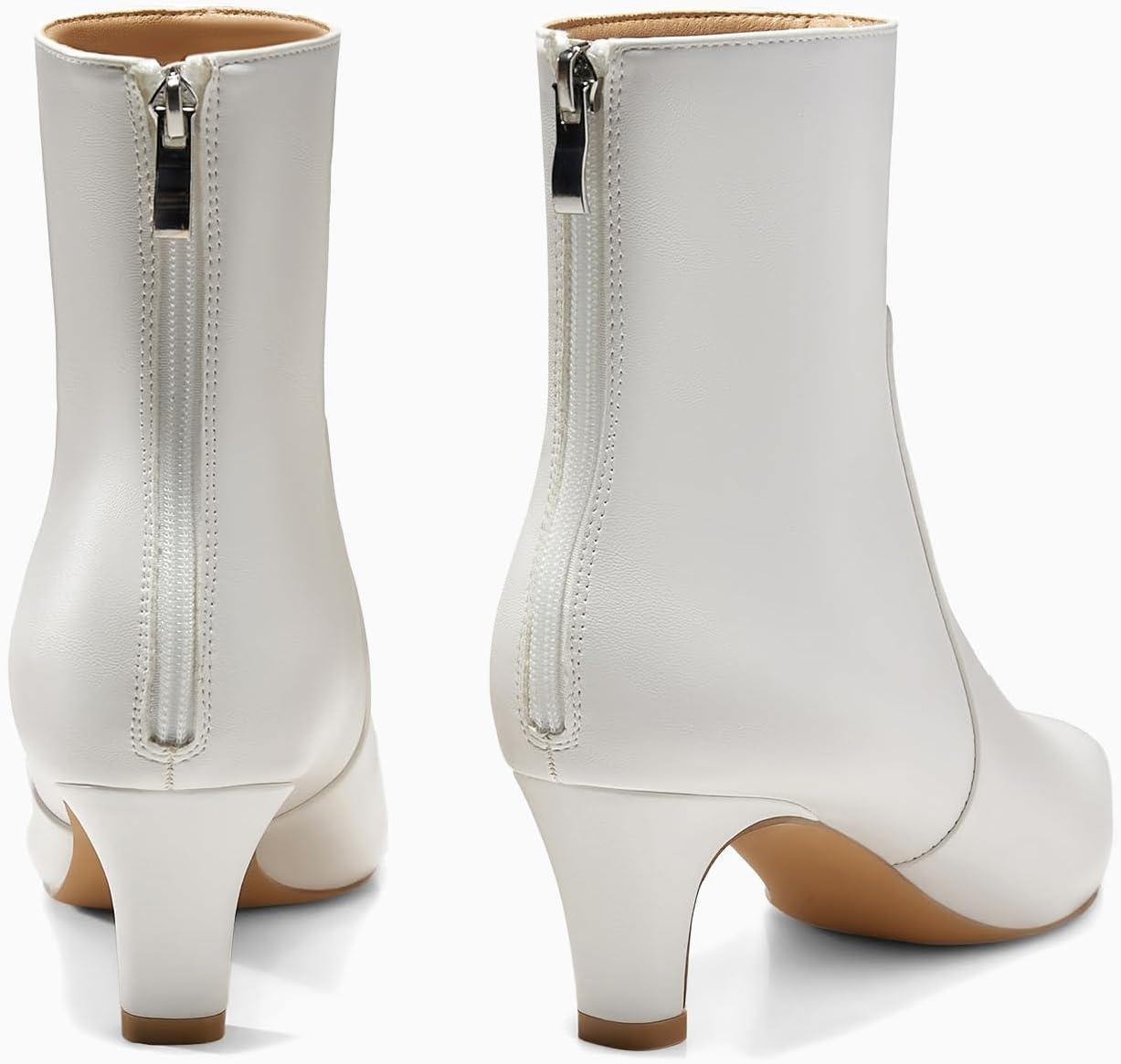 Coutgo Womens Low Kitten Heel Short Boots Fall Square Pointed Toe Ankle Boots Leather Dress Booties With Zipper(White)