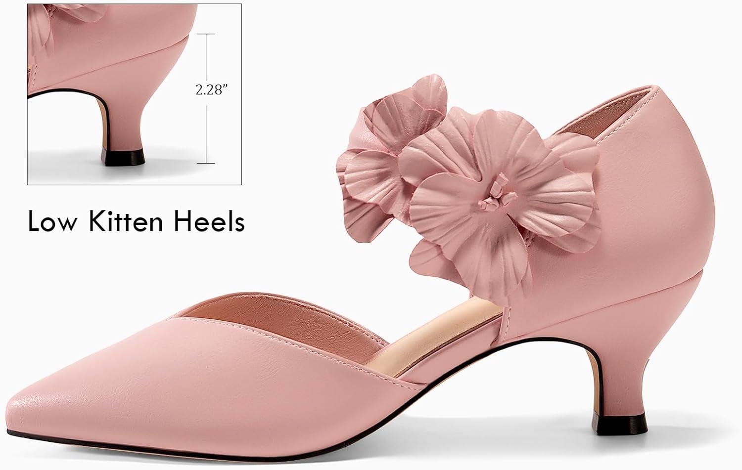 Coutgo Womens Low Kitten Heels Dressy Shoes Comfortable Closed Toe Flower Slip on Formal Party Dance Heeled Pumps(Pink)