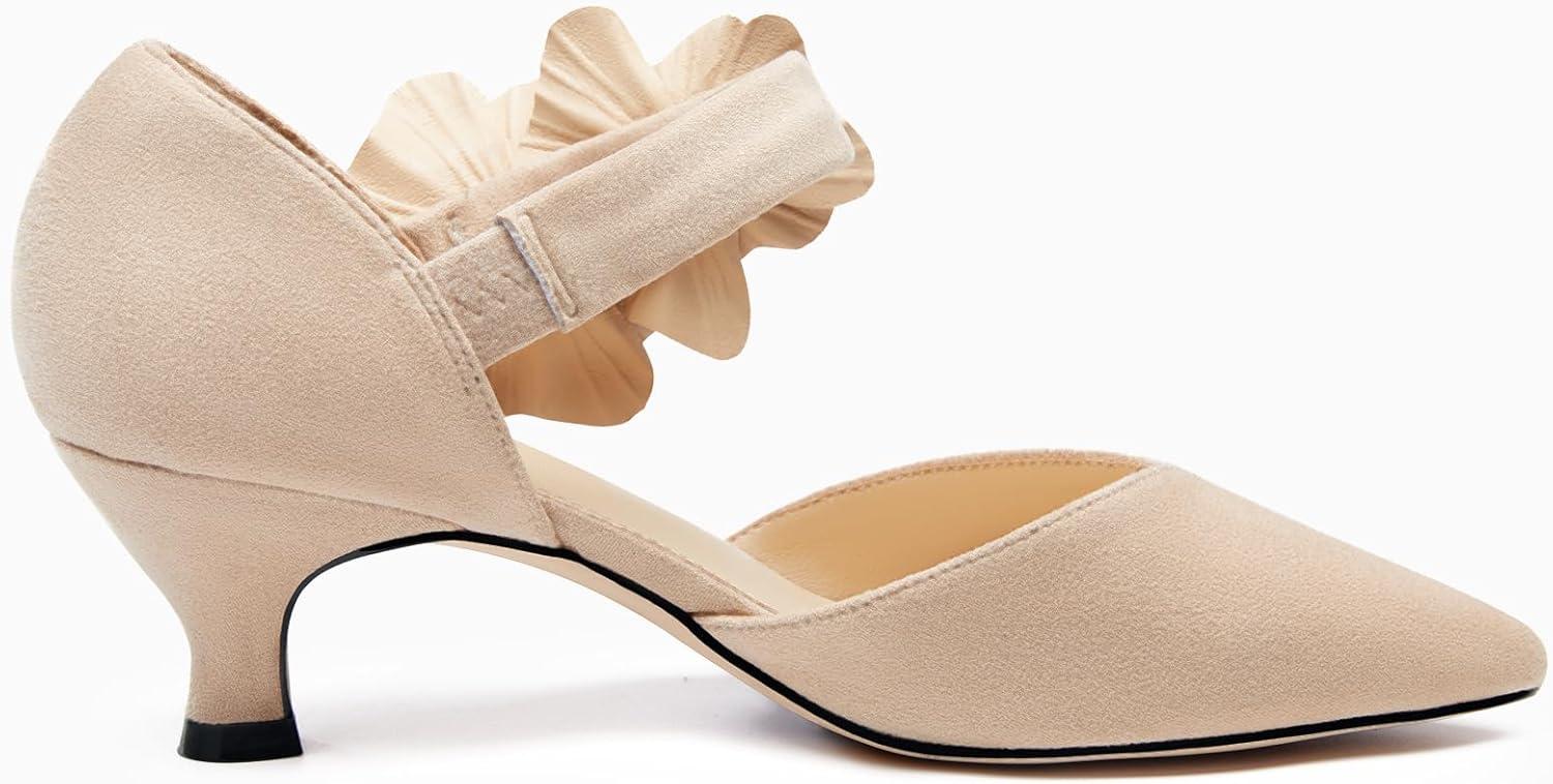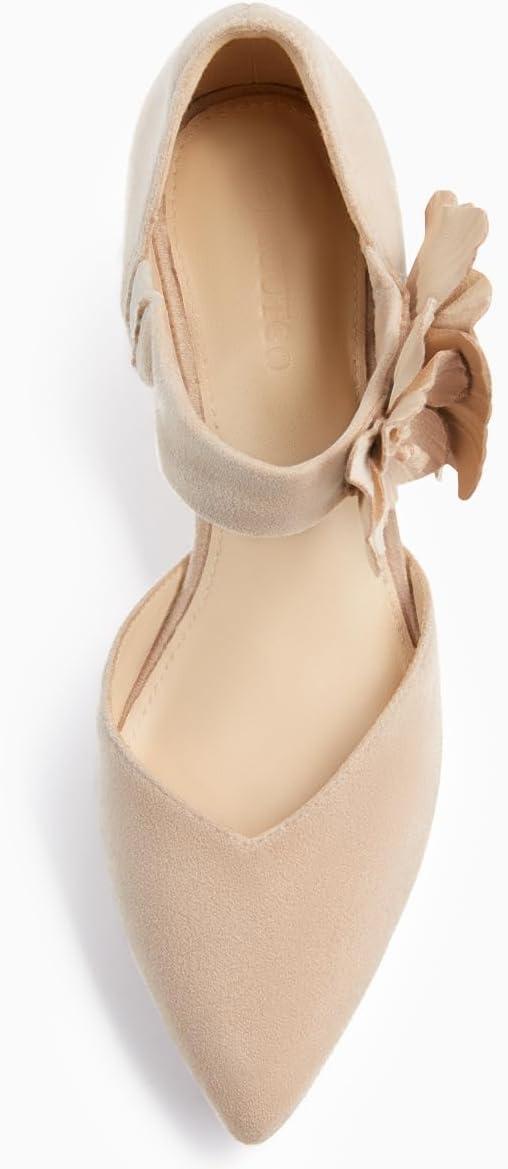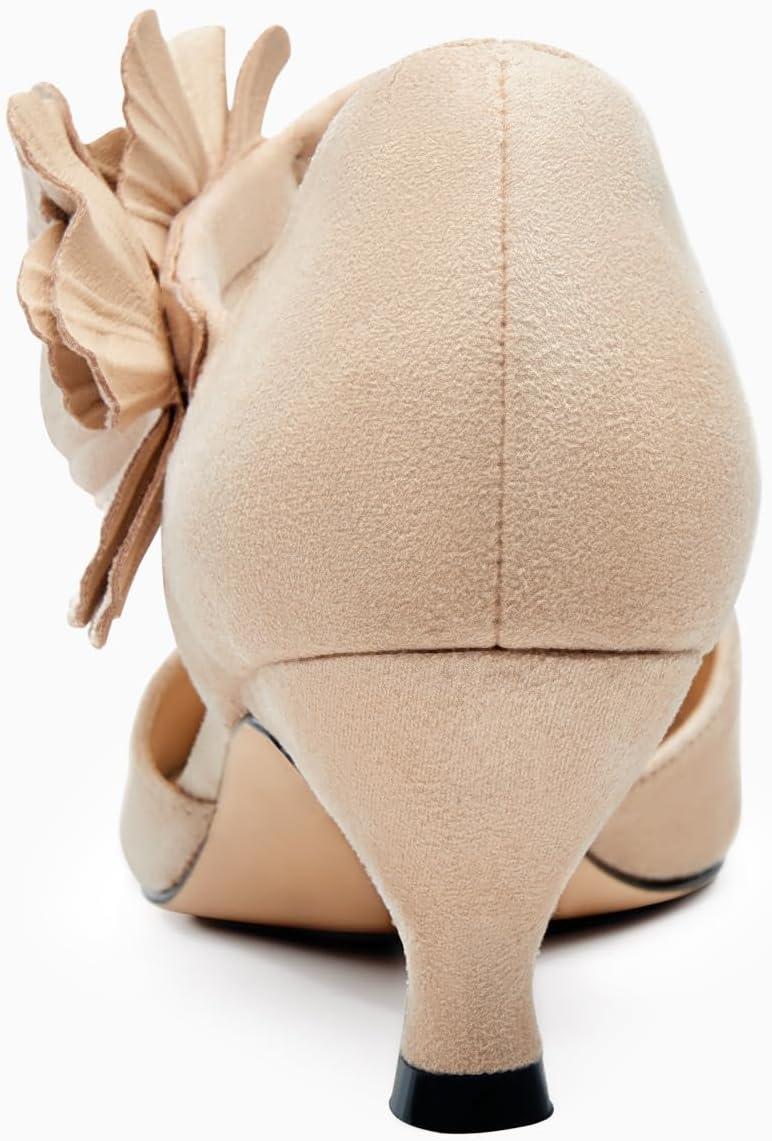 Coutgo Womens Low Kitten Heels Dressy Shoes Comfortable Closed Toe Flower Slip on Formal Party Dance Heeled Pumps(Suede Nude)