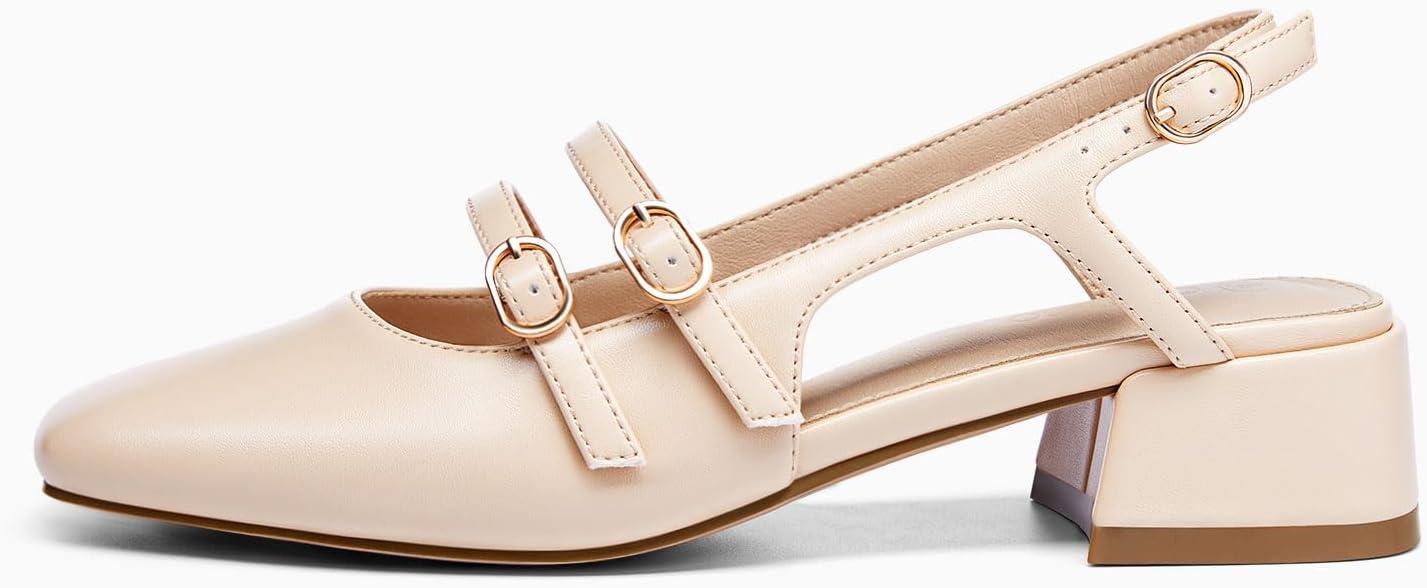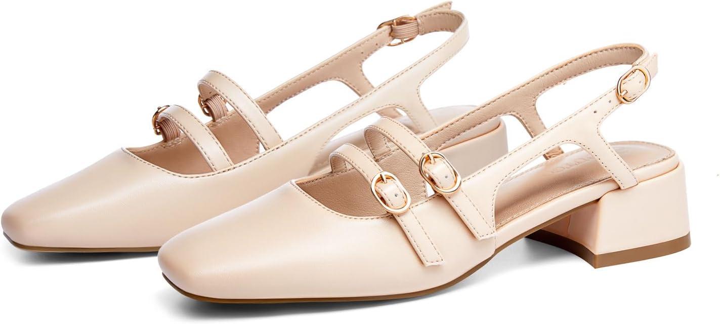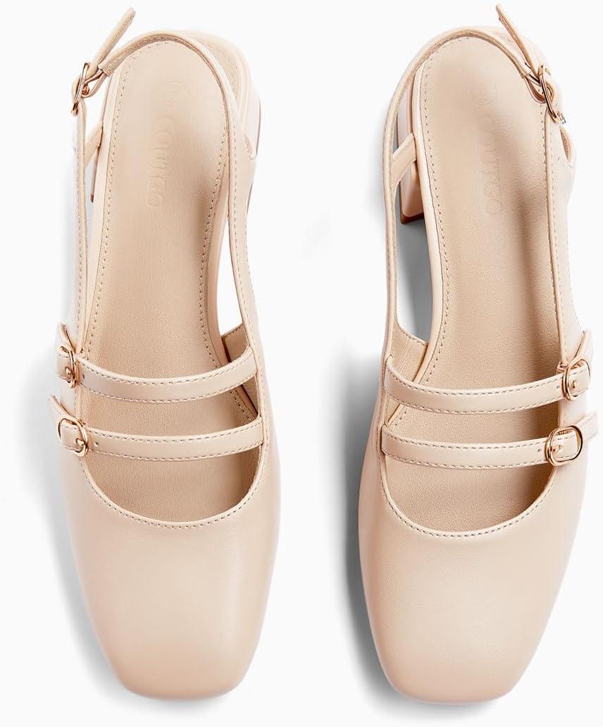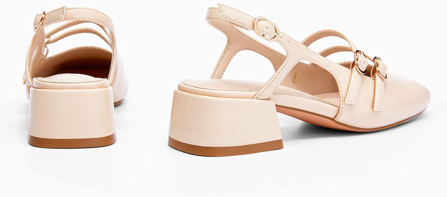 Coutgo Womens Mary Jane Chunky Low Heels Slingback Pumps Closed Square Toe Wedding Dress Shoes(Light Khaki Pu)