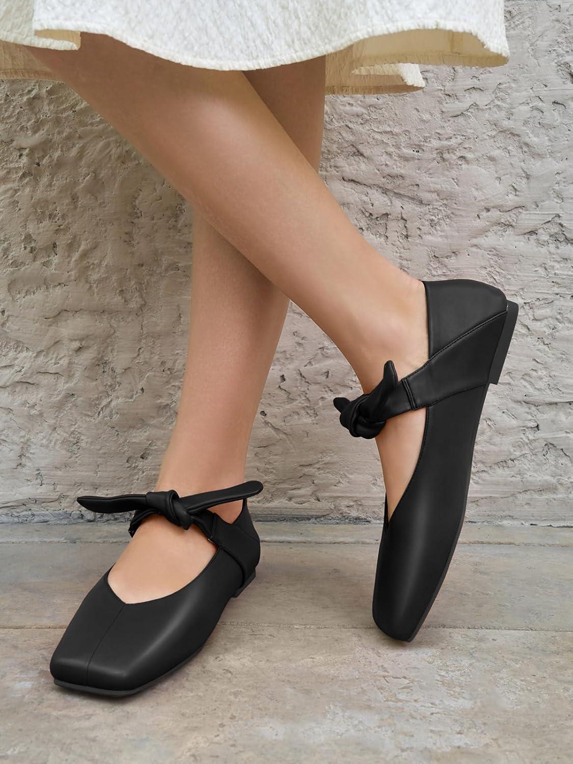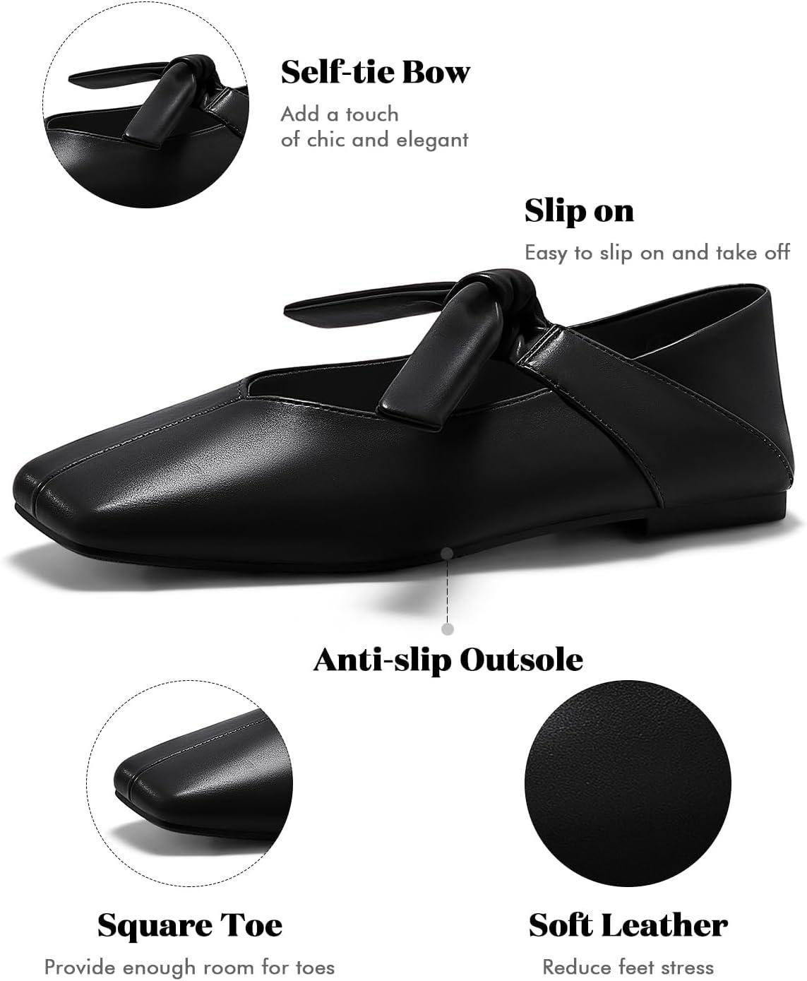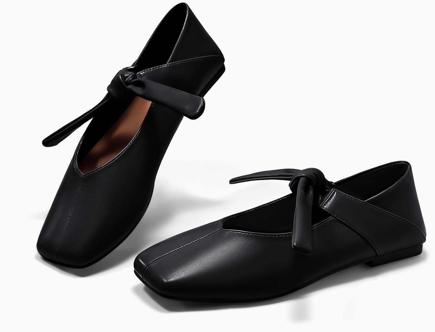 Coutgo Womens Mary Jane Flats Bow Square Toe Ballet Flats Dressy Comfortable Slip on Flat Shoes(Black)