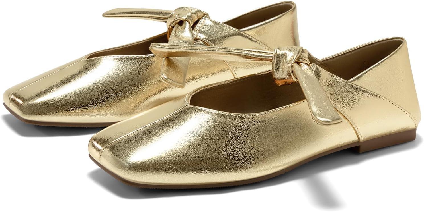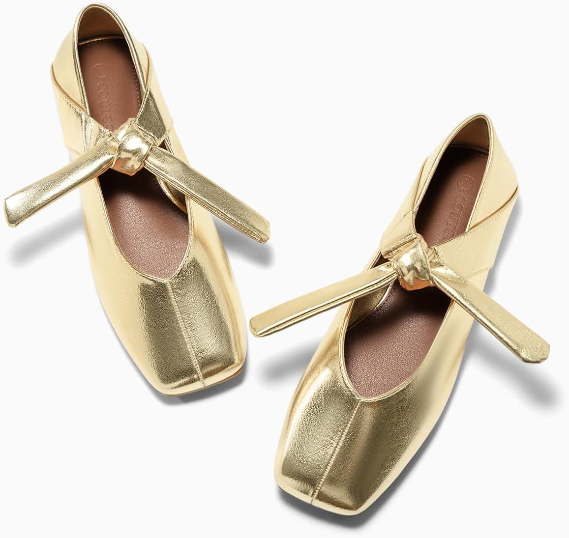 Coutgo Womens Mary Jane Flats Bow Square Toe Ballet Flats Dressy Comfortable Slip on Flat Shoes(Gold)
