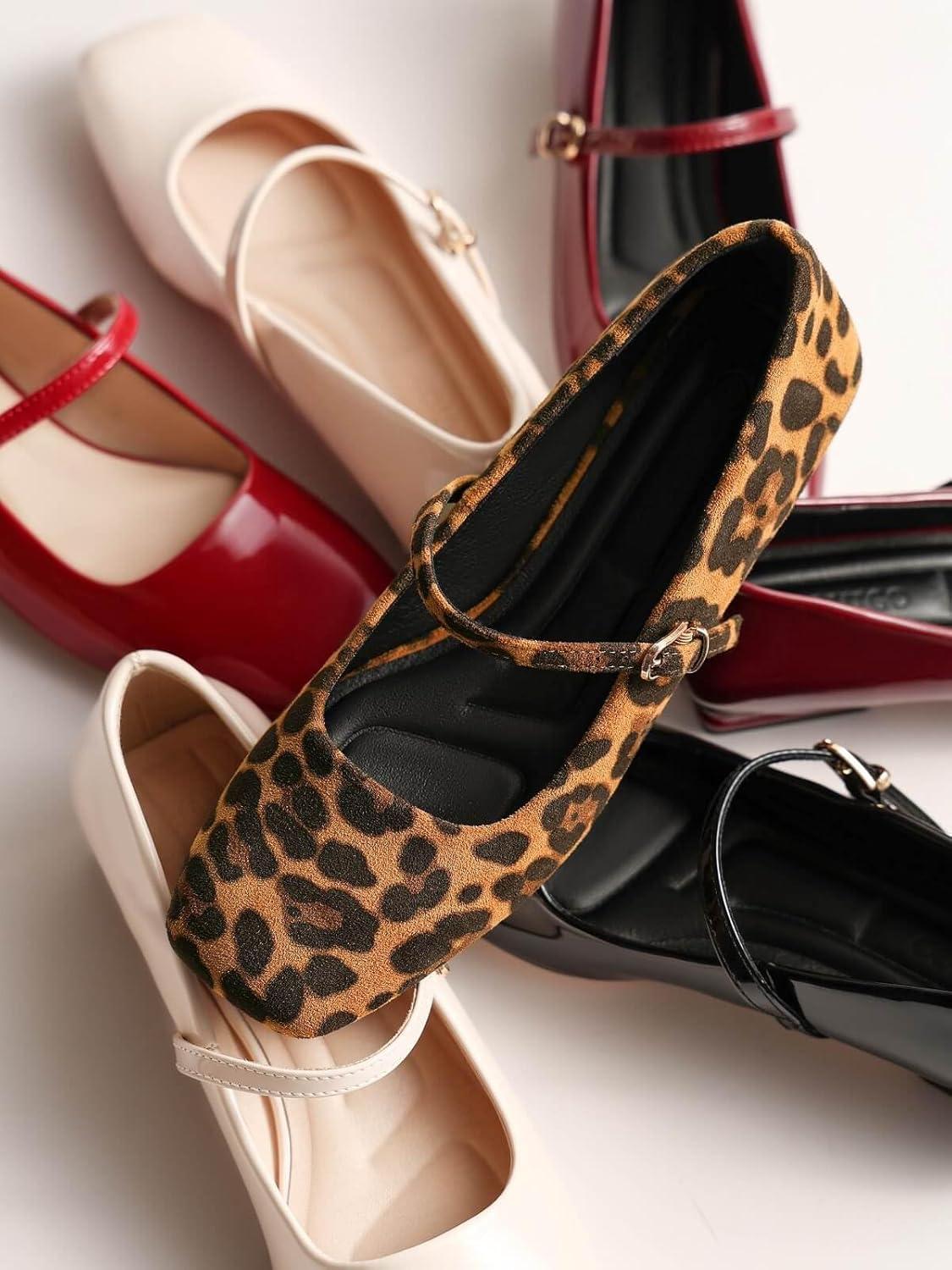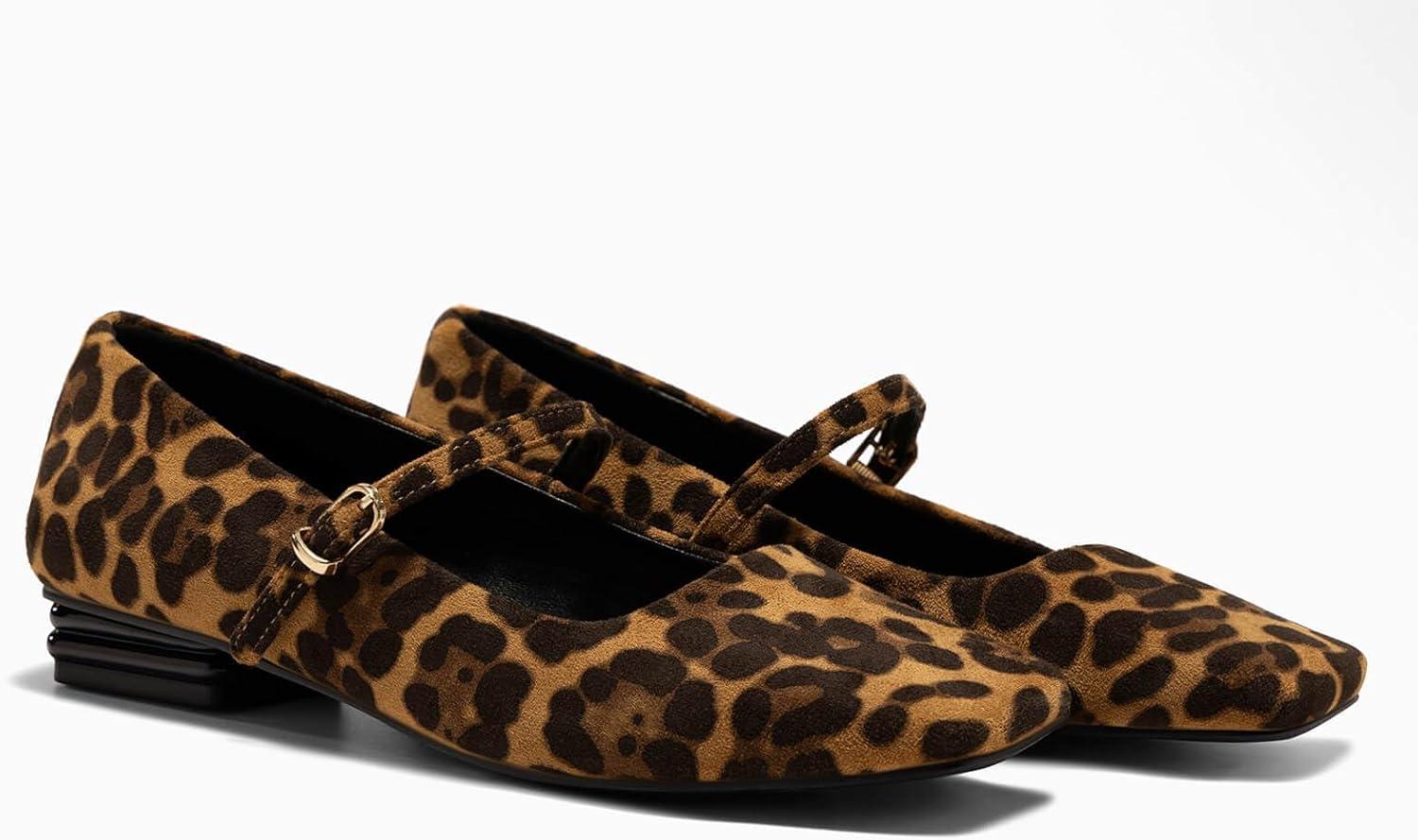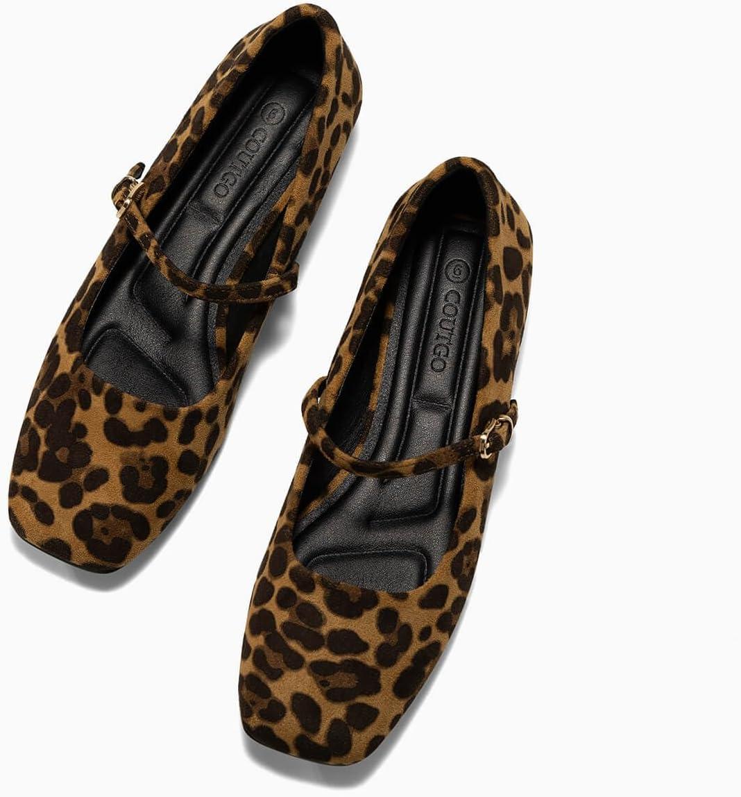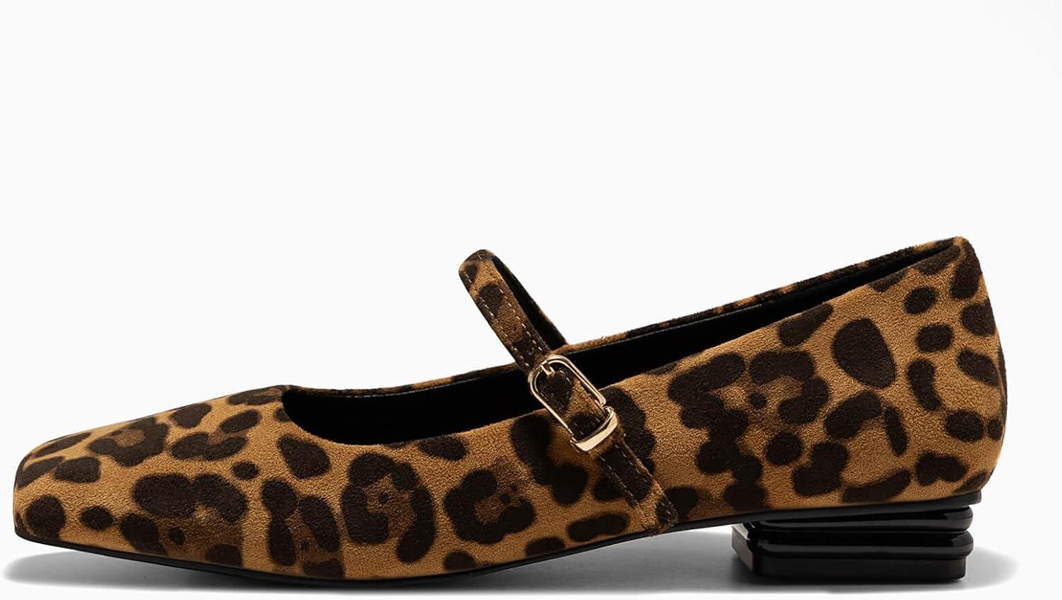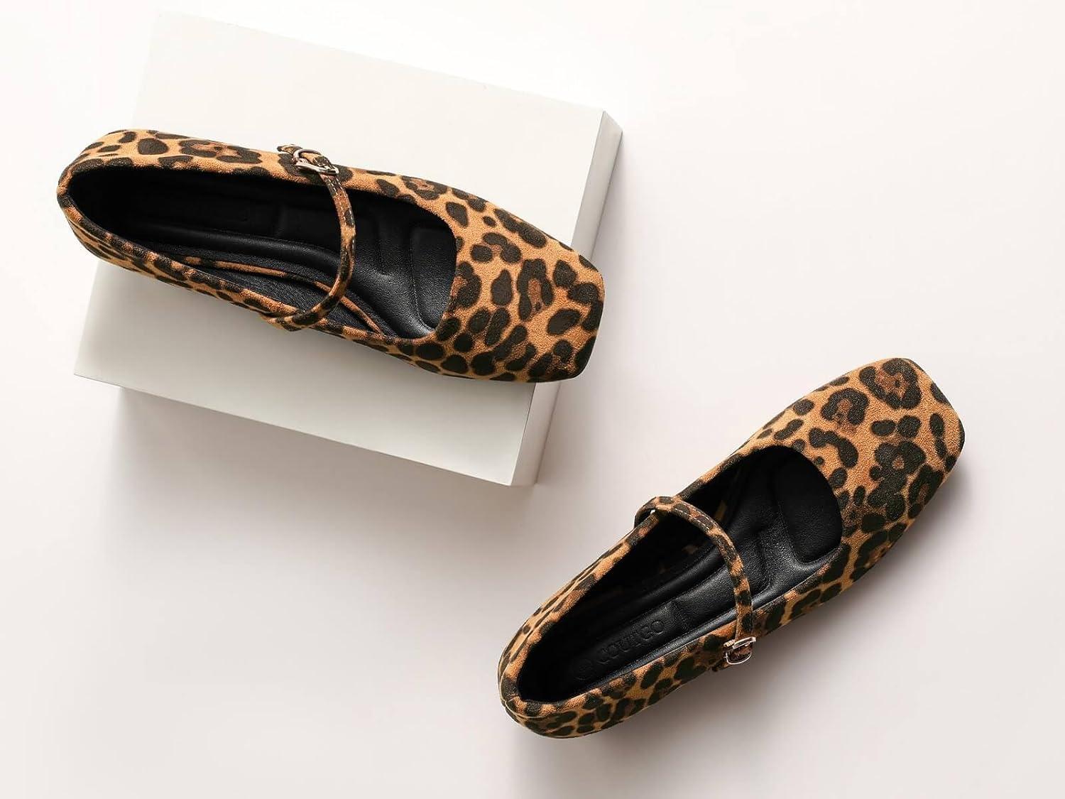 Coutgo Women’s Mary Jane Flats Closed Square Toe Ballet Flat Dressy Comfortable Slip on Shoes(Leopard)