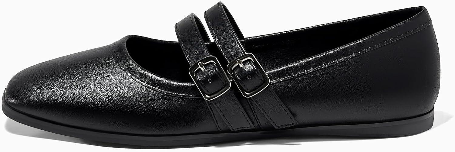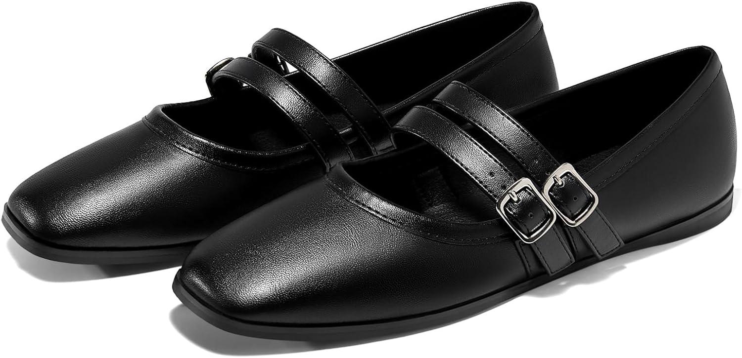 Coutgo Womens Mary Jane Flats Shoes Dressy Comfortable Square Toe Double Strap Soft Work Slip on Ballet Flat(Black)